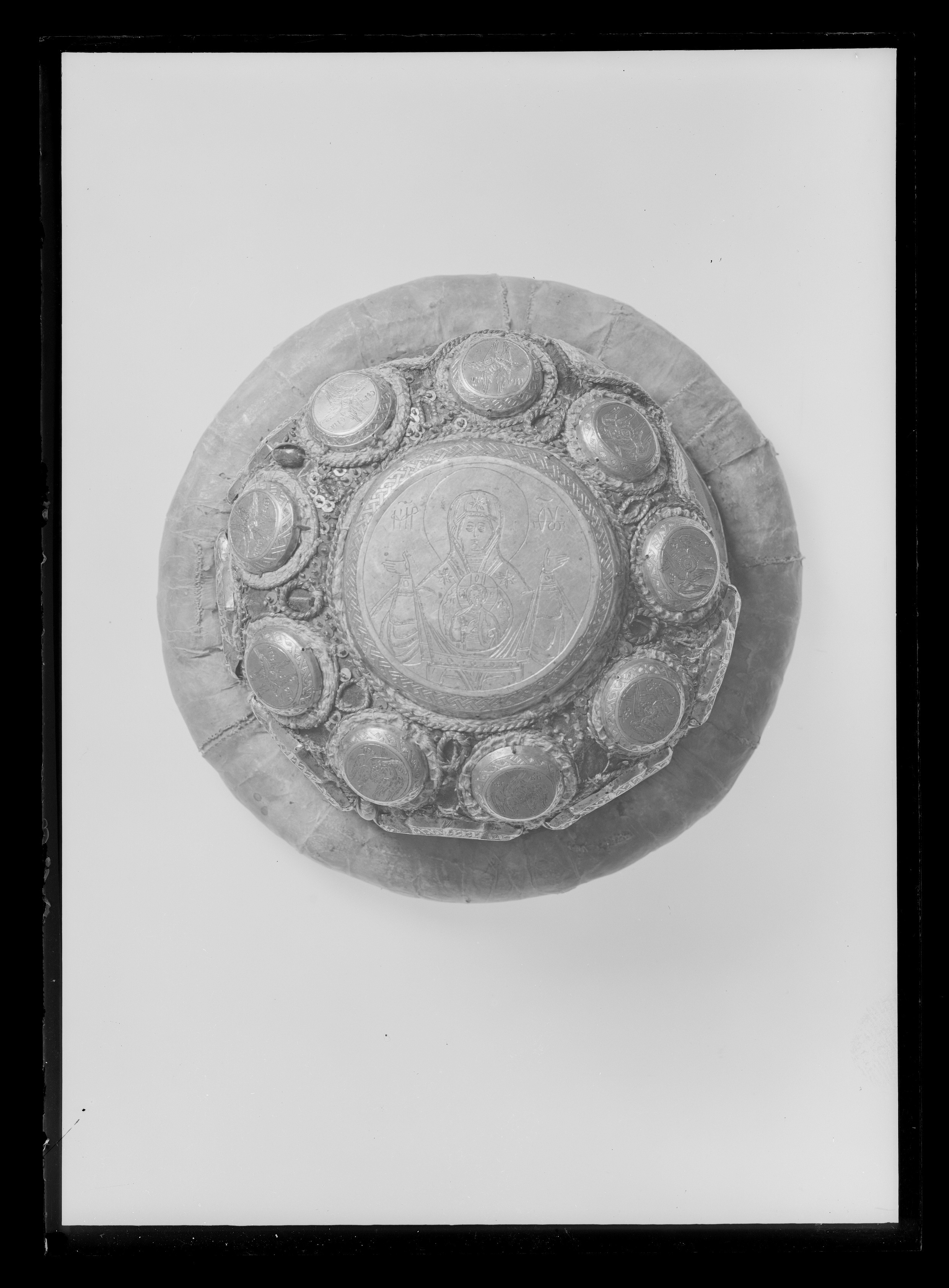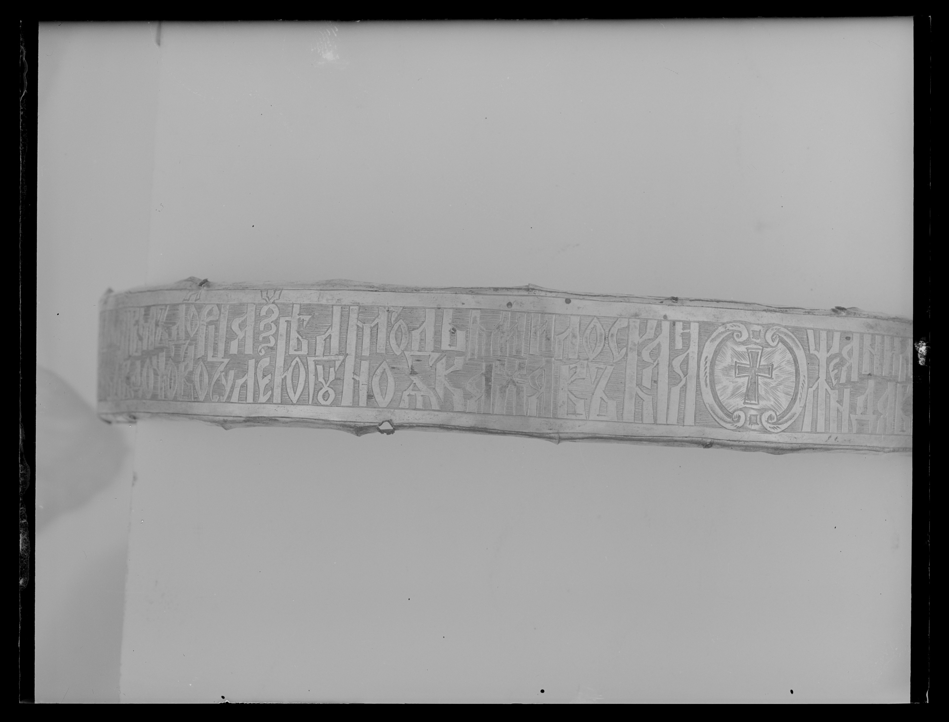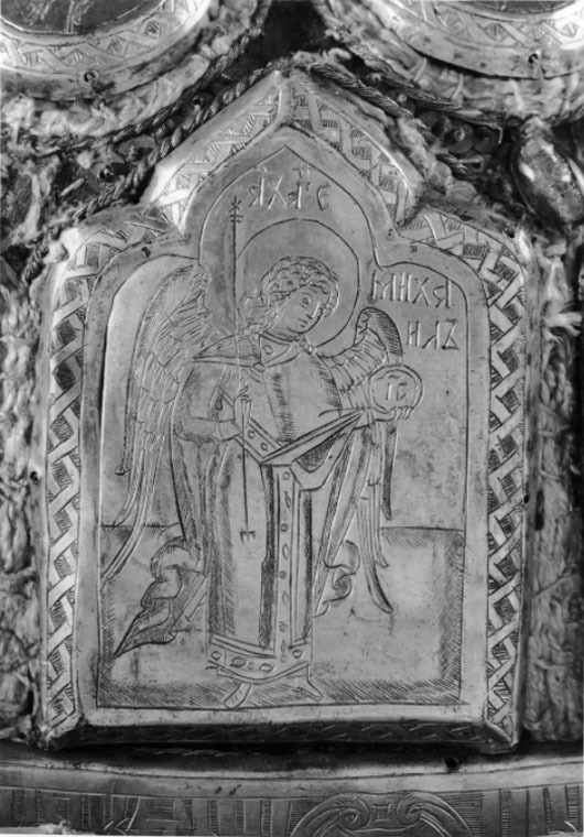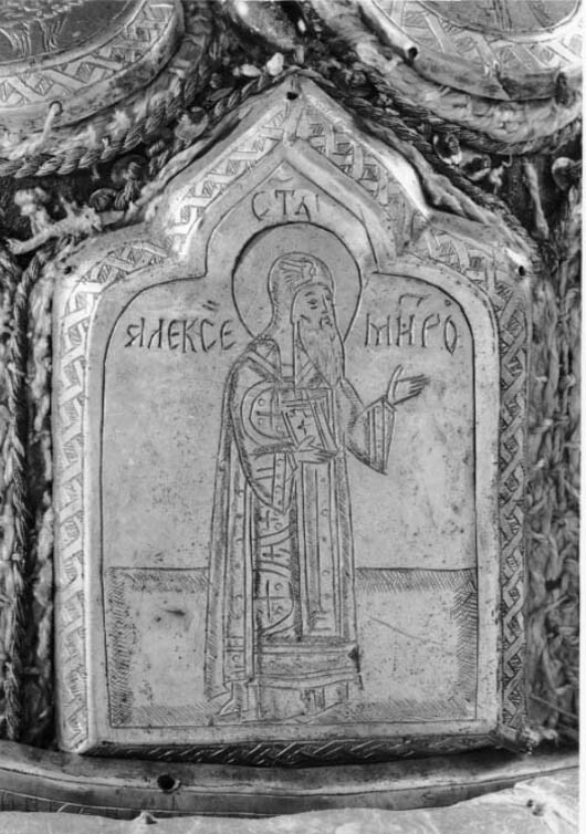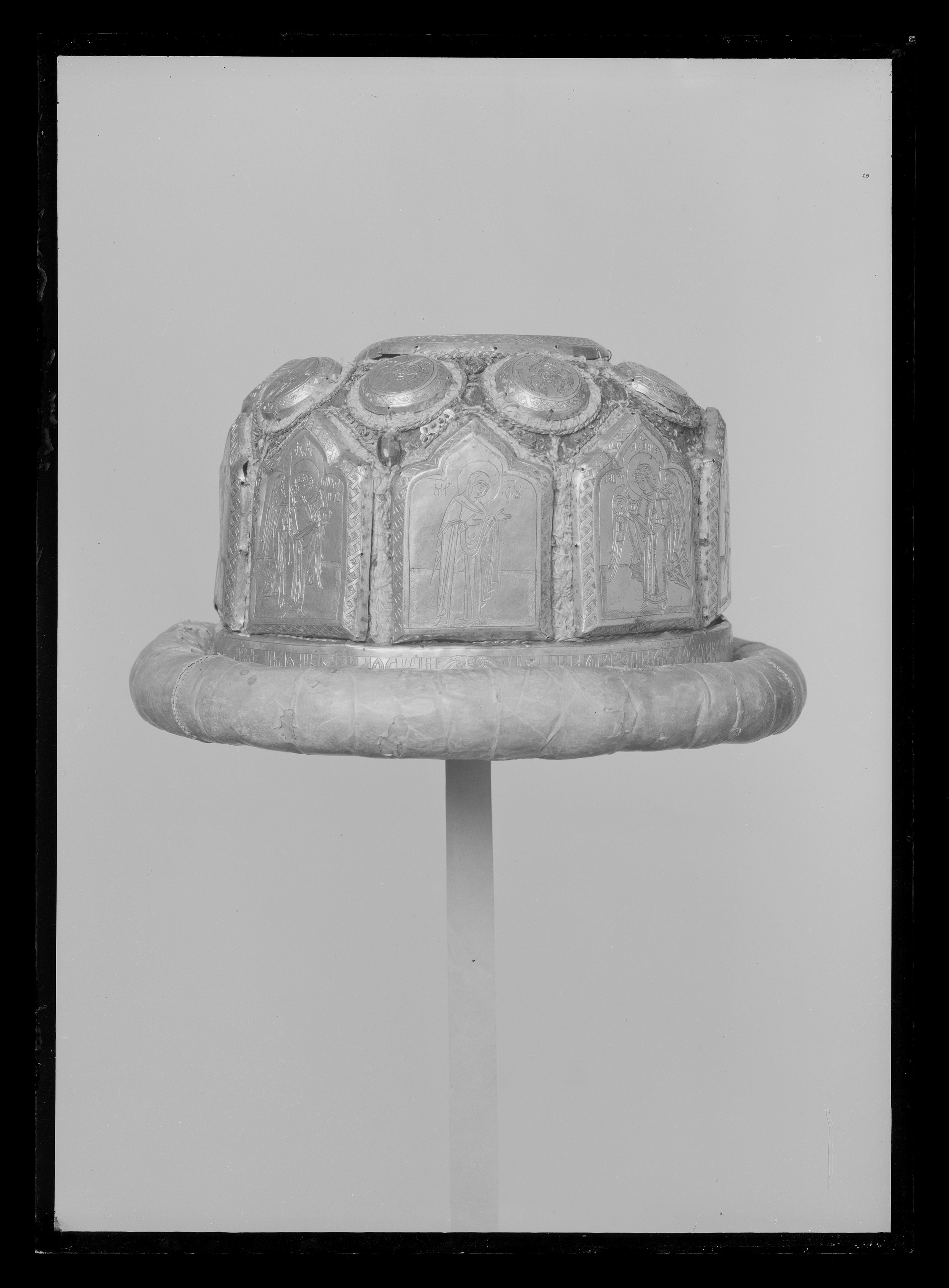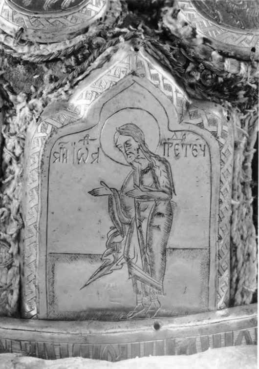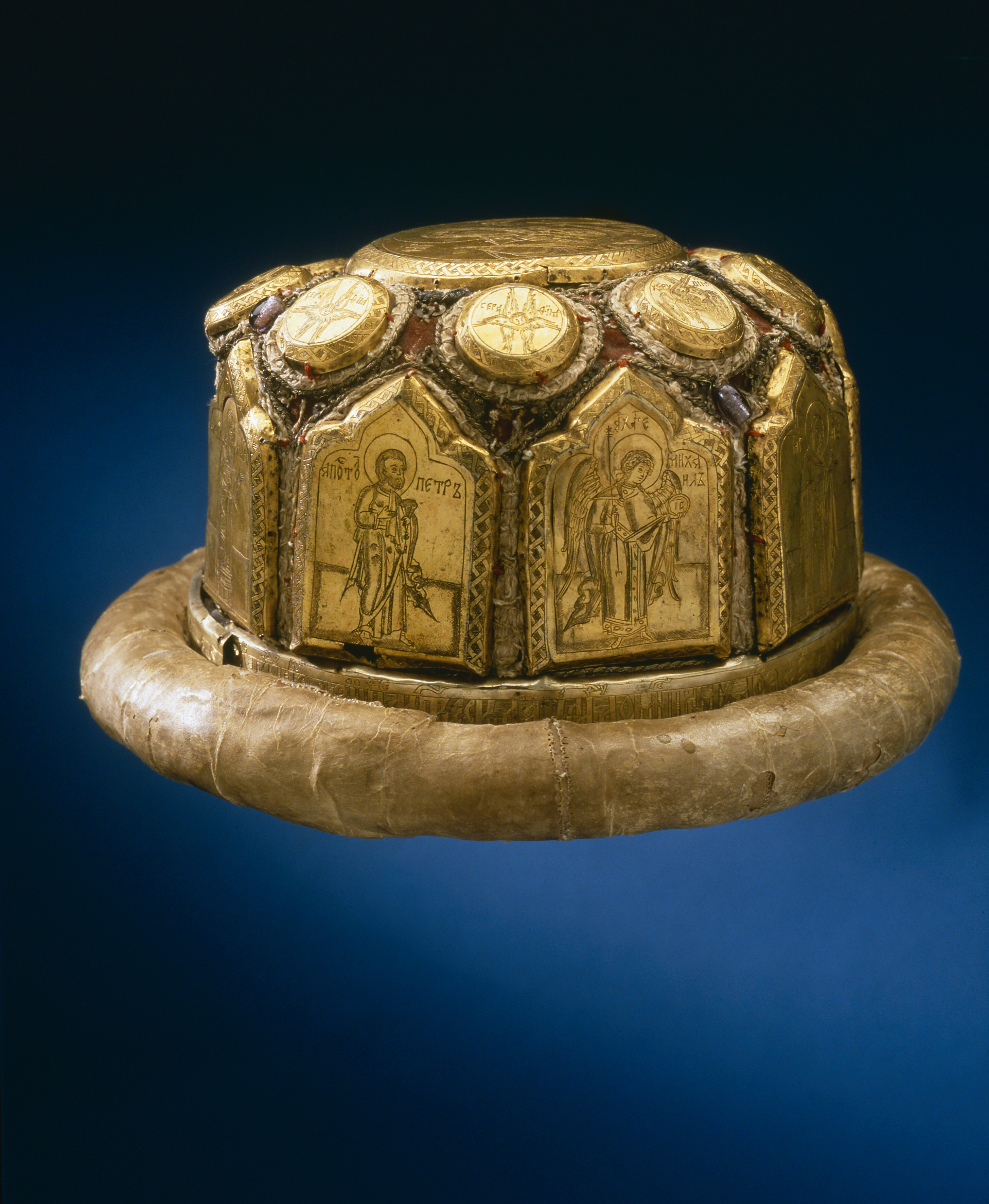 Krigsbyte från Narva, 1700. Mitra av hattformig modell med cylindrisk kulle med svagt rundad kant. Vulstformigt brätte, b: ca 30 mm, klätt med pergament (ursprungligen med skinn?). Kullen klädd med delvis mycket slitet, karminrött siden, nertill vid brättet ring av förgylld silverplåt, b: 30 mm med graverad, gammalslavisk text (översättning se Bodin Per-Arne, "Kejsarkrona och törnekrona", tidskr. Livrustkammarne 15:12, Stockholm 1981): År (7)159 november, 17 dagen gav statssekreteraren Michail Danilovs hustru, änkan Uljana, dotter till Vasilij, denna biskopsmössa till Tjudovklostret, till den undergörande Aleksijs hem, till minne av sin make Michail Danilovitj, eremitmunken Misail och sin dotter Ksenia för sin själ Därovanför en krans med sex, ursprungligen nio helgonbilder, graverade på rektangulära plåtar med trepassformig överdel, mellersta bågen spetsig, h: 83 mm, b:58 mm, gammalslaviska texter: 1 - ett manligt helgon med otydlig text "pete.."; 2 - ärkeängeln Gabriel: "achange gabri"; 3 - Maria: "mrthy" (mätär Theo - Guds moder); 4 - ärkeängeln Mikael: "achage michail"; 5 - evengelisten Petrus: "apoto petr"; 6 - helgon i biskopsdräkt: "st.alekse miro". På kullens översida en krans med nio runda plåtar med serafer och keruber, fyra stycken med text: "serafim", fem med "cherubi". Mitt på kullen en stor, rund plåt, d: 102,5 mm med Maria och Jesusbarnet, text:"mrthy" (Guds Moder". Runt plåtarna broderier med silke, silvertråd och -paljetter, två ovala, genomborrade glaspärlor bevarade. Hatten invändigt stoppad och klädd med blekrött siden.