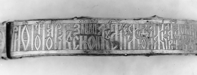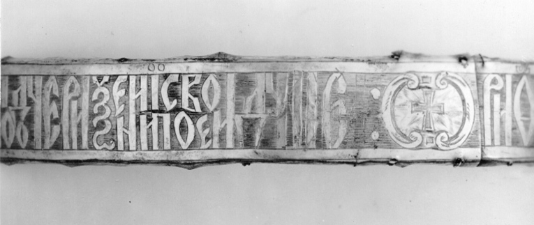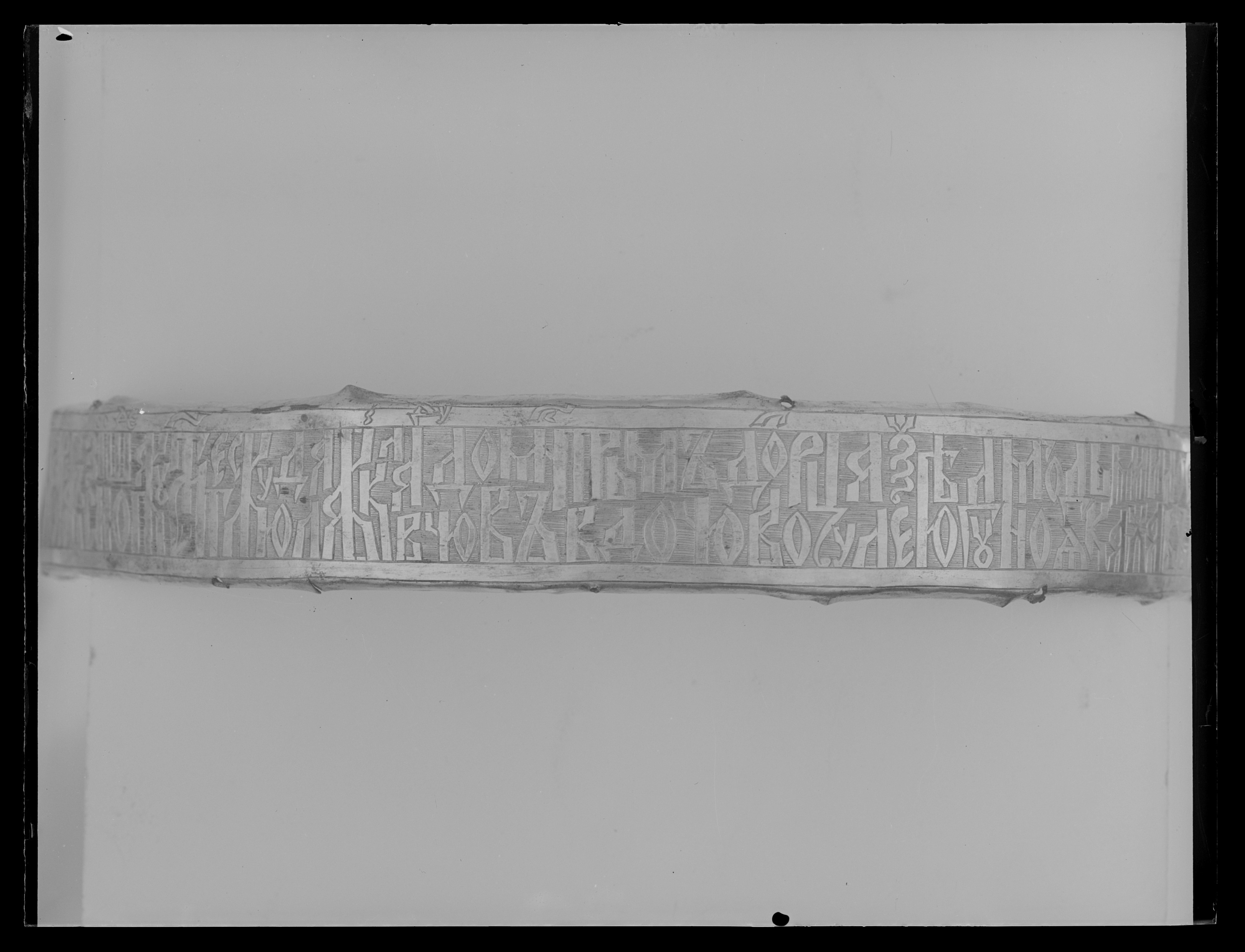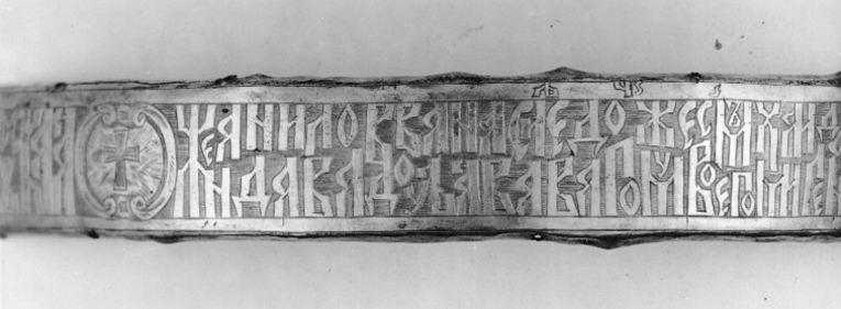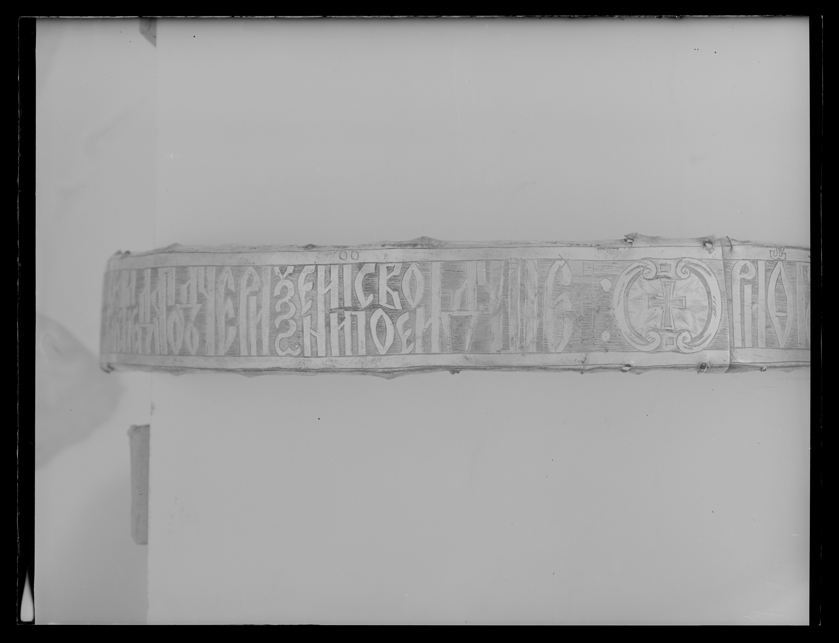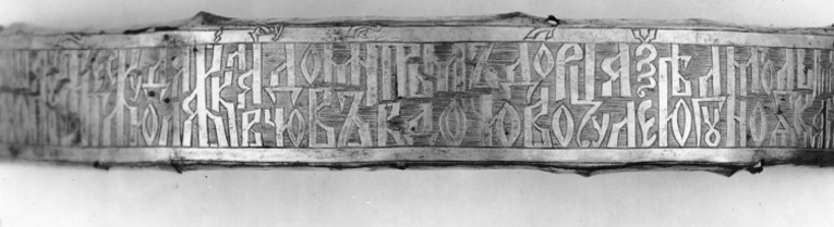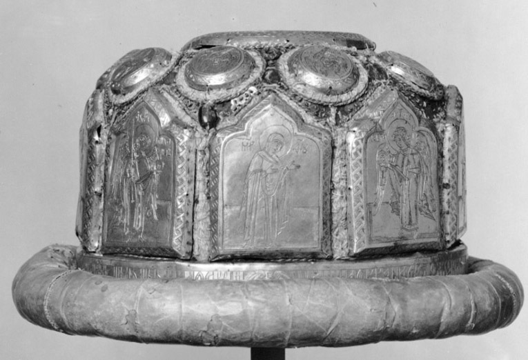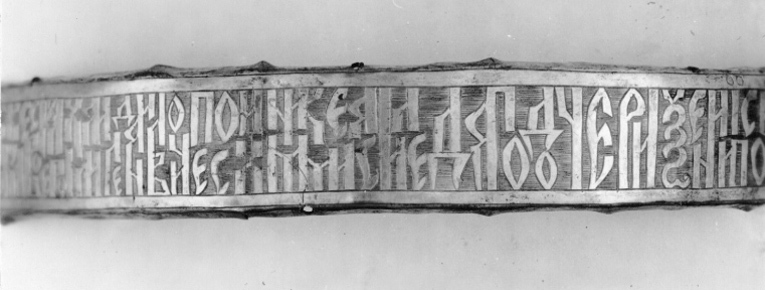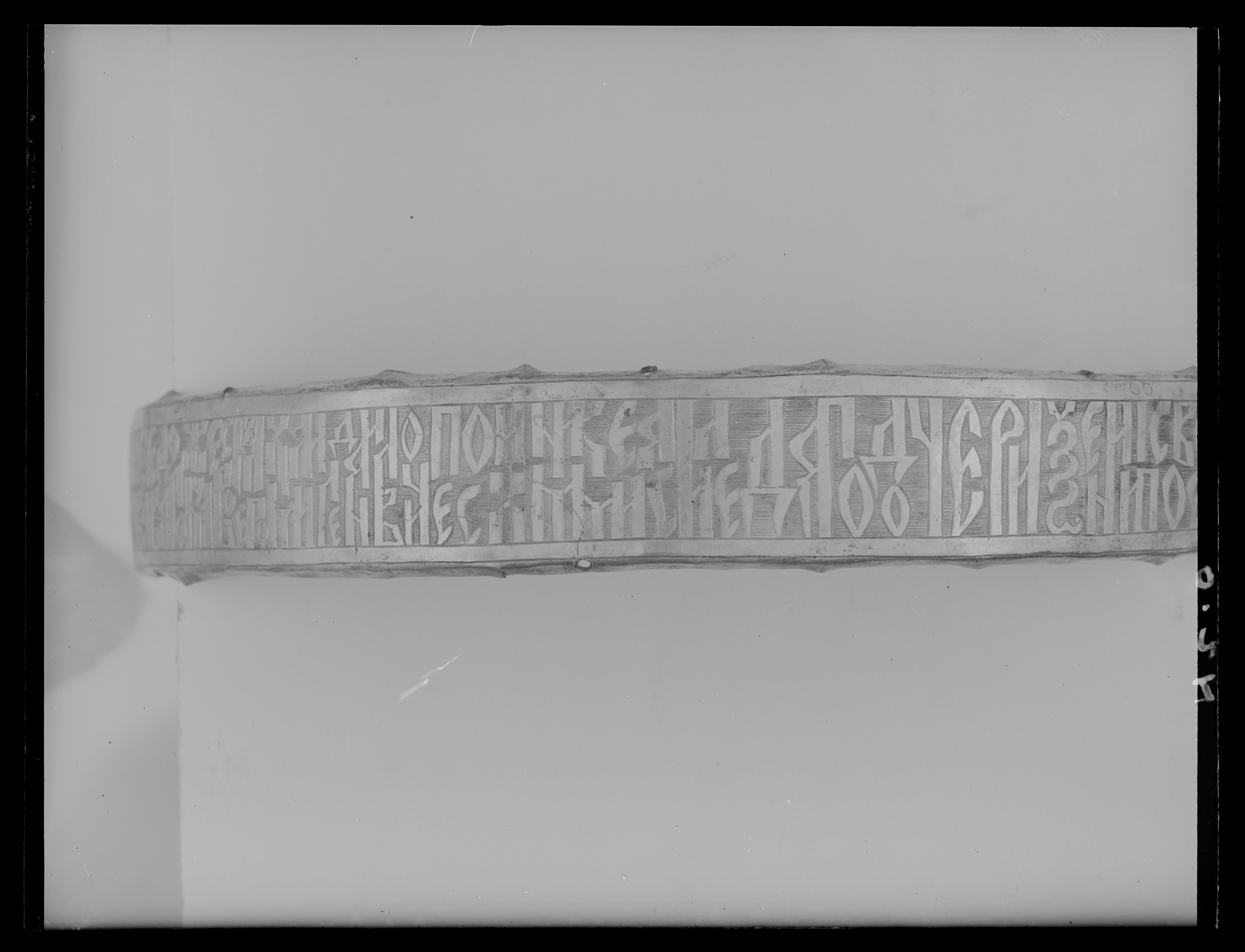 Krigsbyte från Narva, 1700. Mitra av hattformig modell med cylindrisk kulle med svagt rundad kant. Vulstformigt brätte, b: ca 30 mm, klätt med pergament (ursprungligen med skinn?). Kullen klädd med delvis mycket slitet, karminrött siden, nertill vid brättet ring av förgylld silverplåt, b: 30 mm med graverad, gammalslavisk text (översättning se Bodin Per-Arne, "Kejsarkrona och törnekrona", tidskr. Livrustkammarne 15:12, Stockholm 1981): År (7)159 november, 17 dagen gav statssekreteraren Michail Danilovs hustru, änkan Uljana, dotter till Vasilij, denna biskopsmössa till Tjudovklostret, till den undergörande Aleksijs hem, till minne av sin make Michail Danilovitj, eremitmunken Misail och sin dotter Ksenia för sin själ Därovanför en krans med sex, ursprungligen nio helgonbilder, graverade på rektangulära plåtar med trepassformig överdel, mellersta bågen spetsig, h: 83 mm, b:58 mm, gammalslaviska texter: 1 - ett manligt helgon med otydlig text "pete.."; 2 - ärkeängeln Gabriel: "achange gabri"; 3 - Maria: "mrthy" (mätär Theo - Guds moder); 4 - ärkeängeln Mikael: "achage michail"; 5 - evengelisten Petrus: "apoto petr"; 6 - helgon i biskopsdräkt: "st.alekse miro". På kullens översida en krans med nio runda plåtar med serafer och keruber, fyra stycken med text: "serafim", fem med "cherubi". Mitt på kullen en stor, rund plåt, d: 102,5 mm med Maria och Jesusbarnet, text:"mrthy" (Guds Moder". Runt plåtarna broderier med silke, silvertråd och -paljetter, två ovala, genomborrade glaspärlor bevarade. Hatten invändigt stoppad och klädd med blekrött siden.