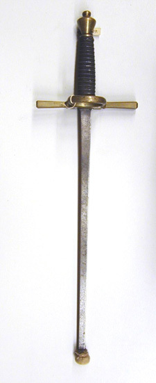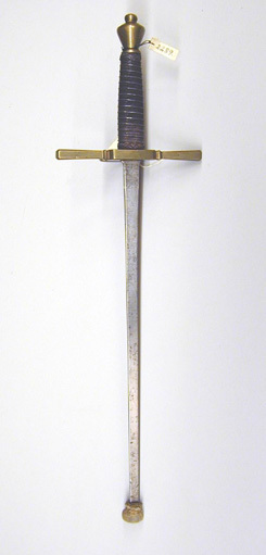 Fäste av mässing, utan ornering. Knapp omvänt konisk med tämligen stor nitknapp. Parerstänger raka med fyrsidigt tvärsnitt, vid kryssets utsida en oval sidobygel. Kavel lindad med omväxlande mörkanlöpt tvinnad och spunnen ståltråd, upptill och nedtill en flätad krans av smal tråd i samma material. Klinga med rektangulärt tvärsnitt (nästan platt); ytteränden med en tämligen stor stötknopp av sämskskinn, nedtill ombundet med tunt segelgarn.