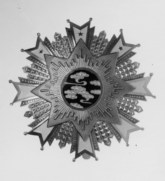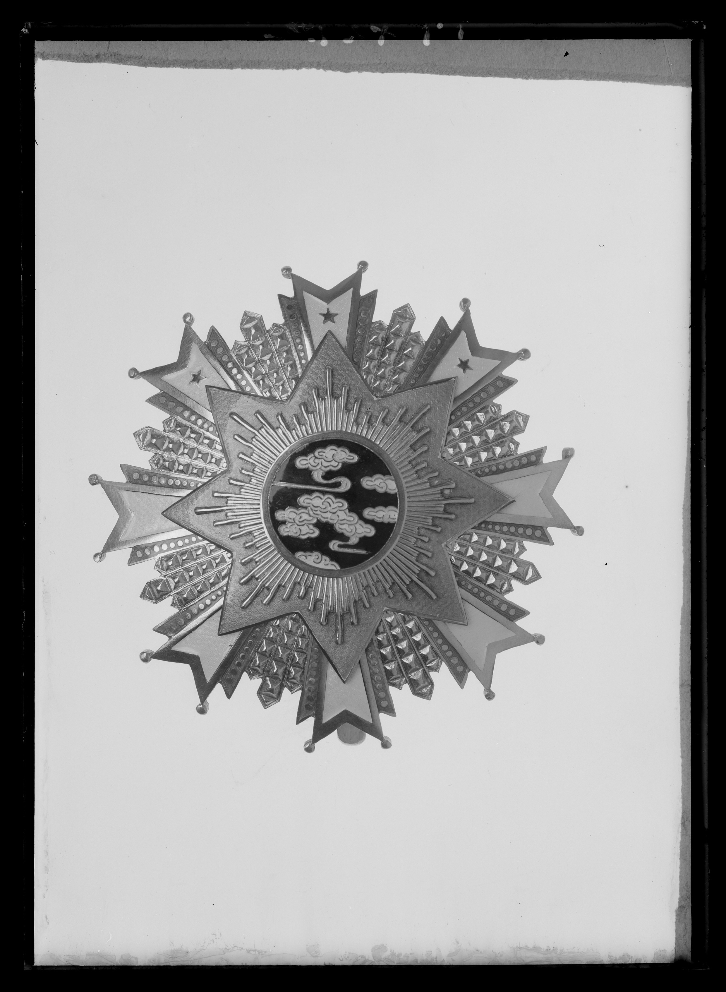 Åttaarmad stjärna av förgylld mässing(?), kluvna armar med vitemaljerat mittparti, kulor på spetsarna, på de tre övre armarna femuddiga, rödemaljerade stjärnor. Armarna lagda på kortare, bredare, rödemaljerade armar med vardera tolv förgyllda rundlar. Mellan armarna tre flinkerade strålar av förgylld mässing. På stjärnan lagt en åttauddig stjärna, täckt med ljusblå emalj, därpå lagt en åttauddig, förgylld strålstjärna, i sin tur belagd med en rund medaljong, täckt med mörkblå emalj,däri vita moln, kantade med gul emalj, rödemaljerad kantring. Frånsidan förgylld, rektangulär stämpel med skrifttecken och därnedanför 29. Vertikalt placerad säkerhetsnål. Runt skruvhuvud i mitten för medaljongen.
