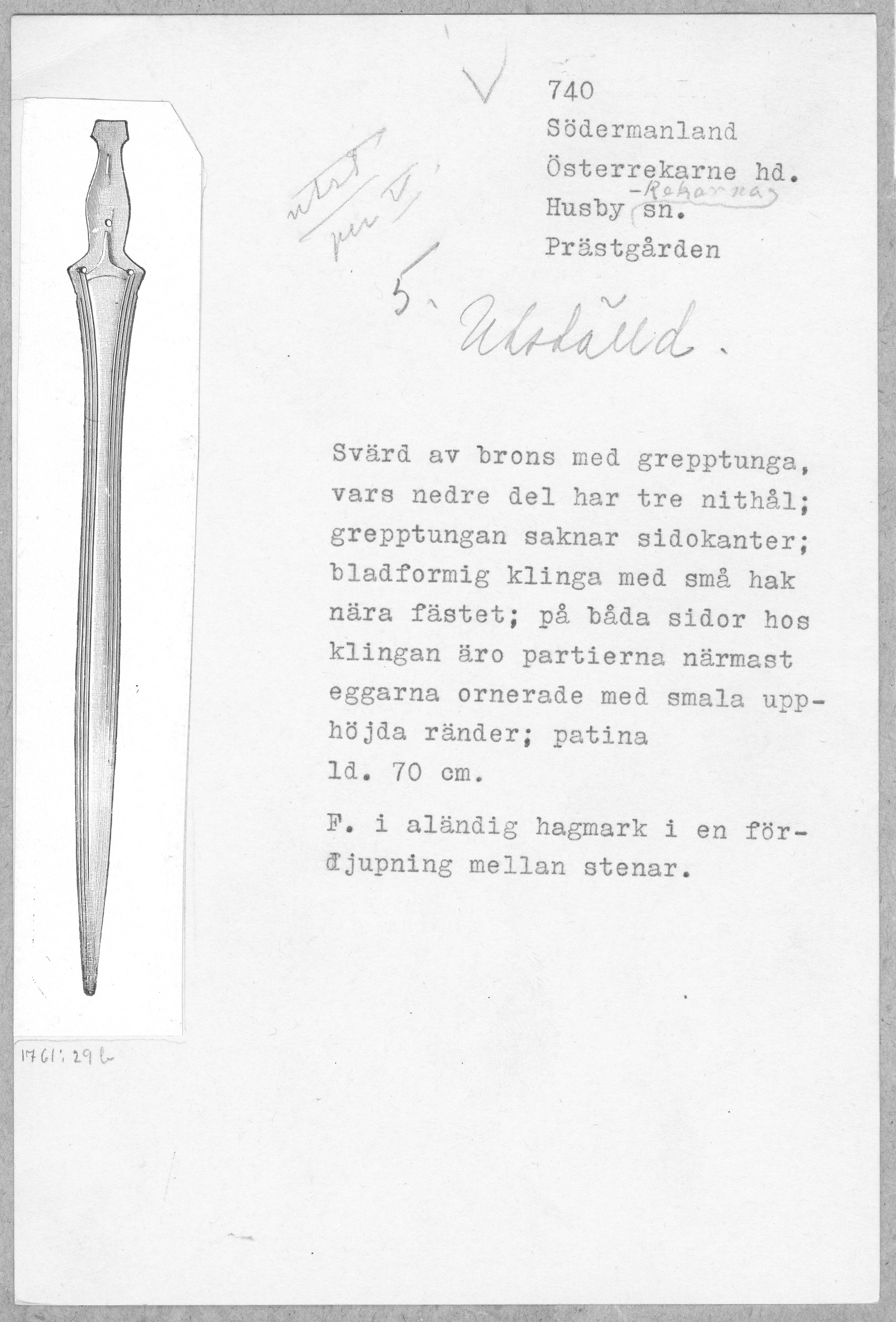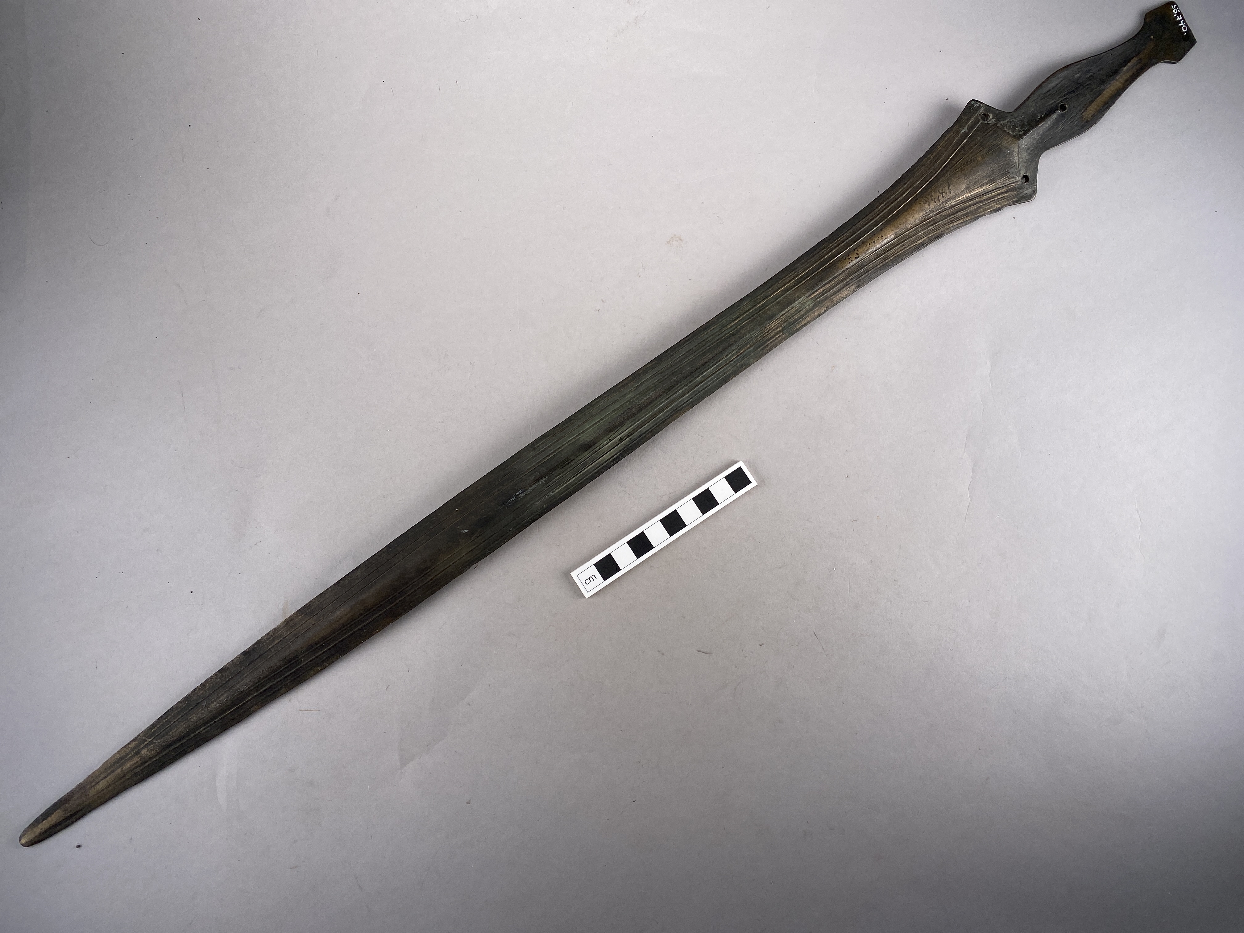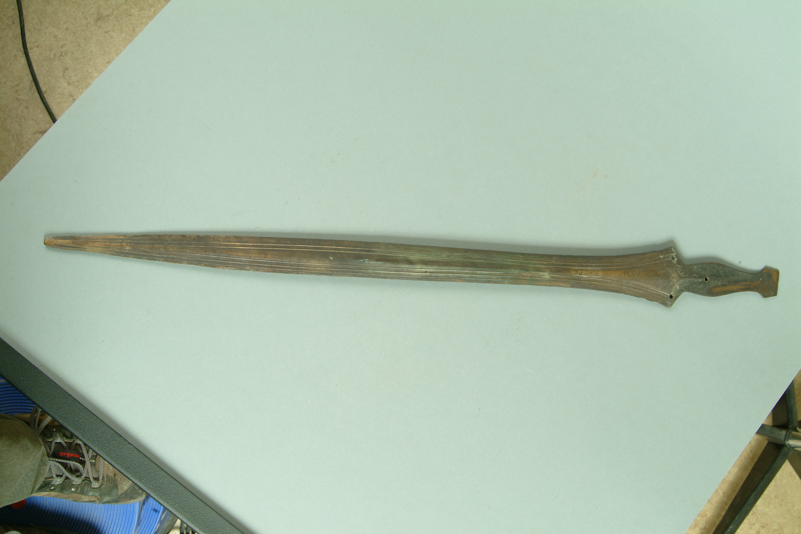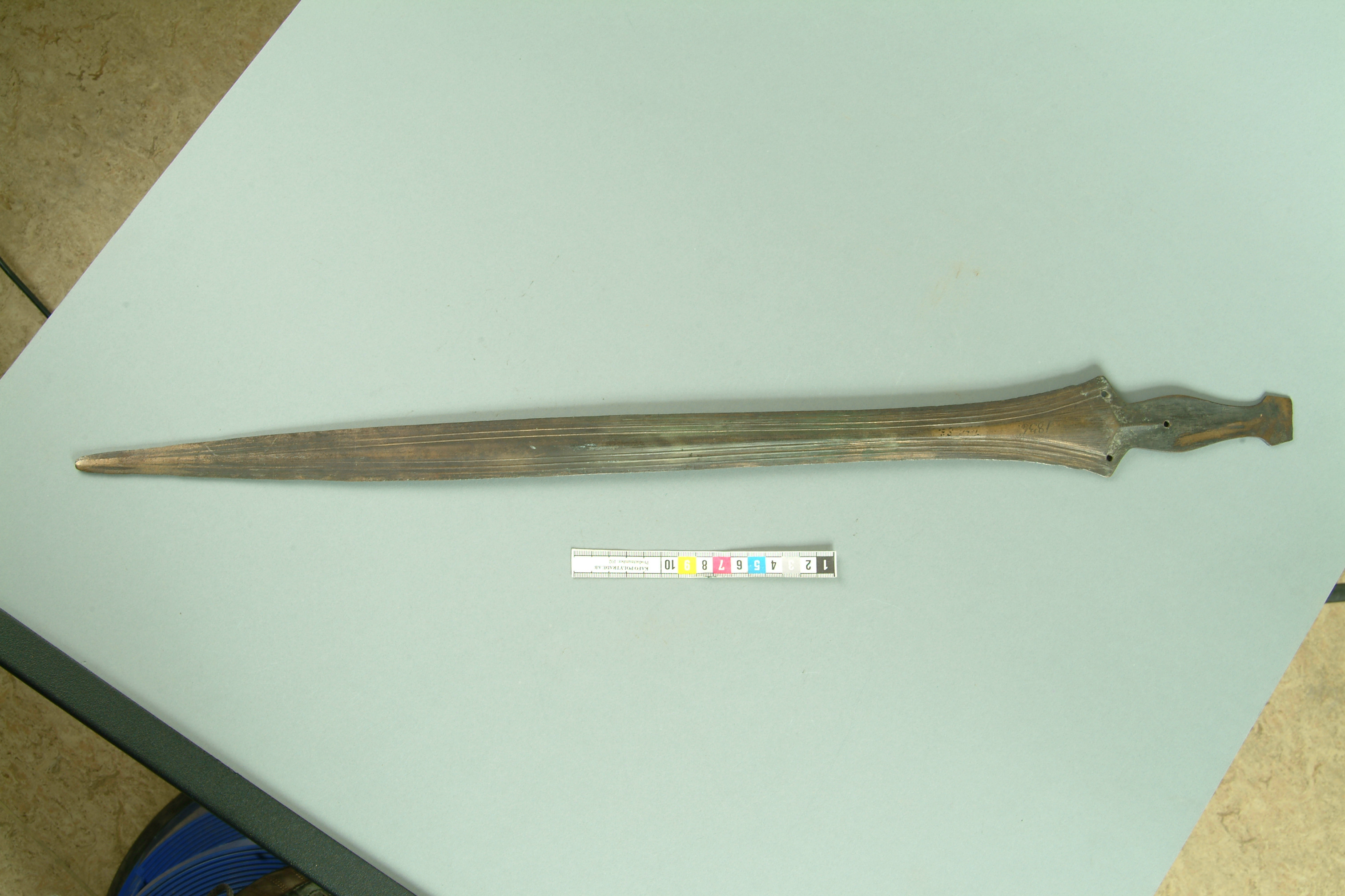 Svärd av brons med grepptunga, vars nedre del har tre nithål. Grepptungan saknar sidokanter. Klingan är bladformig med små hak nära fästet. På båda sidor hos klingan är partierna närmast eggarna ornerade med smala upphöjda ränder. Tillverkat i nord- eller centraleuropa.