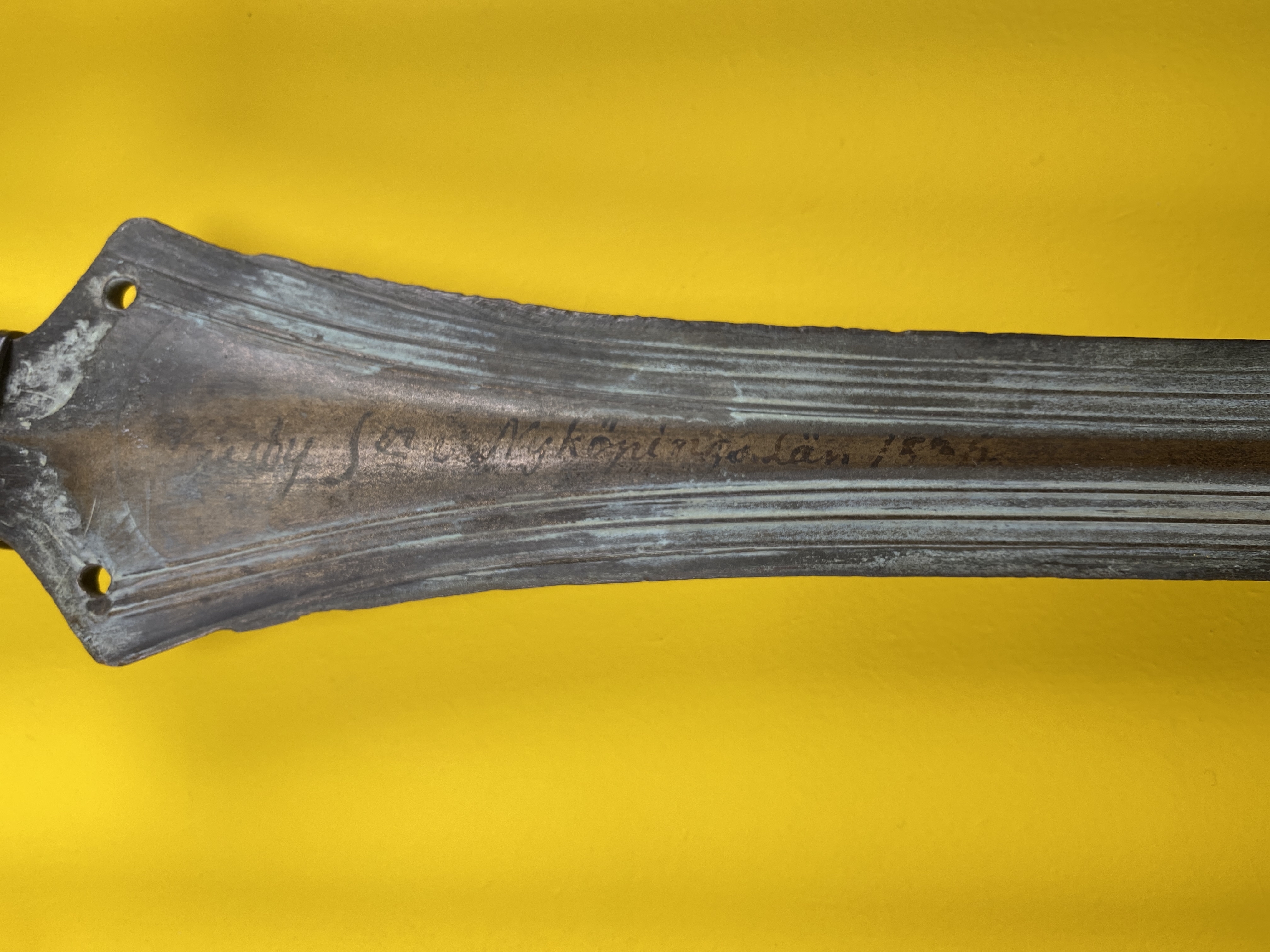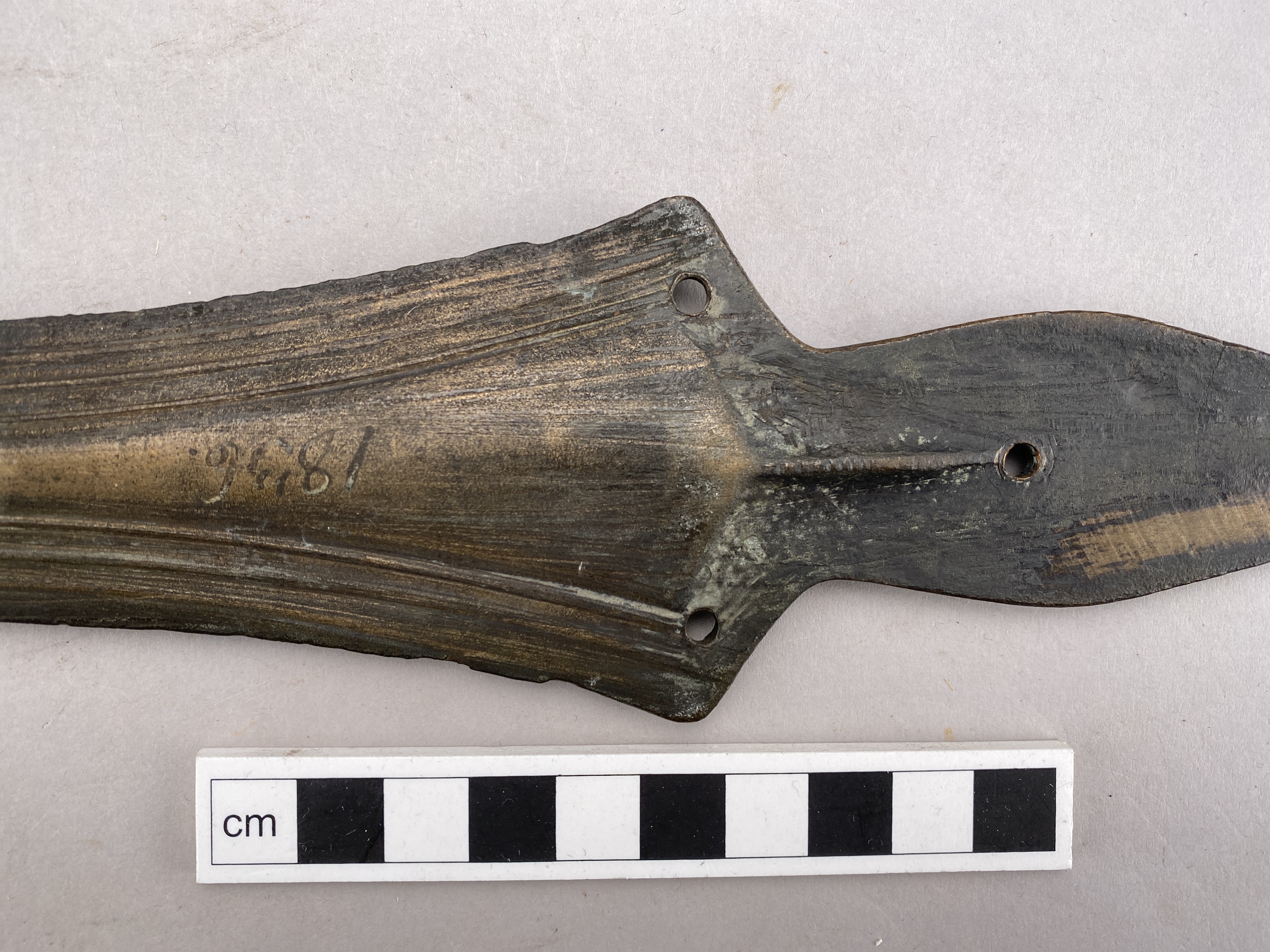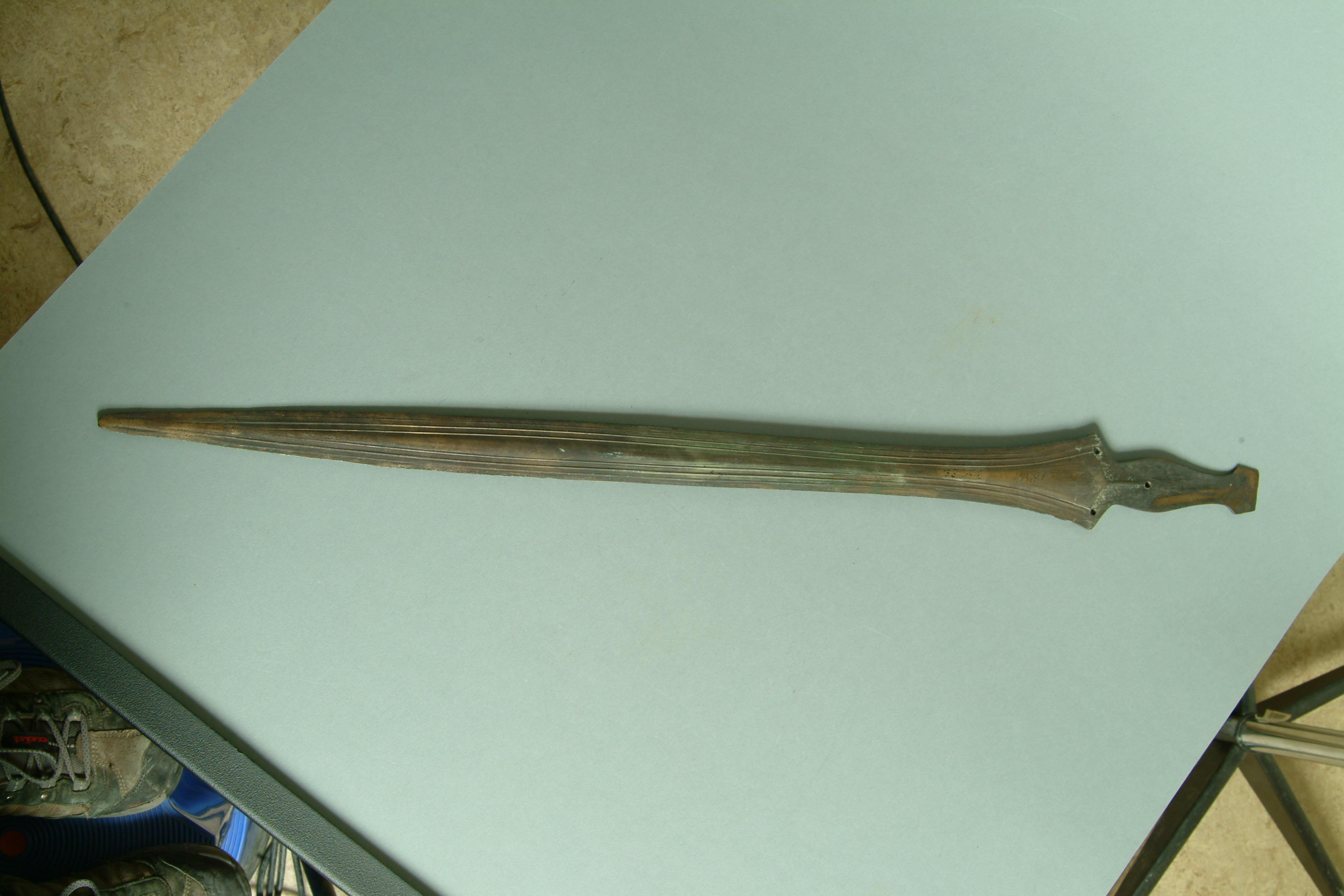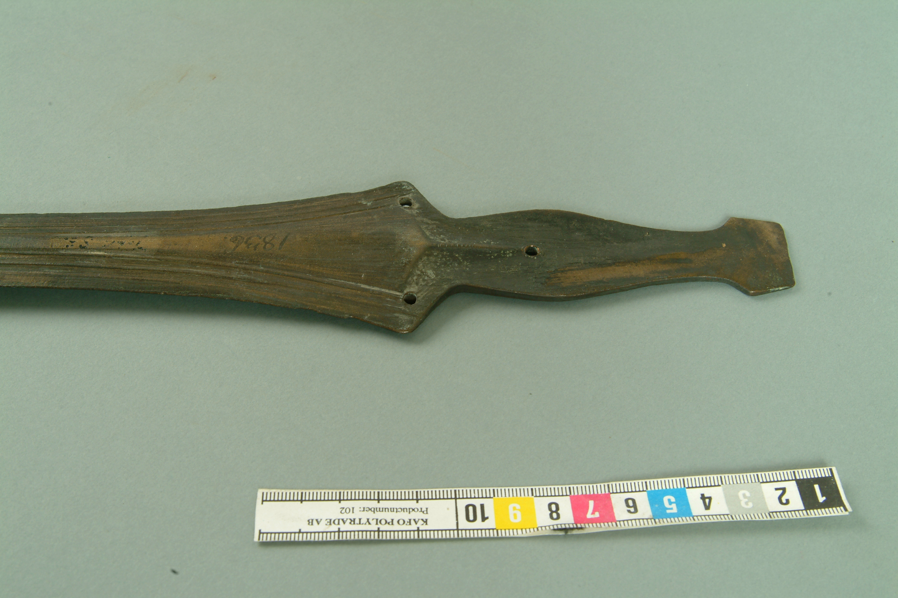 Svärd av brons med grepptunga, vars nedre del har tre nithål. Grepptungan saknar sidokanter. Klingan är bladformig med små hak nära fästet. På båda sidor hos klingan är partierna närmast eggarna ornerade med smala upphöjda ränder. Tillverkat i nord- eller centraleuropa.