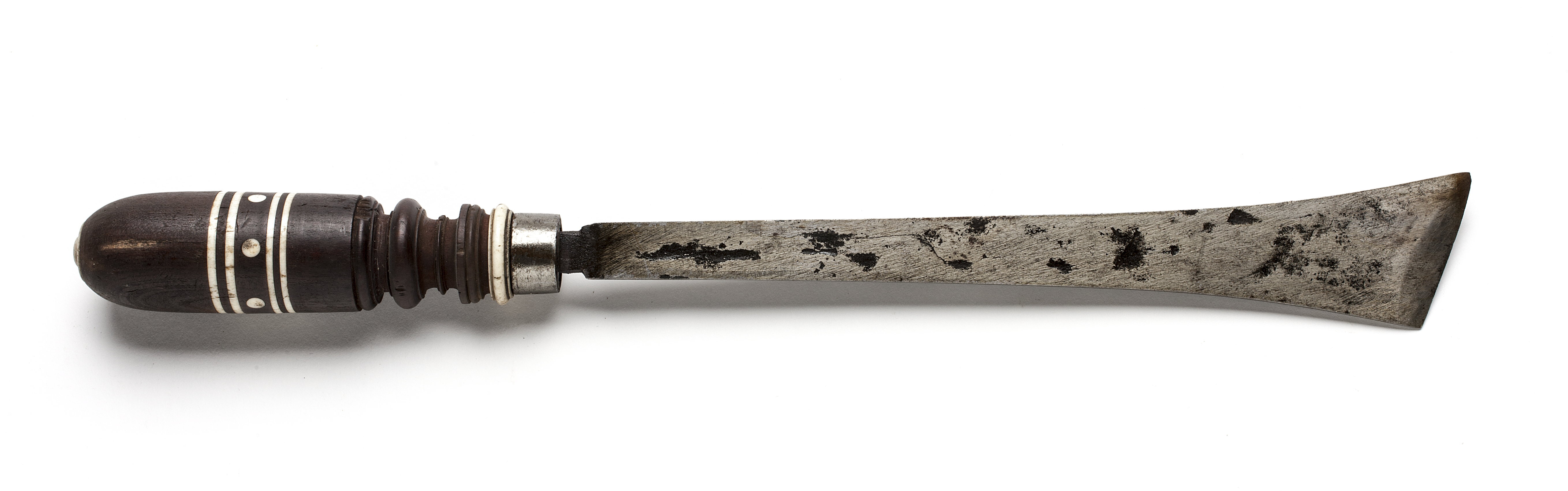 Klinga med rektangulär genomskärning. Svarvat, profilerat skaft av mörkbetsat päronträ med ringar, punkter och knopp av ben. Stålring.