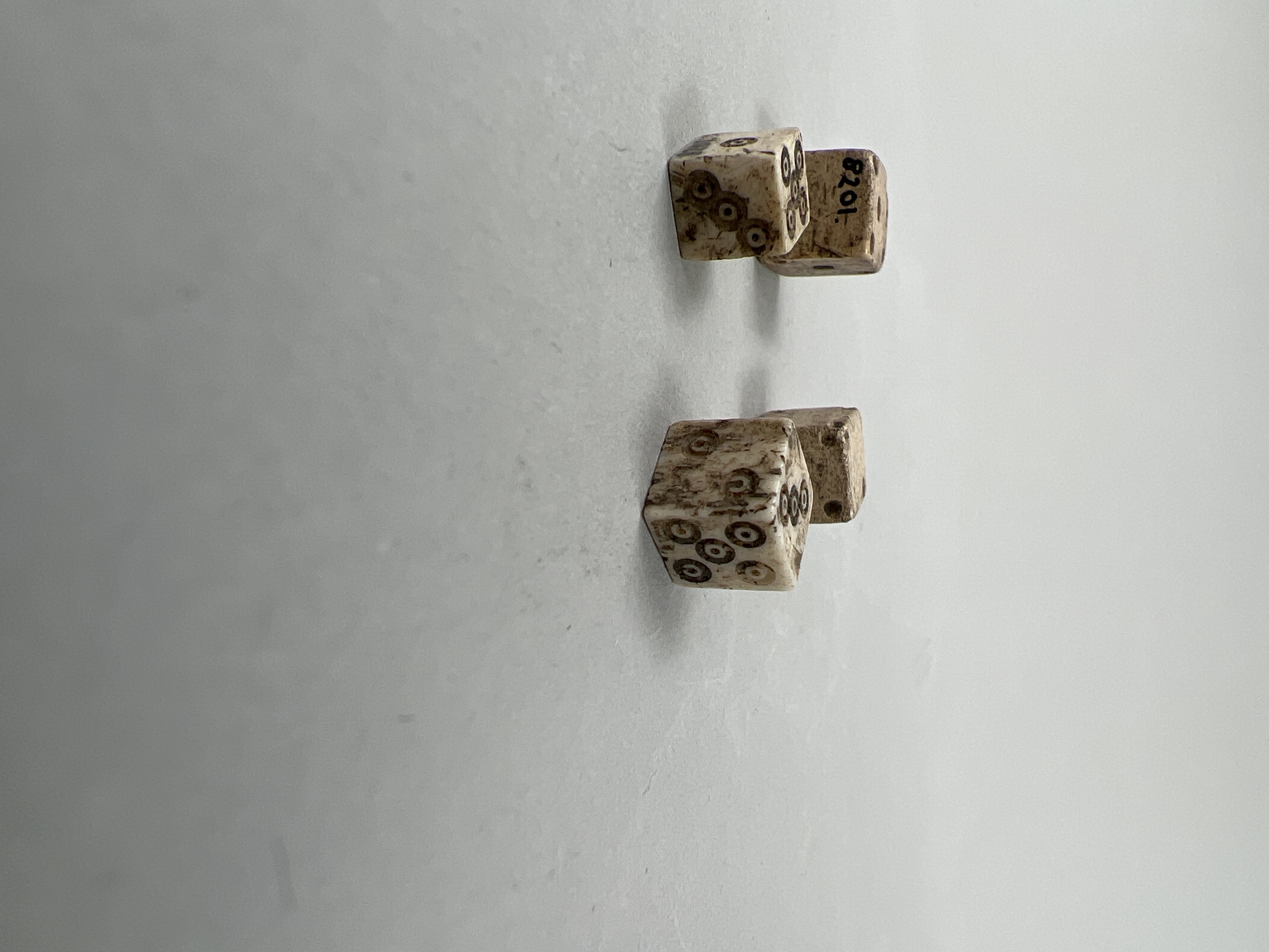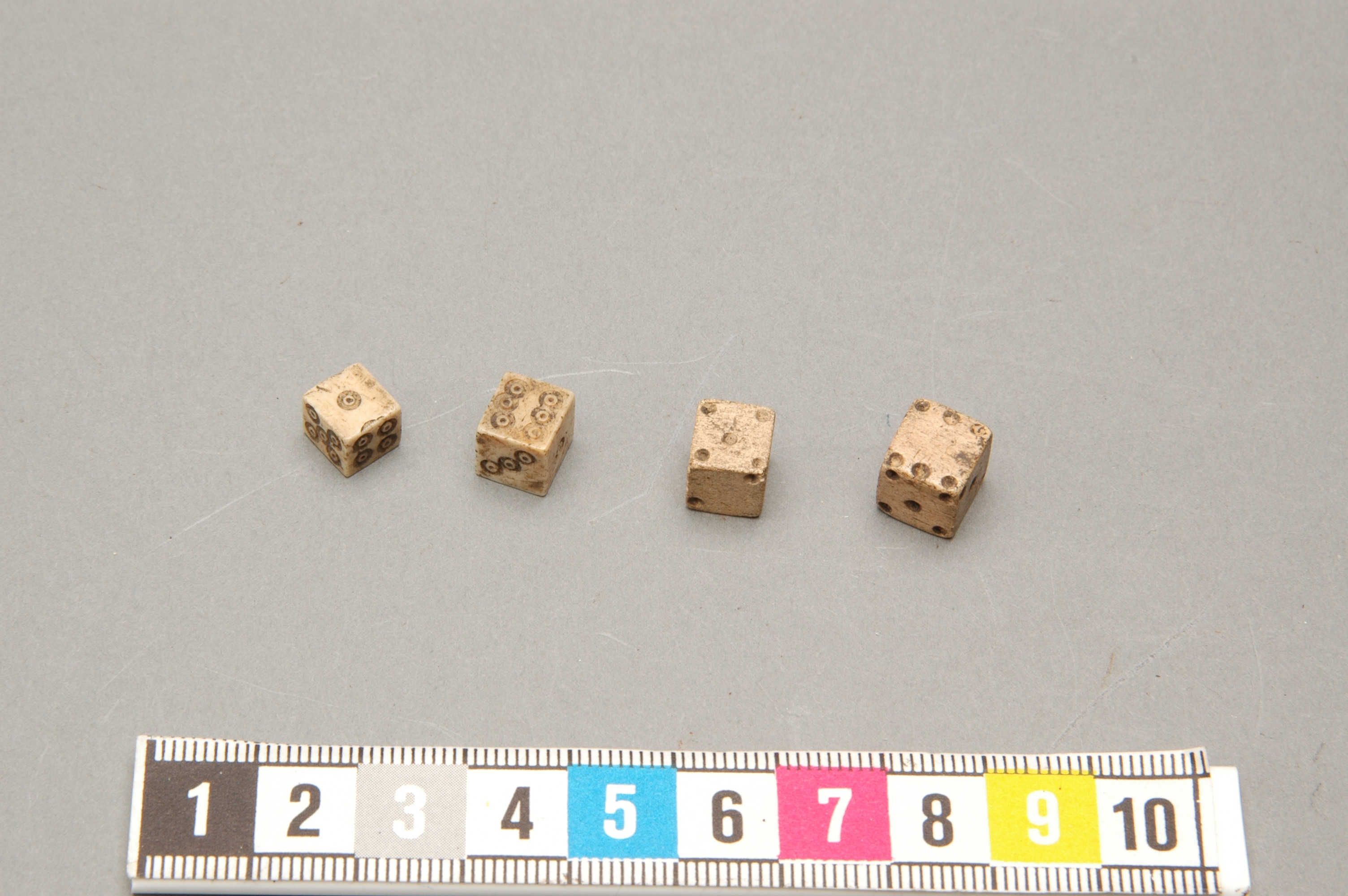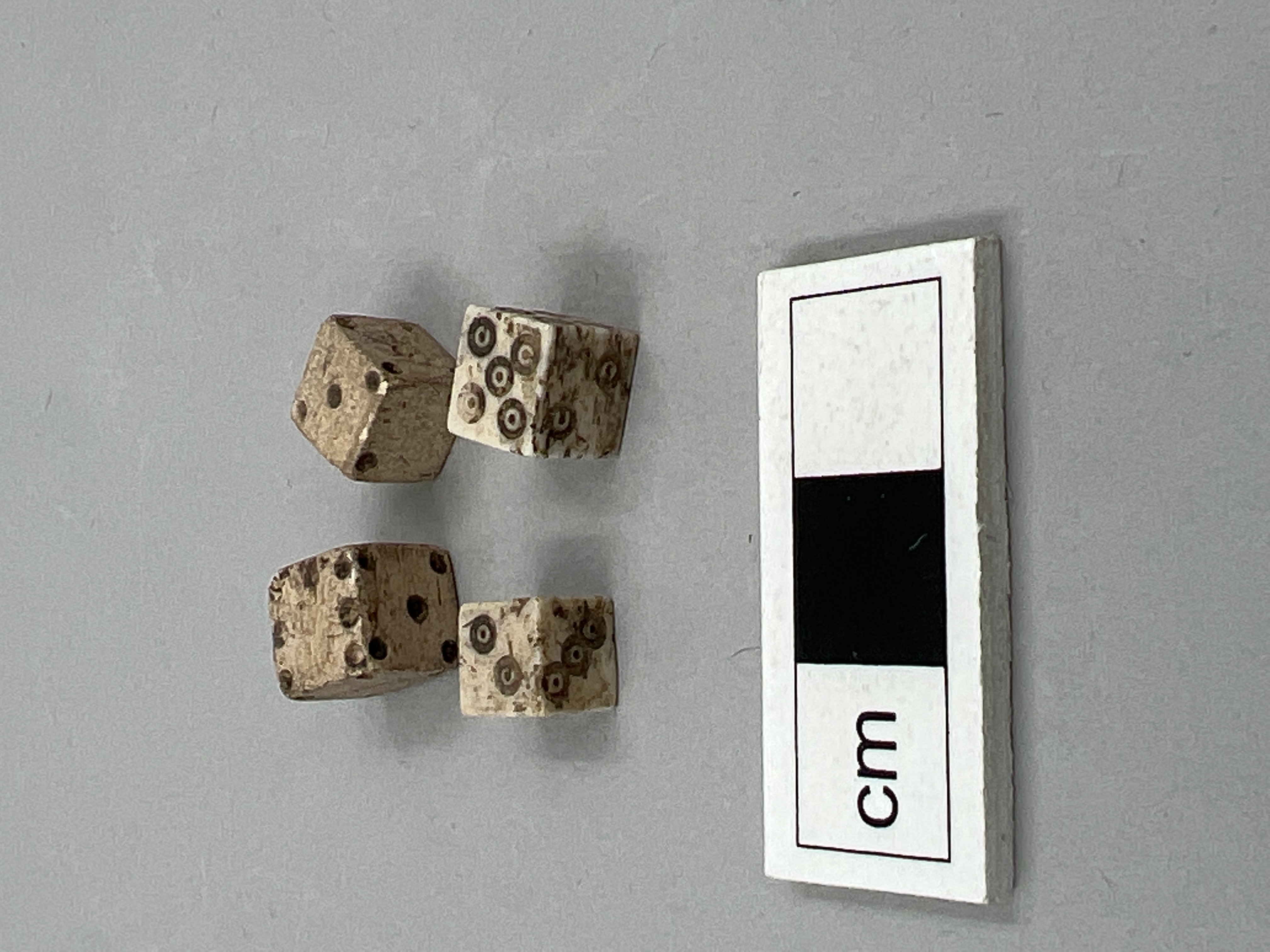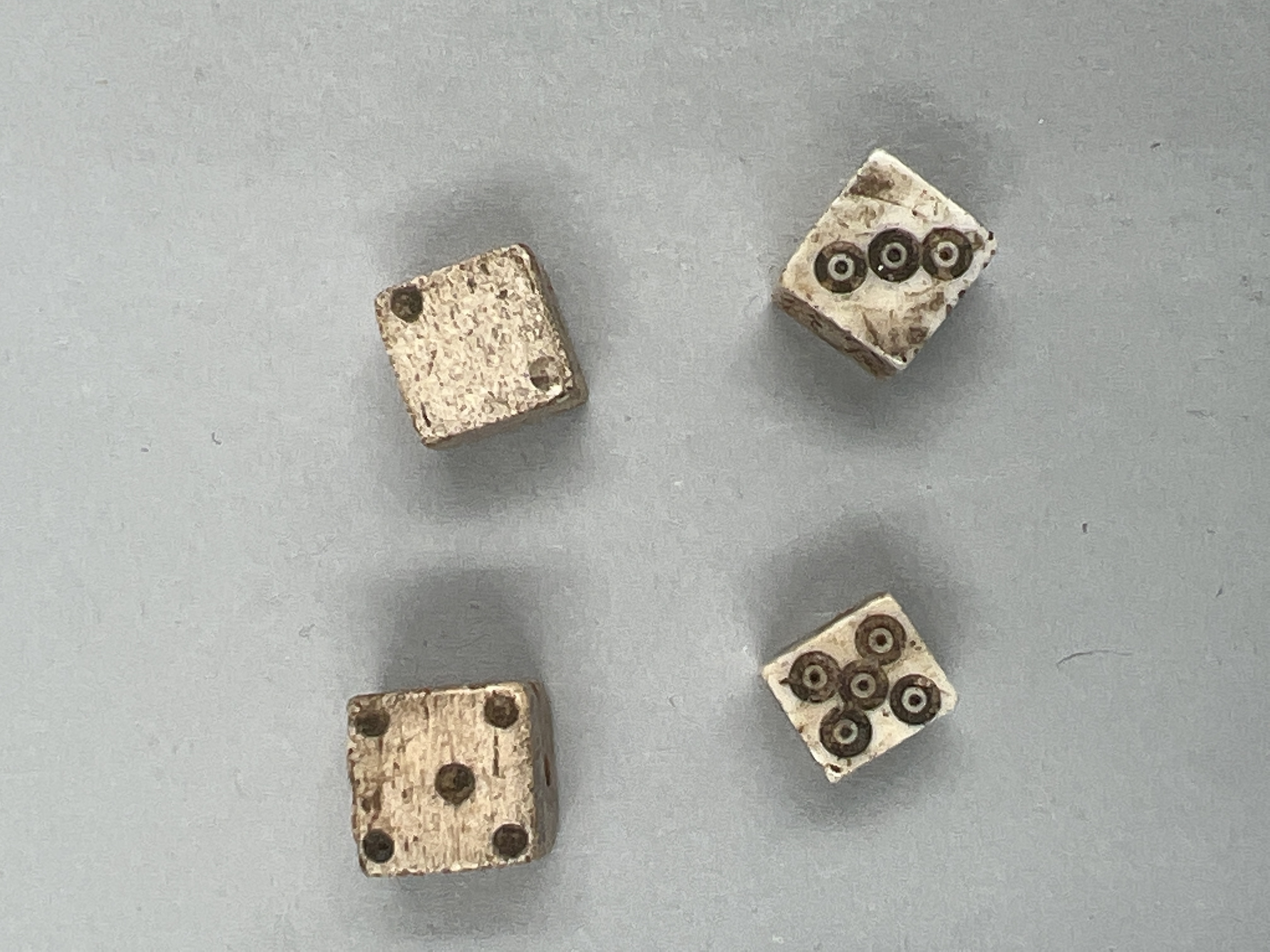 Fyra kubiska tärningar av ben. Två av dem är märkta med punkter, de andra två har punkter som är omgivna av cirklar.
