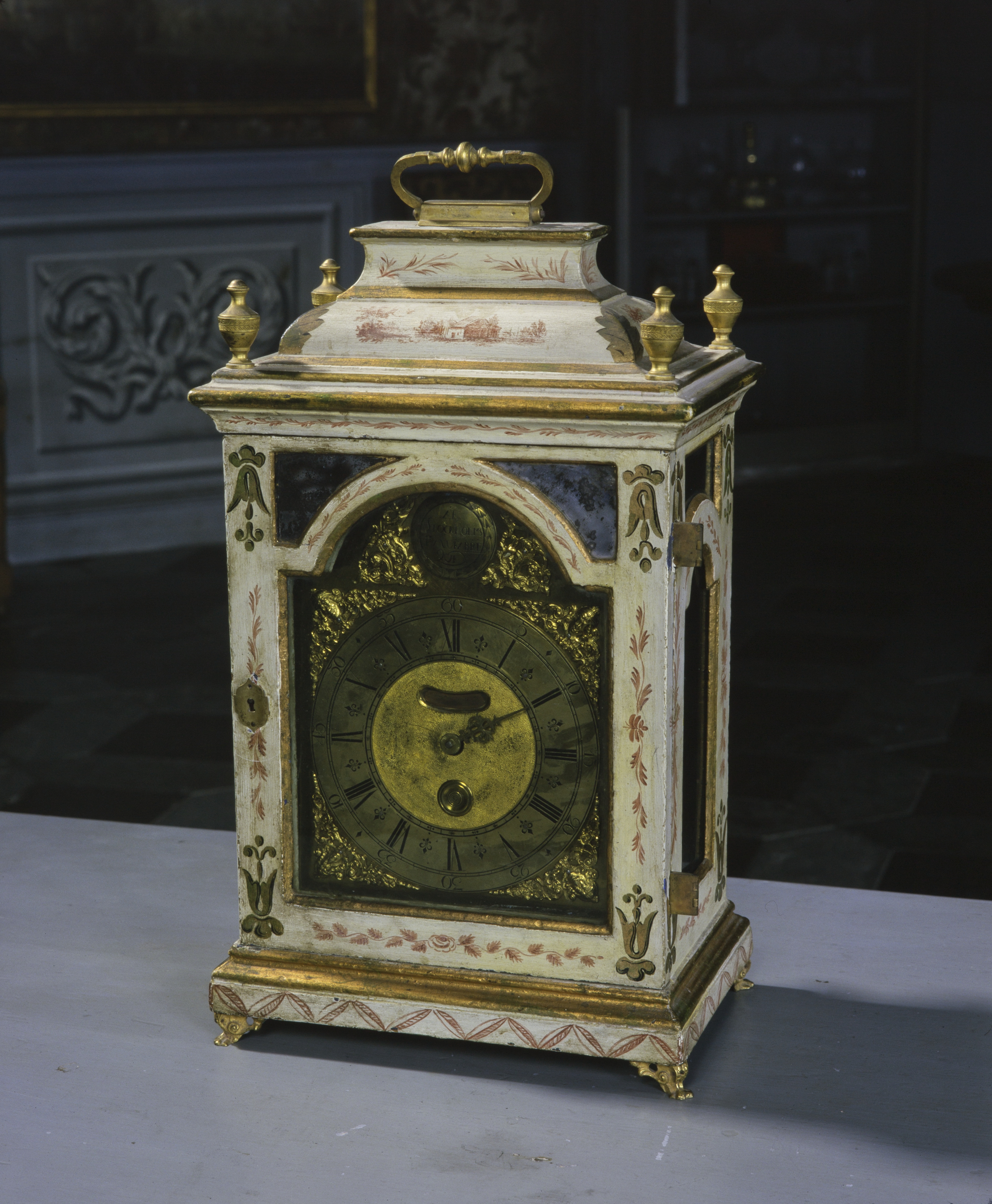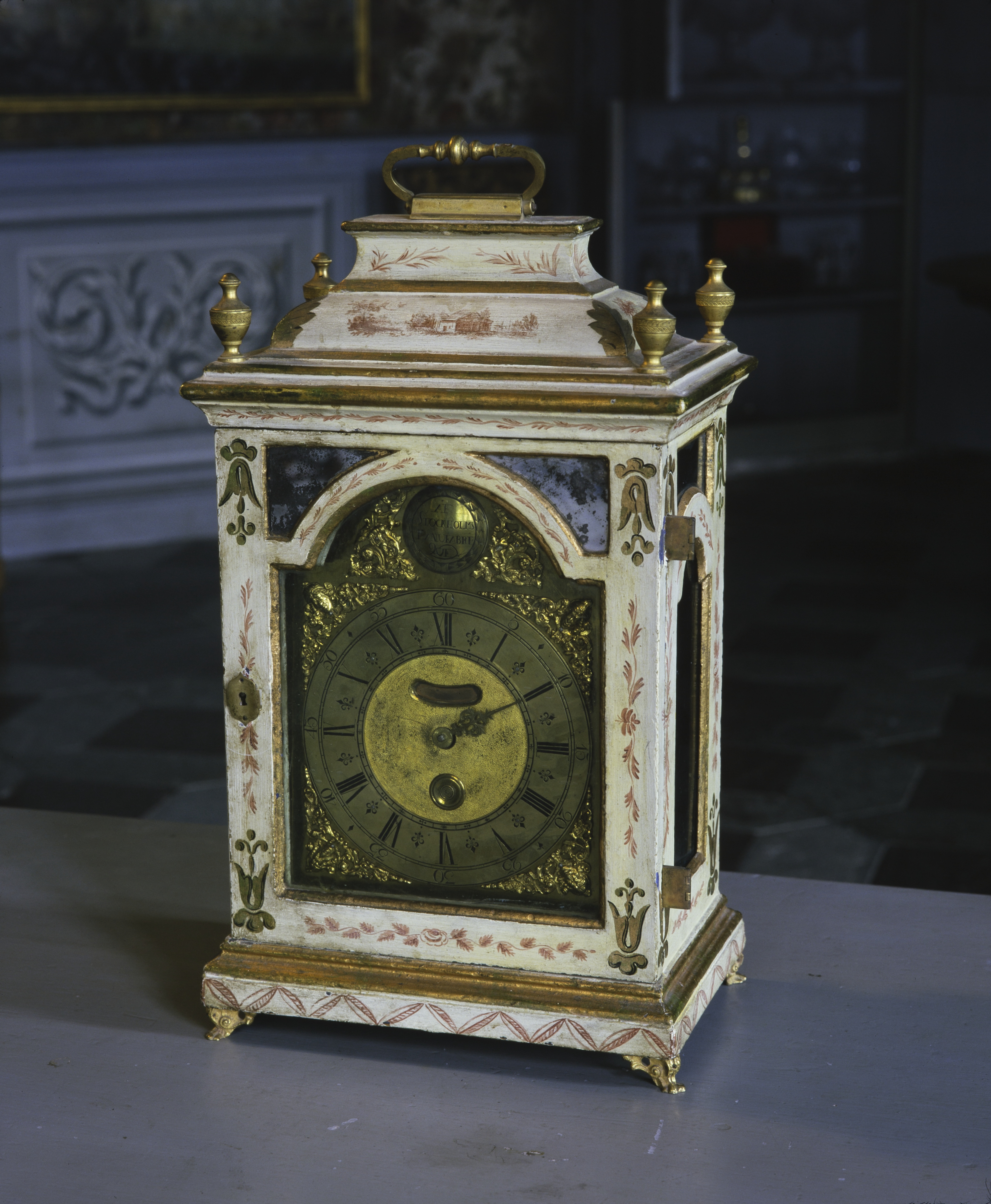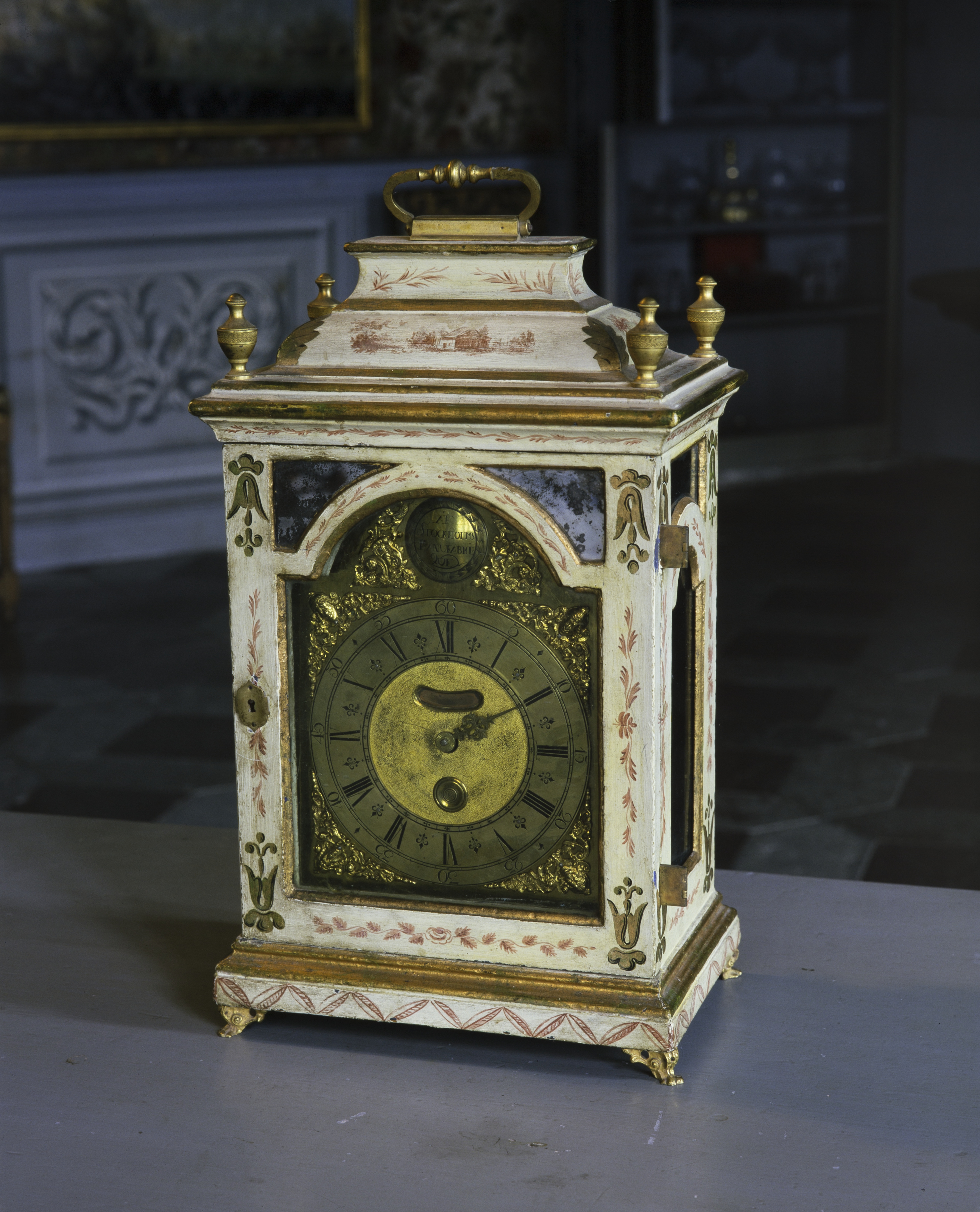 I hörnen gjutna maskaroner och akantusrankor av förgylld bly. Urfoder av vitmålad furu med rundbågiga glas på alla fyra sidor , i svicklarna speglar. Profilerat krön med handtag och i hörnen urneformade knoppar av förgylld mässing. Förgyllda lister , målade rosa , bladornament och landskap. Invändigt blåmålat. Dörrar på fram- och baksidan. Signerad på rund plåt : " AF STOCKHOLMS MANUFABRIQUE " 1729-1751.
