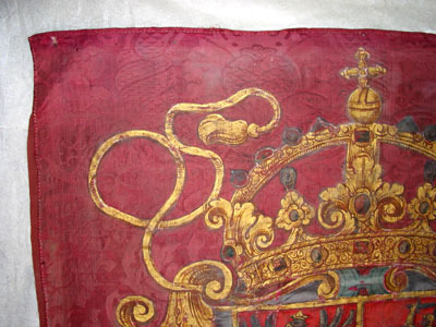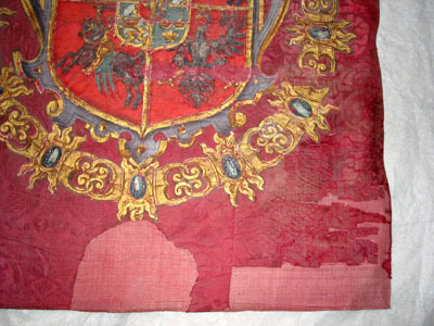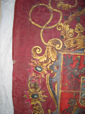 Fanduk av karminröd sidendamast i två vertikala våder, 260 och 540 mm breda, omvikta, kastade kanter. På båda sidor målat det polska riksvapnet krönt av en kunglig krona, en vapensköld lagd på en rullverkskartusch i olika grå nyanser med guldfärgade kanter, skölden omgiven av Gyllene Skinnets ordenskedja och klenod. Skölden är kvadrerad med guldkanter, alla fälten röda, i fält 1 och fyra i silver (nu grått) Polen (silverörn med guldbeväring, krönt med krona av guld), i fält 2 och 3 Litauen (ryttare i rustning av guld med lyft svärd med silverklinga och guldfäste, på v arm en röd sköld med ett två gånger korsat kors av guld. Hästen av silver med seldon av guld, hästtäcke målat med grå färg. Hjärtsköld likaså kvadrerad med guldkanter, fälten blå, i fält 1 och 4 tre kronor av guld (2,1), i fält 2 och 3 tre grå strömmar och däröver ett krönt lejon av guld. Innersköld Vasa. två gånger styckat av blått, silver och rött och däröver en Vase i guld.