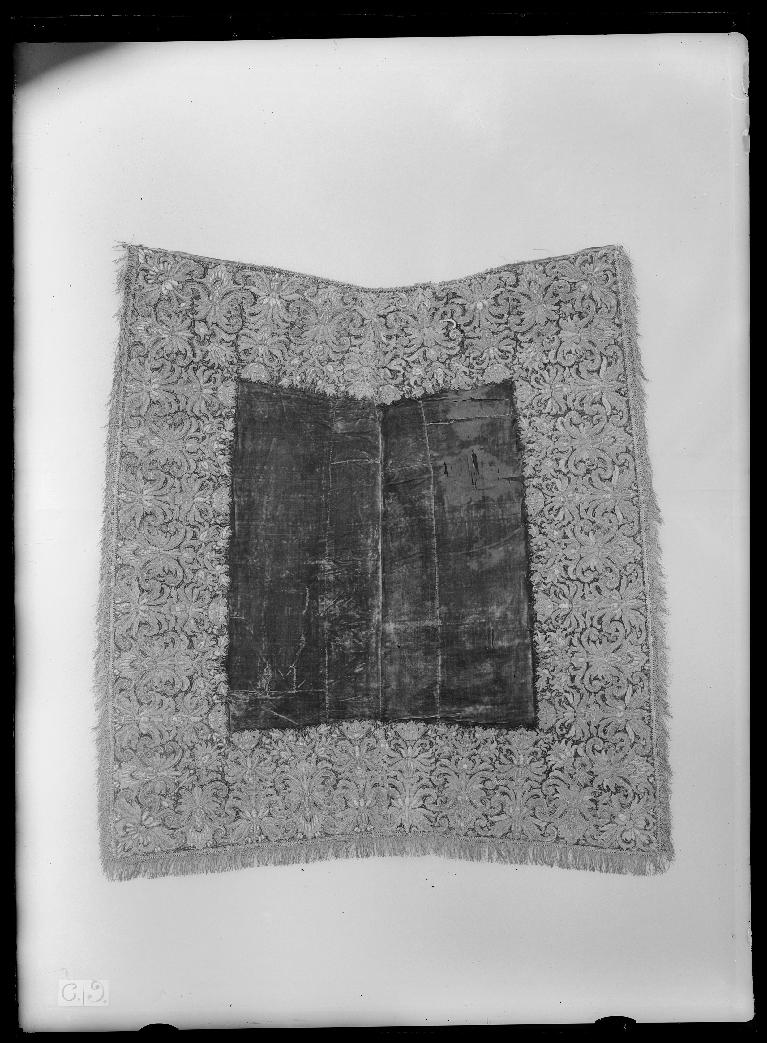 4 broderade stycken af lika sammet och arbete med silfverfransar.