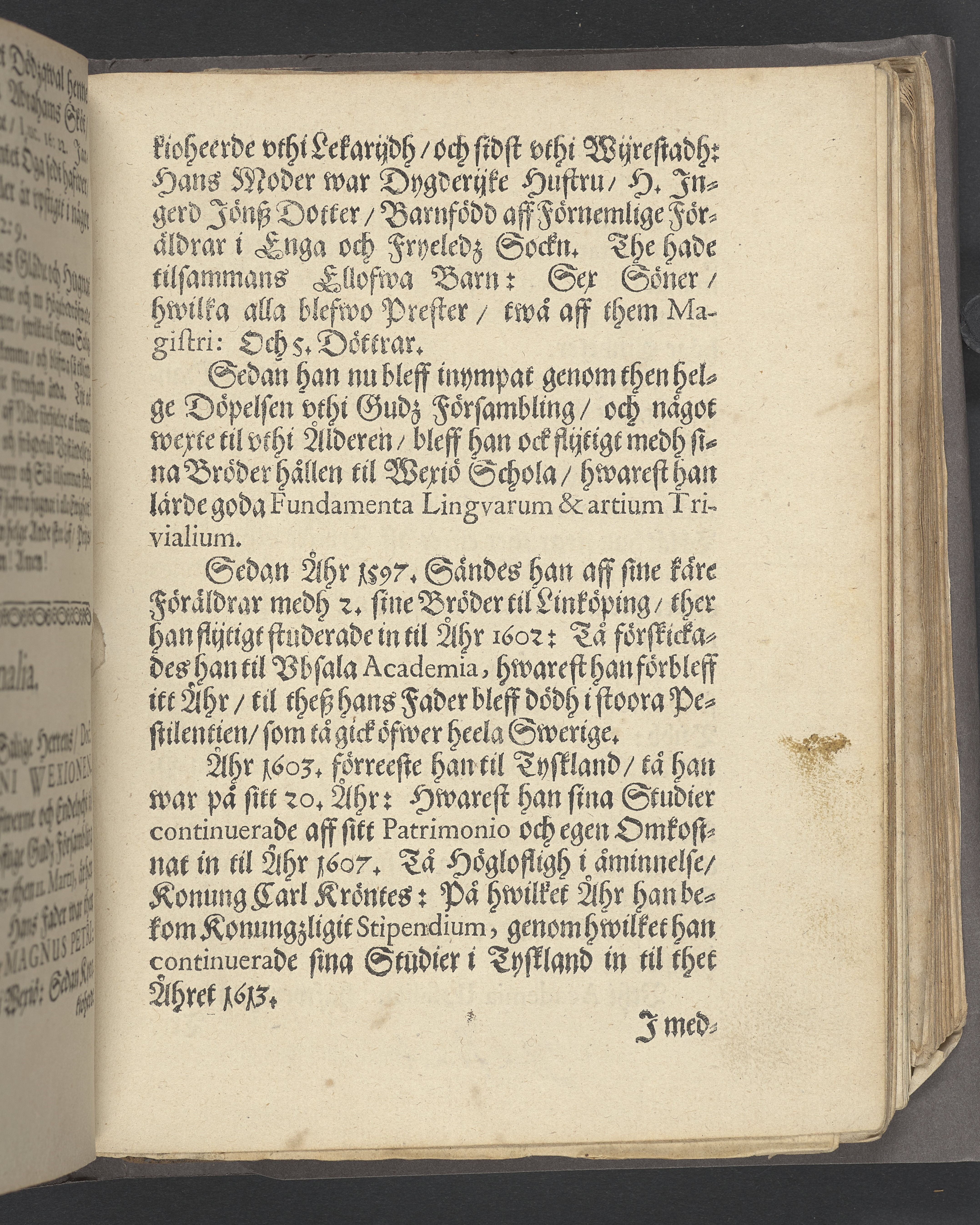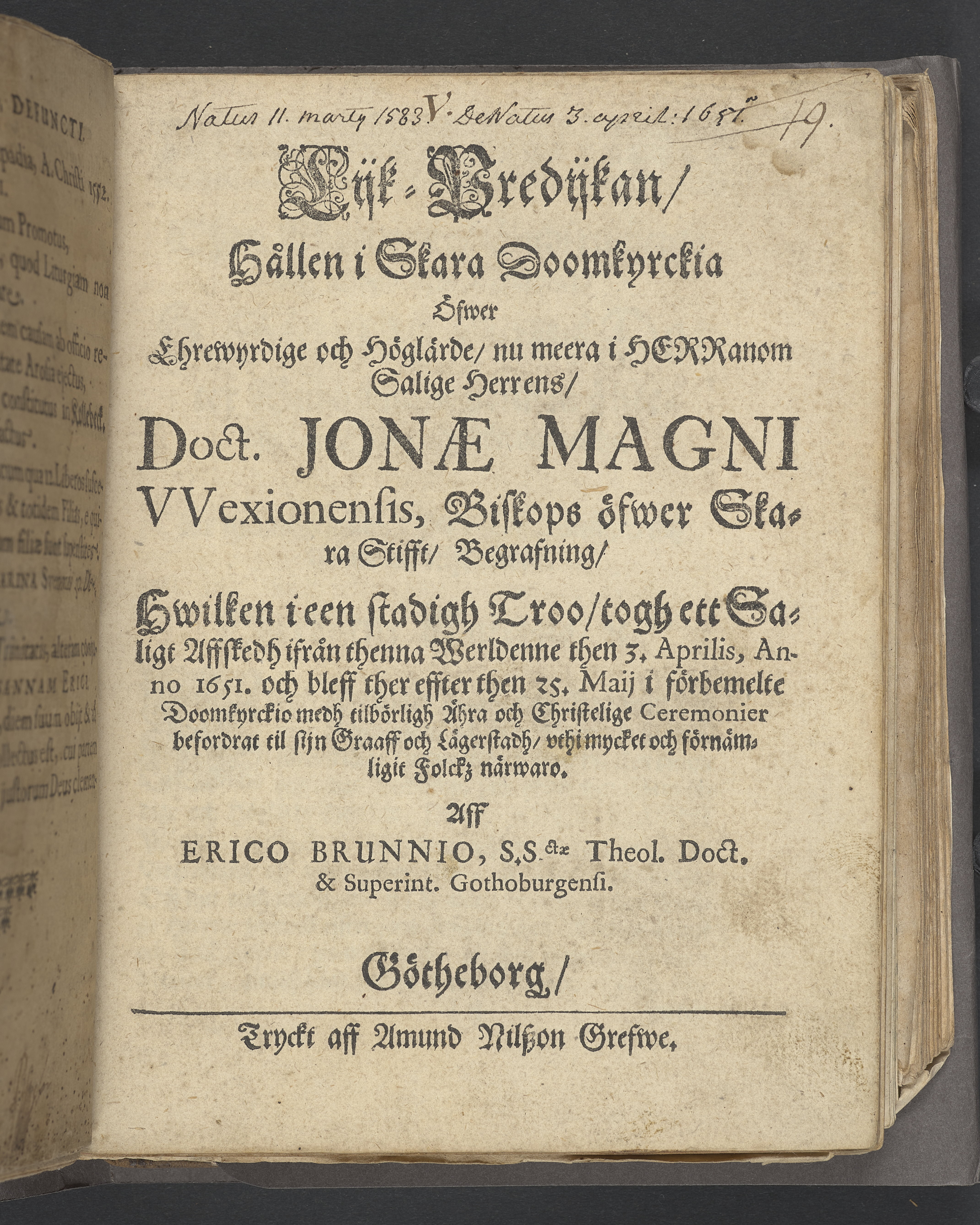 Lijk-predijkan, hållen i Skara doomkyrckia öfwer ... Doct. Jonæ Magni VVexionensis, biskops öfwer Skara stifft, begrafning ... 1651 ... then 25 maij ... i förbmelte doomkyrckio ... aff Erico Brunnio ... Götheborg, tryckt aff Amund Nilszon Grefwe.