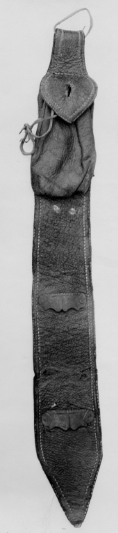 Flaskläder av mörkbrunt läder av utdraget konisk form, i den bredare änden. Spetsigtavslutad, vid den smalare delen kulpung med smal dragsko av läder samt hjärtformigt lockmed vertikalt hål. På den bredare delen två tvärgående konturerade stålbeslag fästade vardera med två nitar. Bäranordning av smal läderrem.