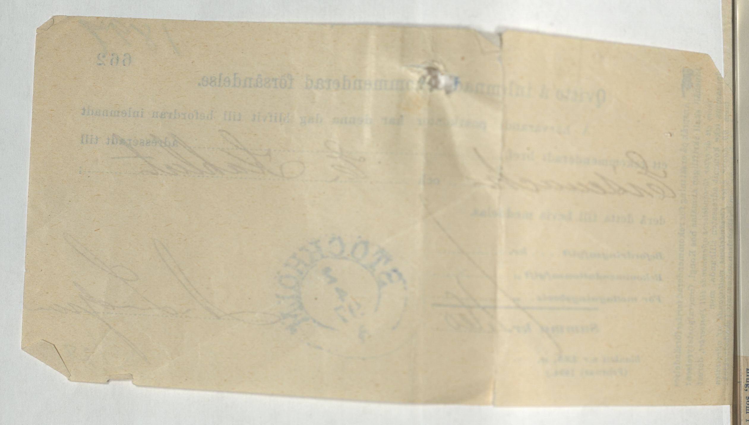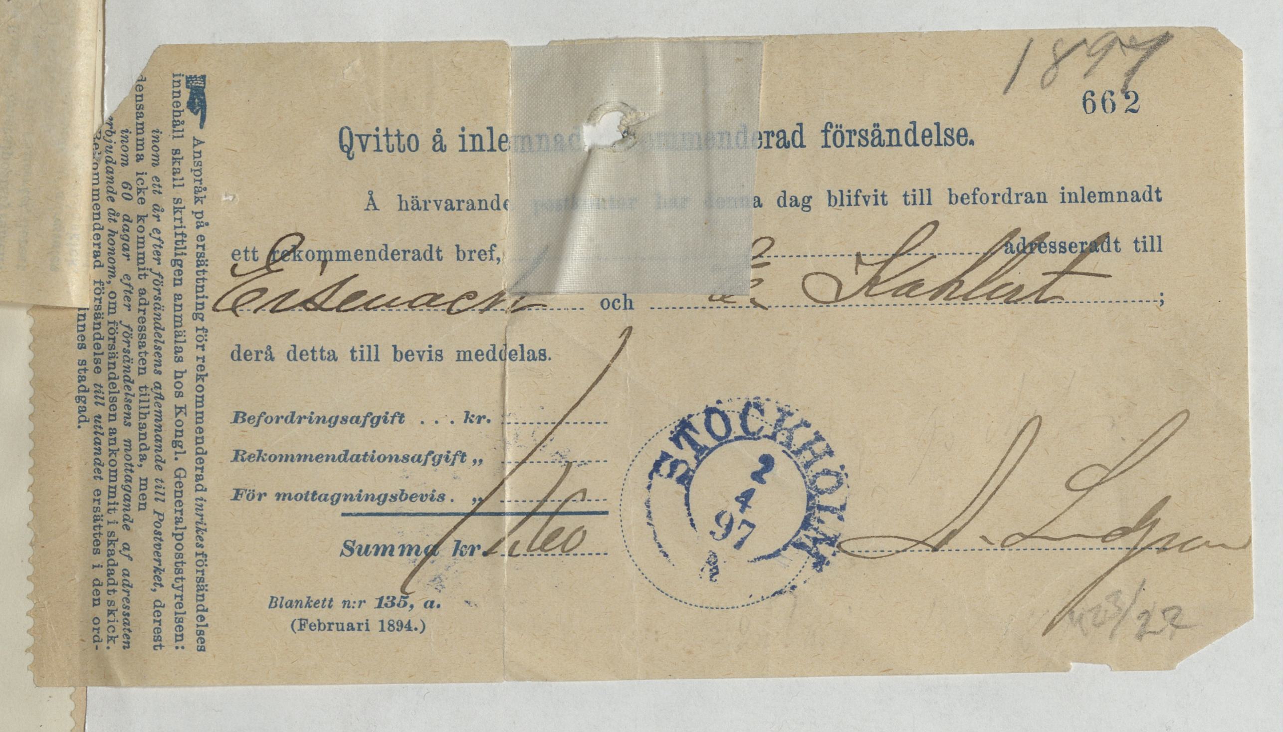 Kvitto för inlämnad rekommenderad försändelse gällande E. Kahlert. Stockholm, 1897.