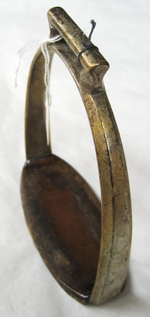 Bestående av välvd båge av försilvrad mässing med uppåt avsmalnande och utåt fasde kanter. Upptill utsmitt remfäste med rak bygel och gavlar. Gavlarnas kanter med välvd fasning. Nertill ovalt trampstöd av två skenor, överdragna med brunt tjockt läder i två stycken sammanfogade med längsgående söm i kanten.