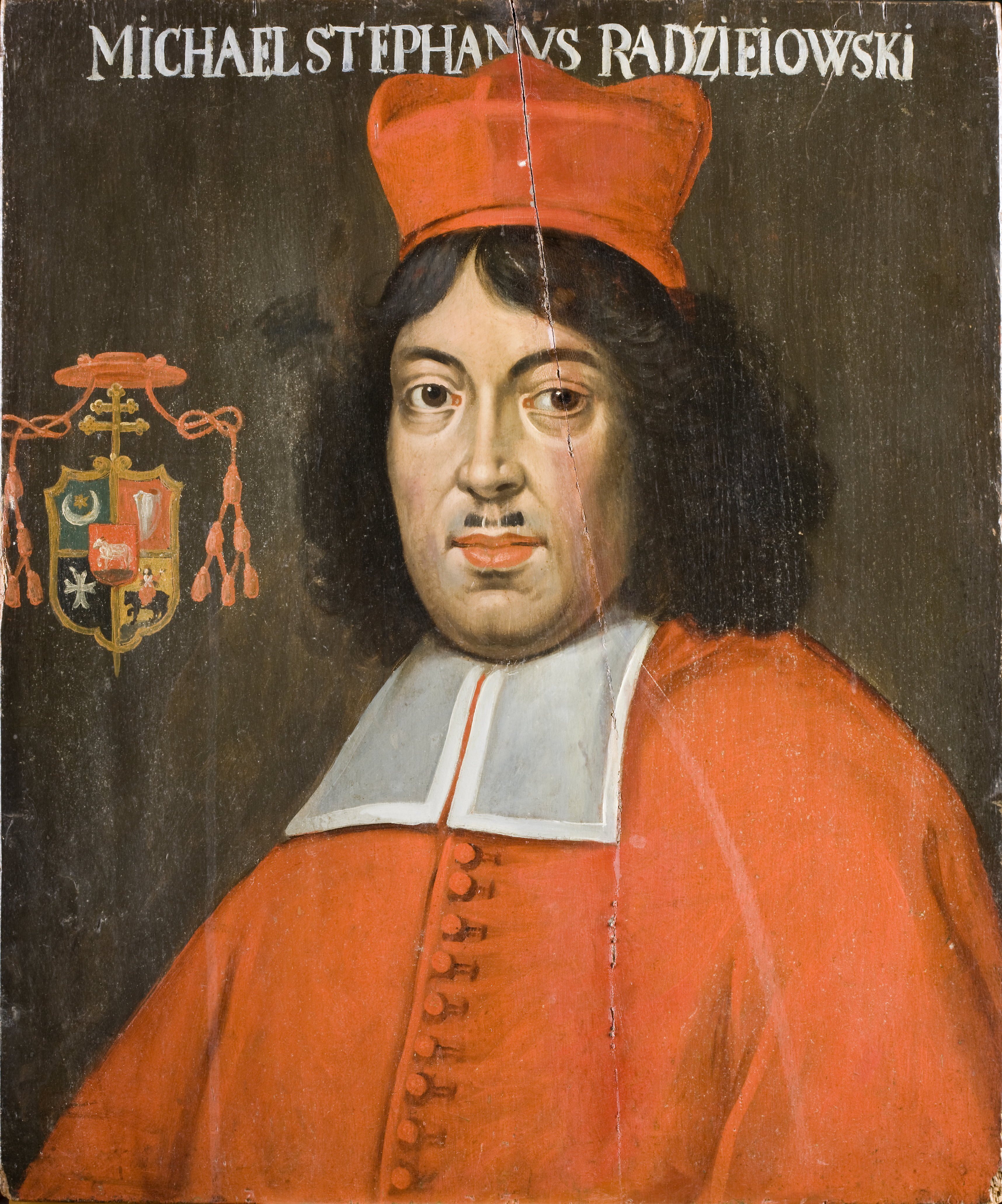 Bröstbild, fas vänster. Svart lockigt hår. Röd mössa, röd krage, rabatkrage. Mörk bakgrund, till vänster fyrdelad vapensköld under röd kardinalshatt, i fält 1: stjärna över halvmåne, i fält 2: tand?, i fält 3: malteserkors, i fält 4: kvinna ridande på björn?, i hjärtskölden vit ko?. Inskrift: "MICHAEL STEPHANVS RADZIEOWSKI". På baksidan spår av text med krita. Pannån stadgad med ursprungligen två, nu en slana. Saknar ram.