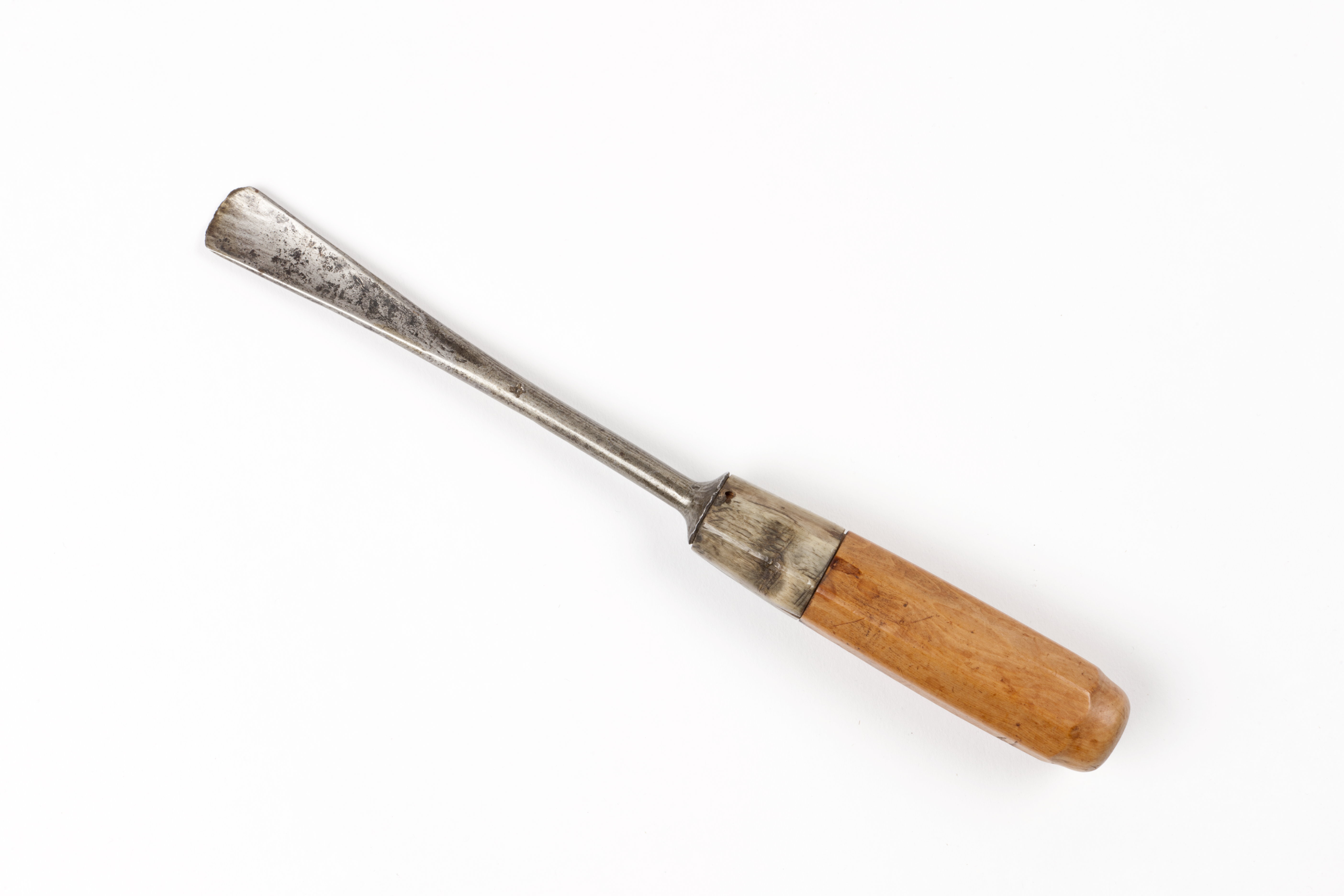 Bildhuggarjärn. Rund klinga. Tillplattad ände med rundad undersida och hålig ovansida. Rundad egg, slipad från undersidan. Vidgad bas. Skuret, åttasidigt skaft av buxbom. Hornring. Stämplat på klingan: ring med fyra vingar.