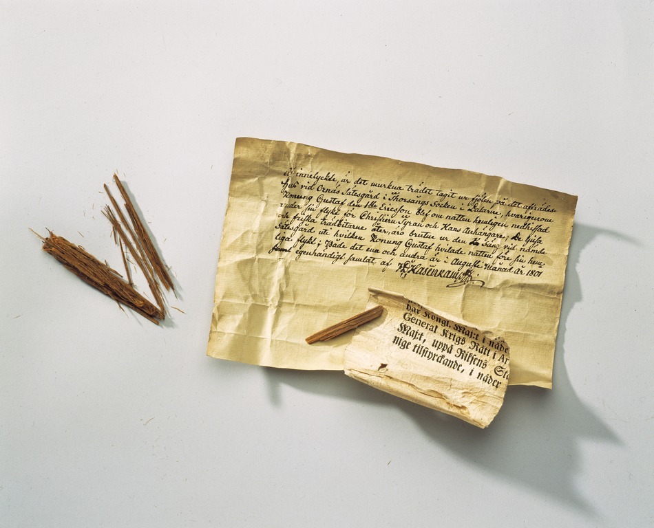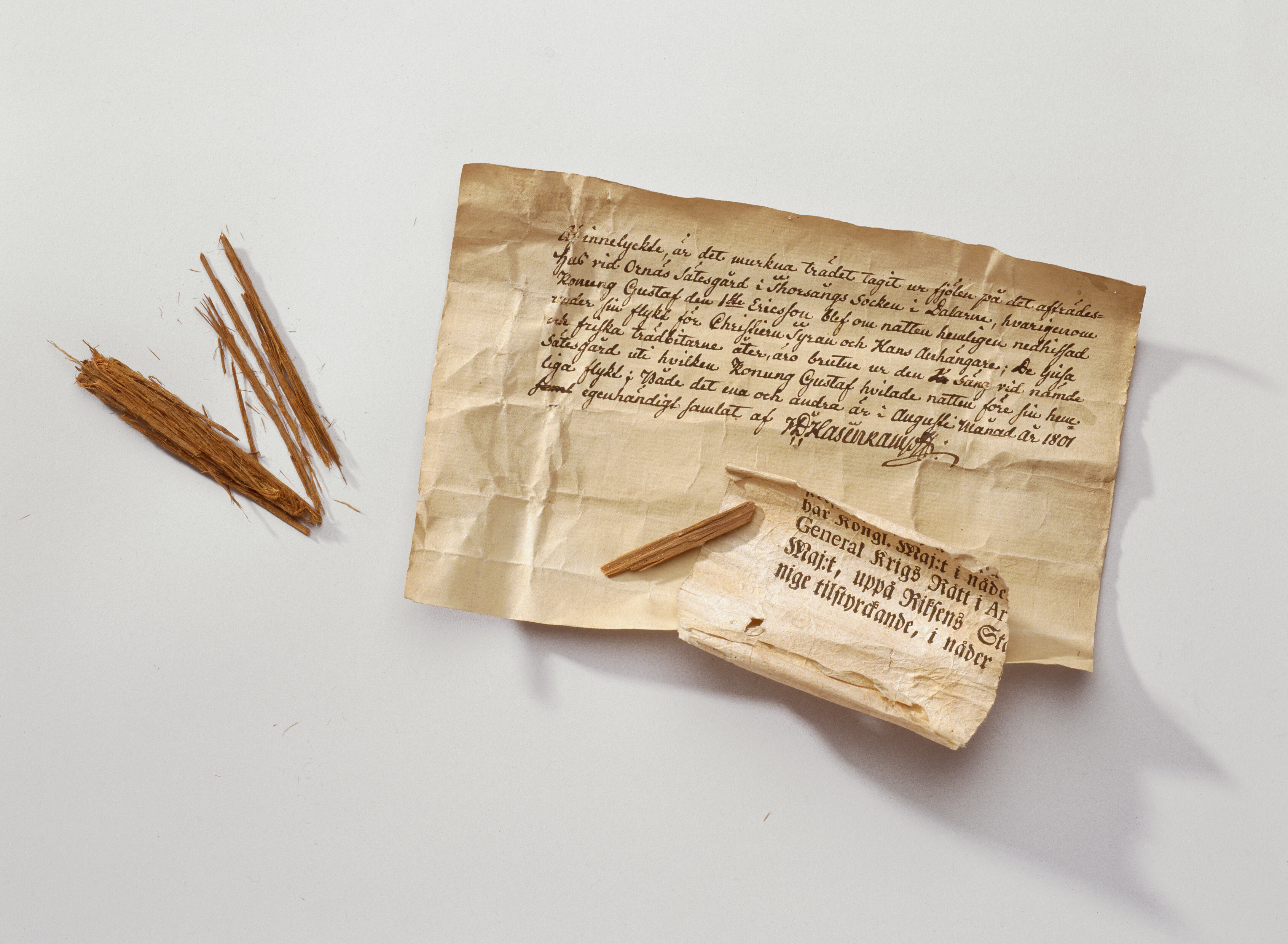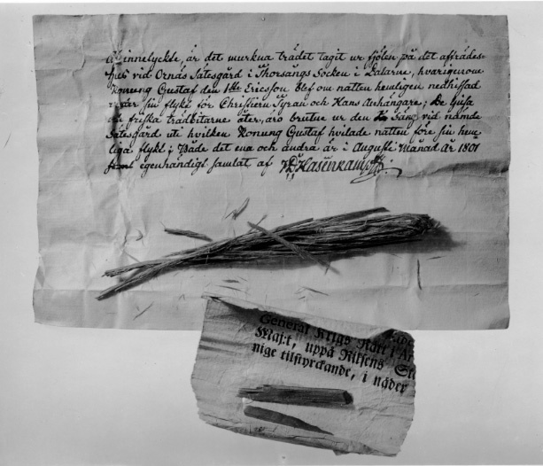 Inlagda i konvolut med påskrift: "Af innelyckte är det murkna trädet tagit ur fjölen på det afträdes- // hus vid Ornäs Sätesgård i Thorsångs Socken i Dalarna, hvarigenom // Konung Gustaf den 1tte Ericsson blef om natten hemligen nedhissad // under sin flykt för Cristiern Tyran och Hans anhängare: De ljus // och friska trädbitarna åter, äro brutne ur den Säng vid nämnde // Sätesgård, uti hvilken Konung Gustaf hvilade natten före sin hem-// liga flykt. Både det ena och andra är i Augusti Månad År 1801 // egenhändigt samlat av V.D. Hasenkampff."