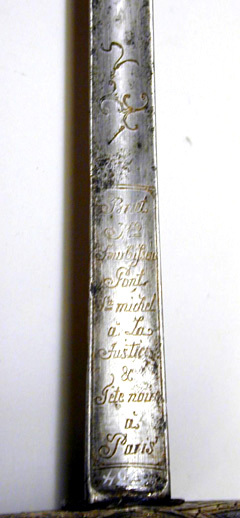 Fäste av silver av olika färg, dekorerat med fasettslipade, runda nithuvuden mot prick och mönsterpunsad bakgrund. Knapp oval med rund, profilerad nitknapp. På knappen arton nithuvuden, slät hals. Platt parerbygel, mittpartiet bredare, på varderasidan elva nithuvuden, över och nederdelen med fasetterade fyrkanter, snidade ur handbygelns gods. Kryss rektangulärt, nio nithuvuden. Bakre parerstång med droppformig, svagt nedåtböjd ytterände, på stången snidade fyrkanter som på handbygeln. Fingerbyglar små med punsad dekor. Parerplåtar njurformiga, insidan med på vardera sidan arton fasetterade nithuvuden samt kantbårder av fasetterade fyrkanter, utsidan med yttäckande punsad och graverad dekor med åttabladig blomma på mitten av yttre och inre halvan. Kavel med rundat, fyrsidigt tvärsnitt, utmed sidorna elva fasetterade nithuvuden, kantbård av fyrkanter samt mycket smal repstavskant. På kavelns nedre krans och främre fingerbygelns insida stämplar: årsbokstav krönt P (Paris 1787, Carré s.137). spegelmonogram L (kontrollören Henri Clavel 1782-1789, Clavel 1782-1789, Carre s.124) samt otydlig stämpel: BA (okänd mästare). Klinga treeggad, s.k. stukatklinga, avbruten vid spetsen. Etsad dekor på starka delen, rankor och enkel trofégrupp, på insidan vid fästet etsad signatur: "Briet // M:d // fourbisseur // Pont // S:tt michel // a La // Justice // & // Tete noire // a // Paris".