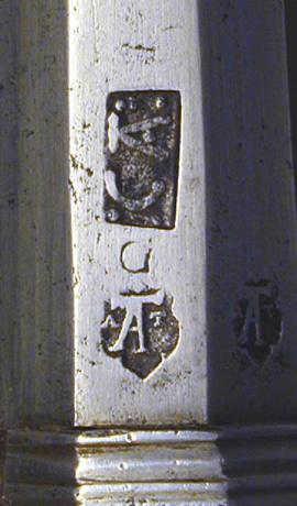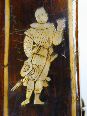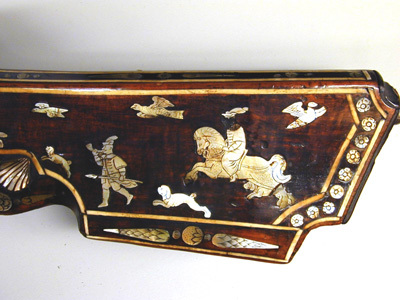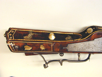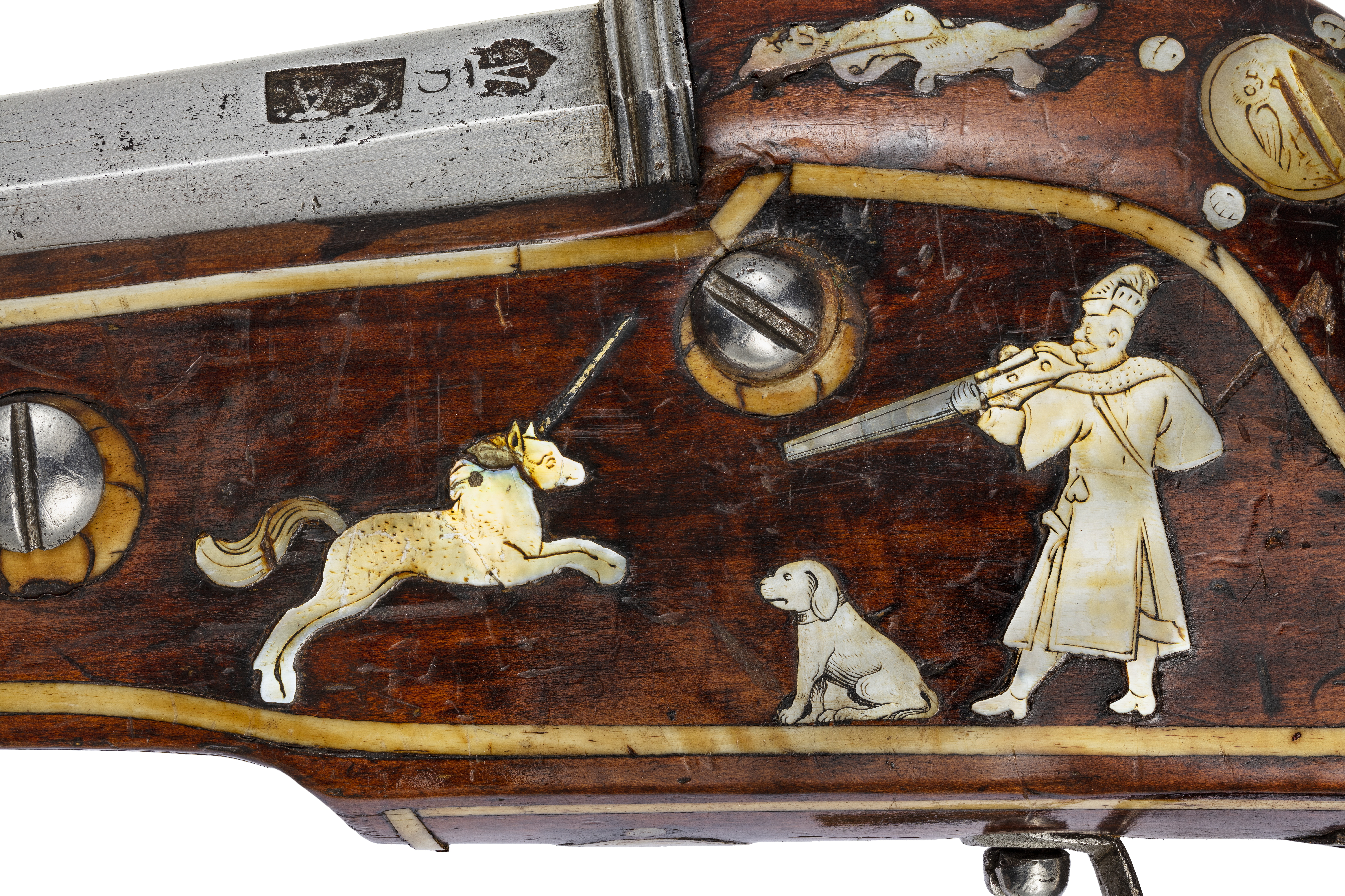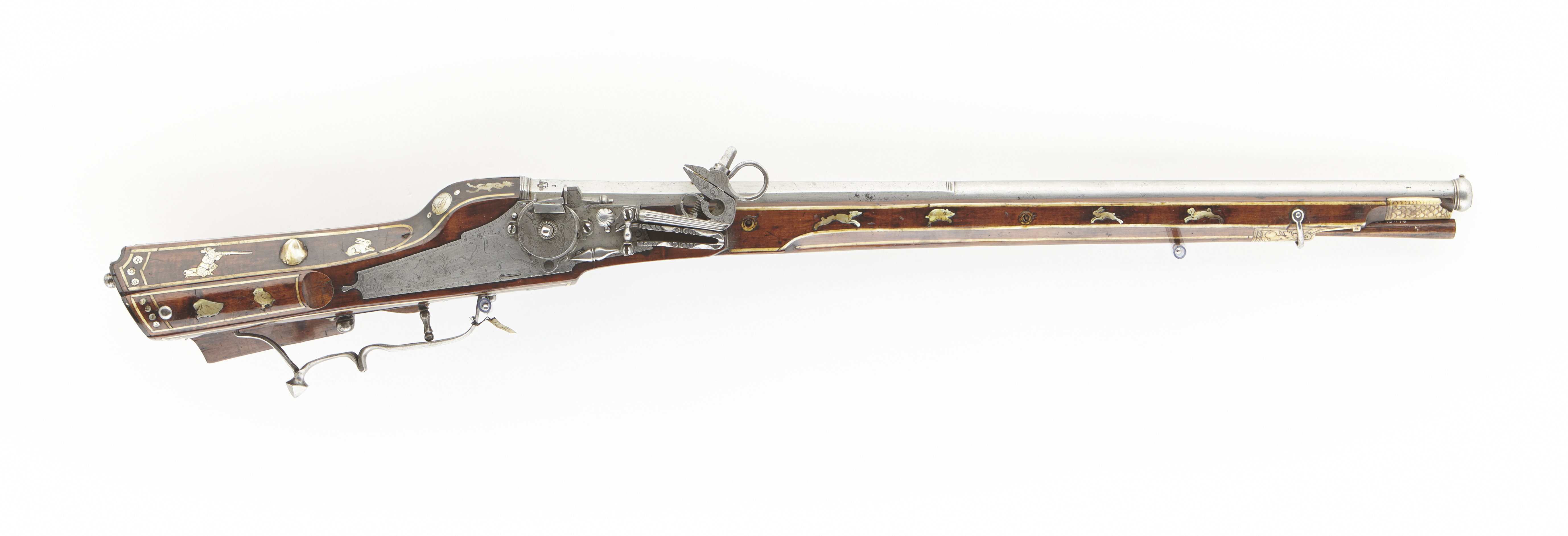 Rund, slätborrad pipa med kantig kammare, profilerad list på de tre övre faserna vid övergången, Rektangulärt svansskruvblad, svansskruven framtill i form av en platta av pipans form, likaså profilerad på de tre övre faserna samt halva fasen därintill. Svarvad, klotformig mynning. Vid pipbasen på de tre övre faserna stämplar AT ligatur flankerat av A och T i sköld (LRK vägl. 1921:334), därframför på sidofaserna bokstavsstämplar G T, på v sidofasen en rektangulär stämpel C A (1921:368). Riktmedel: Högt sikte av mässing liknande en kanonlavett, rektangulär, framåt sluttande siktplatta med litet siktstreck i bakkanten, S-formigt svängda gavlar. Knoppkorn av mässing på mynningskulan. Fästning: Tre häften. Pipan fäst med krysskruv underifrån (främre varbygelskruven), två pipstift av trä (ej ursprungliga) samt framtill rembygelns skruv. Hjullås med plant låsbleck, baktill utskjutande i litet blad på smal hals. Graverad dekor, kantbård med flätmönster, bakom hjulet en hjort och en räv(?) springande mot varandra. Utvändigt hjul täckt av hjulkapsel med plan ovansida, fästskruvar kl. 3 och 9, nertill en utskjutande volut med ett runt hål. På kapselns ovansida graverad dekor, flätband med krysskraffering samt två från varandra vända huvuden i hjälmar(?), det högra skäggigt. Fängpanna med svängd gavel, låg krutskärm, fängpannelock med hög karm, armen välvd och avslutad med en tryckt lökkupol, tryckknapp med balusterformig hals och musselformigt graverat, välvt huvud. Hane med rak kropp med fyra längsgående välvda lister på utsidan, öppen, ringformig hals, baktill övergående i s-formigt svängd, mycket tunn arm, lös överkäke med ringformigt, runt, slätt fingergrepp, graverad drakdekor på hals och käkar, käkskruv med smalt, högt, fyrsidigt huvud. Hanfjäder med fyra skålningar i kanterna samt graverad bladdekor, långt, välvt, balusterformigt, i änden spetsigt blad, balusterformig hanstudel. Fästning: Två låsskruvar. Balusterformig avtryckare på långt avtryckarbleck, främre änden i vinkel, bakre änden rundad. Baktill på blecket en skjutsäkring med kulformigt huvud. Helstock av rödaktigt, lackerat trä, rak, tysk kolv med plan rygg, kolvlåda och vinge med volut framtill. Framstock med sluten laddstocksränna. Kolvlådelock av stockens trä, nedskuret till grepp framtill, låsning med fjäder, lyftknapp med välvt huvud baktill på locket. Kolvänden täckt med horn, stödkula av stål. Inläggningar i form av lister av ben samt talrika pärlemorfigurer (där ej annat anges). På kolvänden oval platta med gående man med musköt på axeln, bantlär, hatt med fjäder, mustasch. Plattan flankerad av fyra små runda pärlemorplattor. På kolvlådelocket en uggla samt en hare slagen av en rovfågel, baktill fyra runda pärlemorplattor. På kolvsidan ovanför fängpannelocket en knäböjande skytt med luntlåsbössa i liknande dräkt som mannen på kolvänden, framtill på kolvsidan en liggande hare, mellan skytt och hare en hög, snäckformig pärlemorplatta, baktill tre runda blomplattor. På kolvryggen blom- och bladplattor, vid svansskruvbladet en benplatta med ett skäggigt ansikte, på sidorna därintill runda plattor med stork och uggla, flankerande svansskruvbladet två satyrer(?). På anslaget en ryttare i lång, polsk rock (ansiktet saknas), en gående jägare som blåser i jakthorn, beväpnad med spjut, mustasch, liten hatt med fjäder, mellan ryttaren och den andra jägaren en samt framför den sistnämnde ytterligare en hund, längst fram en räv, upptill tre flygande fåglar. På vingens volut en välvd, musselformig platta. Två ringformiga låsskruvbrickor av ben, bakom den bakre plattan en stående man som siktar med en luntlåsbössa mot en enhörning, han har mustasch och är iförd lång, pälsbrämad rock och liten mössa med fjäder, vid sidan en sabel. Mellan mannen och enhörningen en sittande hund. Mellan främre låsskruvbrickan och bakre pipstiftbrickan en löpande hund. På stockens undersida framför krysskruven en rund platta med fågel, flankerad av fyra rundlar. Därframför en stående kortklippt man, profil h, jacka med gåsbröst, korta skört och axelkarmar, pipkrage, vida byxor med knärosor, korta mjuka stövlar(?), värja vid sidan, i h hand en rundkullig hatt med fjäder, i v hand ett glas(?). Framför mannen ett otydligt ornament liknande en hammare och därbakom ett pilkoger. På framstockens h sida hund, vildsvin, hare och hund, de två bakre löpande framåt, de övriga bakåt. På v sida, hund, björn, hund och räv, alla löpande framåt. Överrörka och näsband av ben med blad- och banddekor. Varbygel av stål med bandformig främre del med fasade kanter, därbakom uppåt-nedåtsvängd till vinklat fingergrepp, vid bakre stolpen en sexkantig, spetsig kula, bakre stolpen vikt in vinkel till spets, inslagen i stocken. Vid överrörkan en ej ursprunglig rembygel av stål fäst med pipskruv. Tillbehör: Ej ursprunglig laddstock av obehandlat trä med längsgående ådring, l: 627 mm,