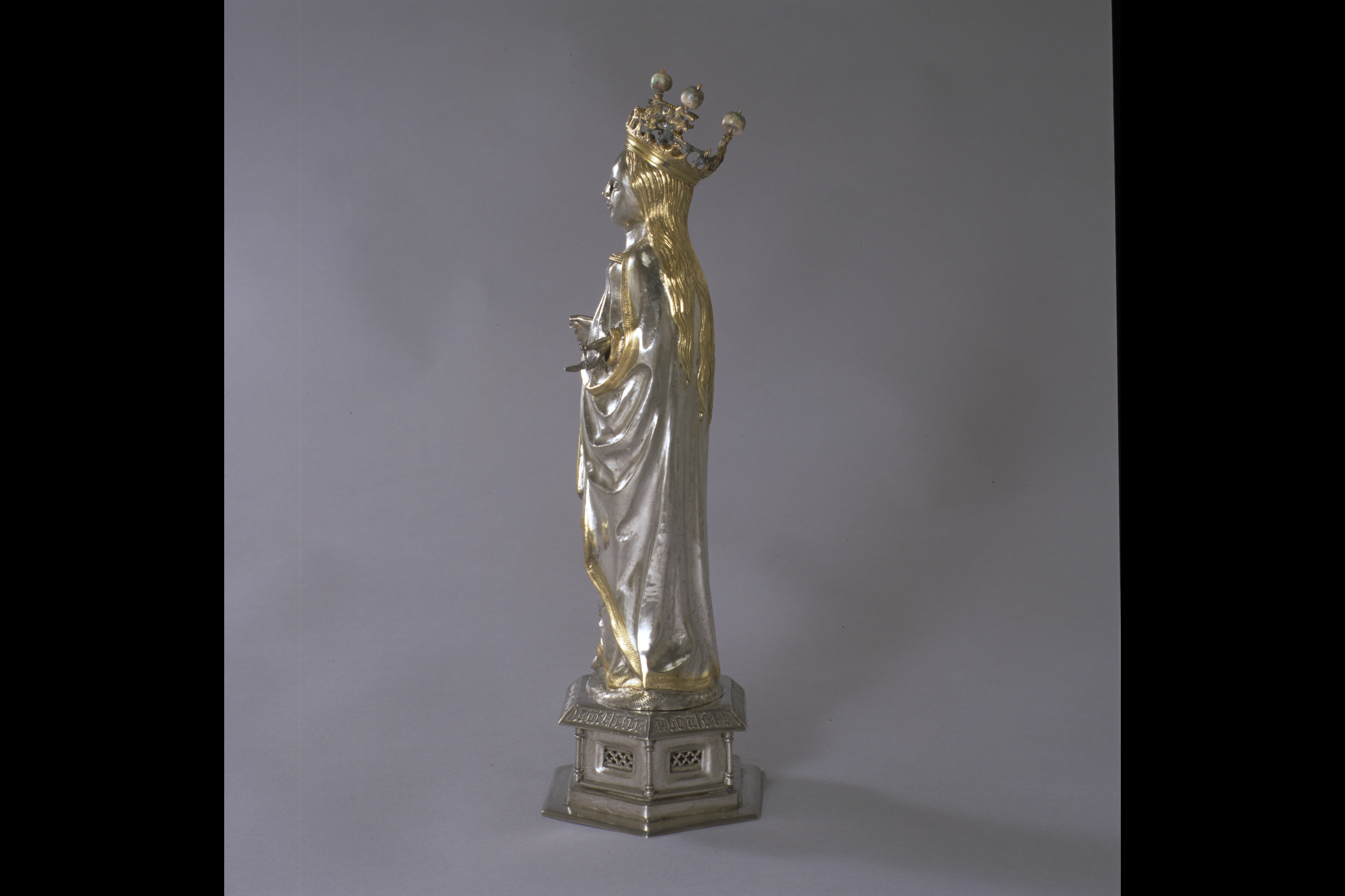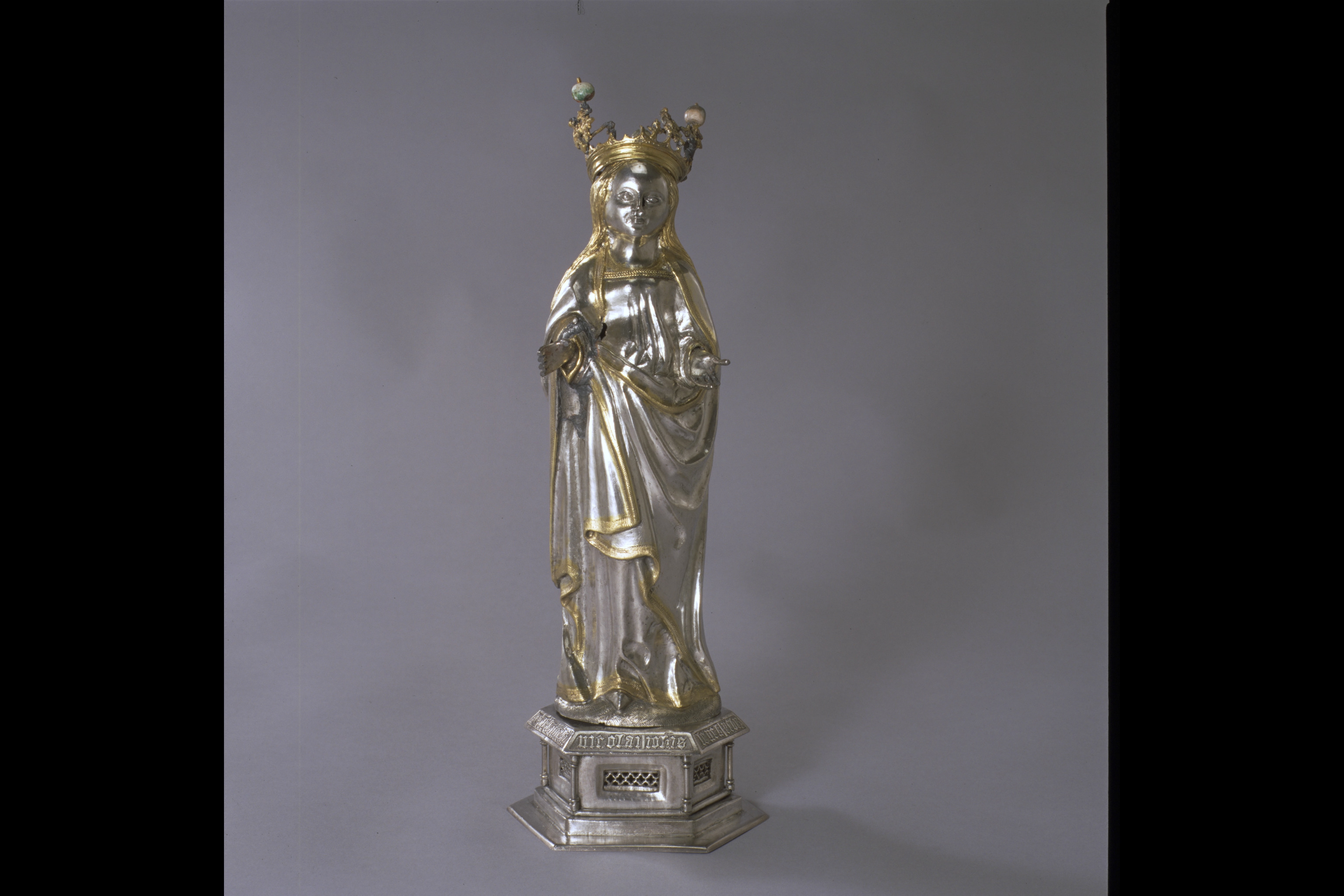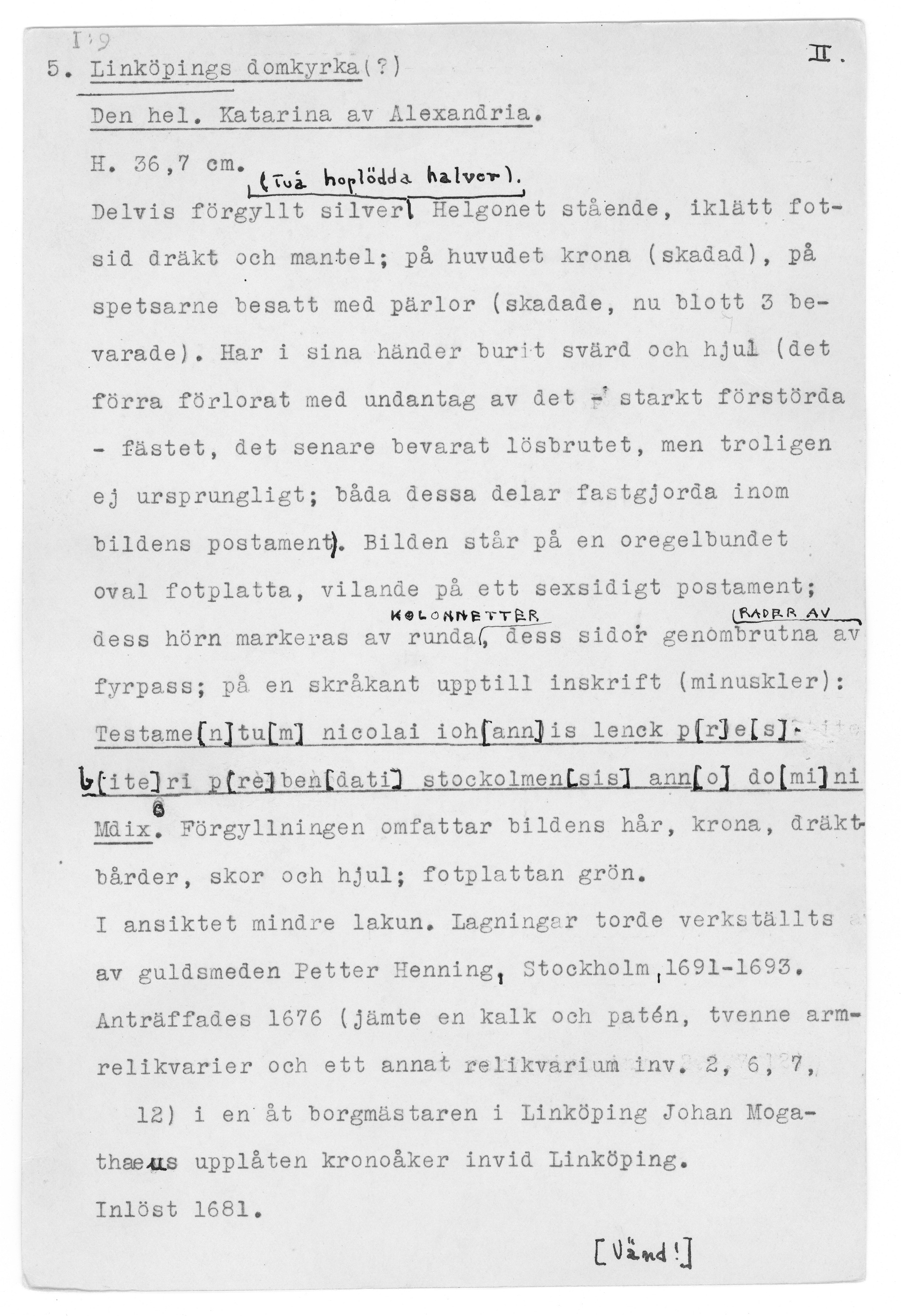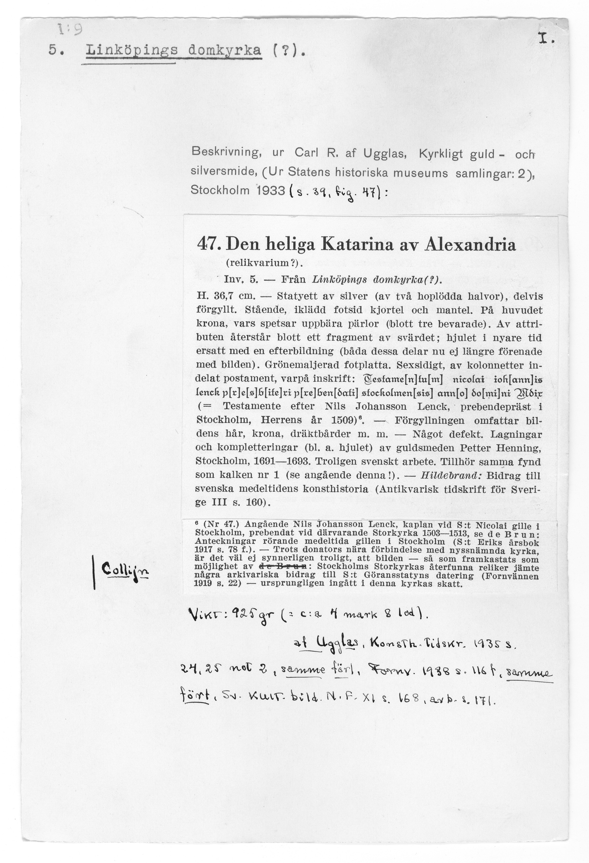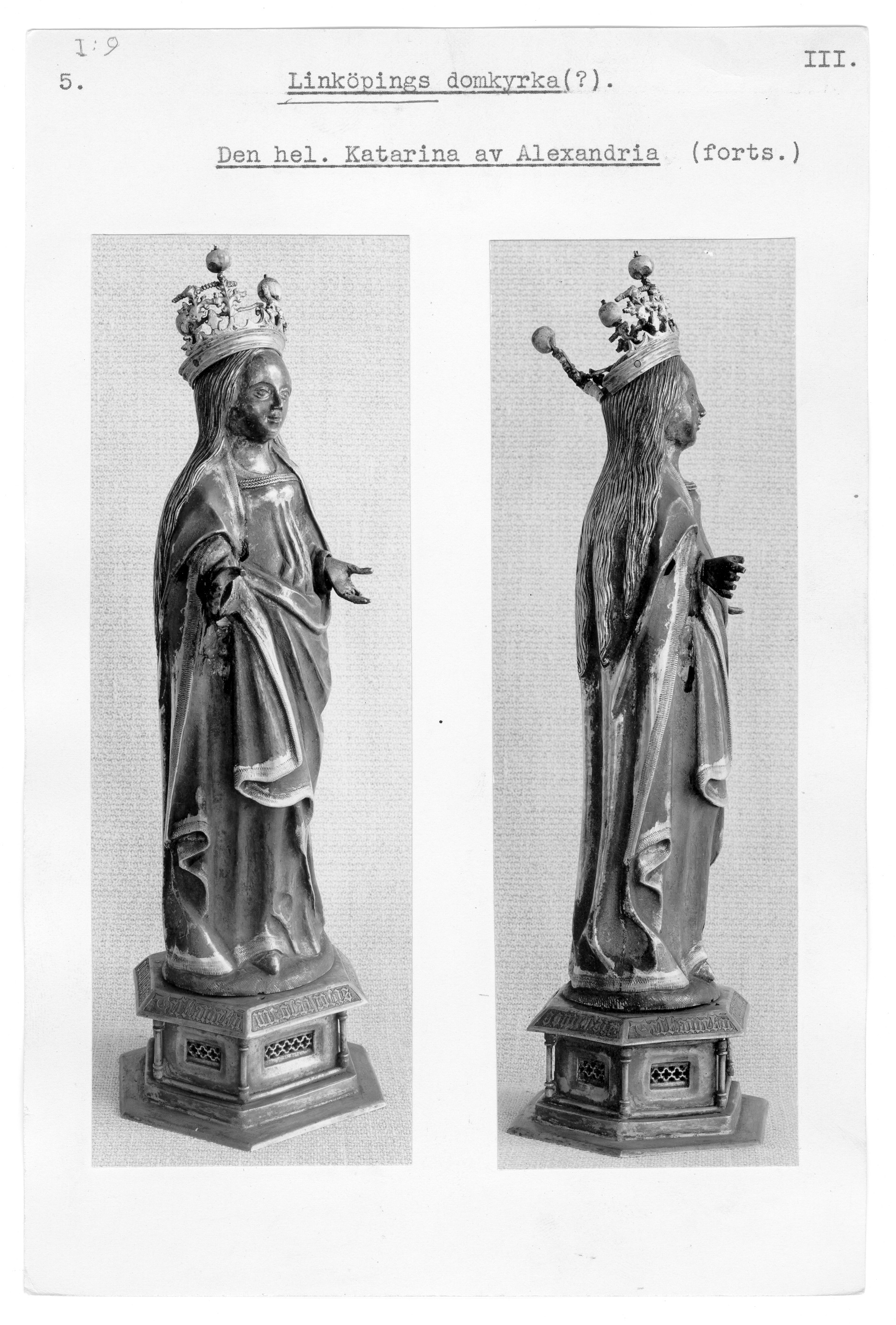 Relikstatyett föreställande Katarina av Alexandria. Till figuren hör även hennes attribut hjulet, tillfogat i sen tid. C.R. af Ugglas, Kyrkligt guld- och silversmide, Sthlm 1933, s. 39; G. Mörkfors, Linköpingsskatten. Linköping 700 år. Medd. fr. Östergötlands länsmuseum 1987, s. 46 ff; Domkyrkans medeltida inventarier. Å. Nisbeth & I. Estham, SvK 225 Linköpings domkyrka III, Sthlm 2001, s. 82.