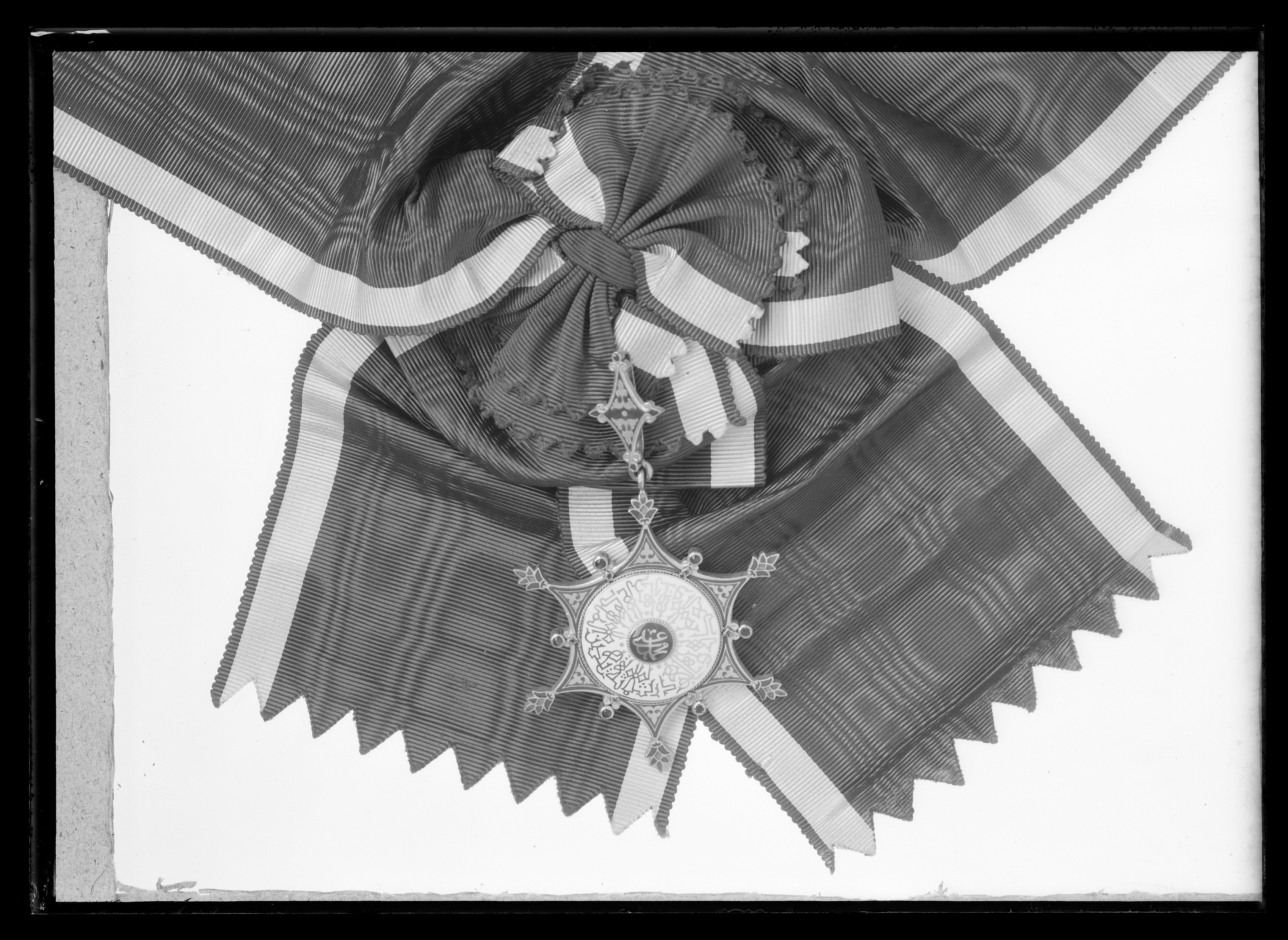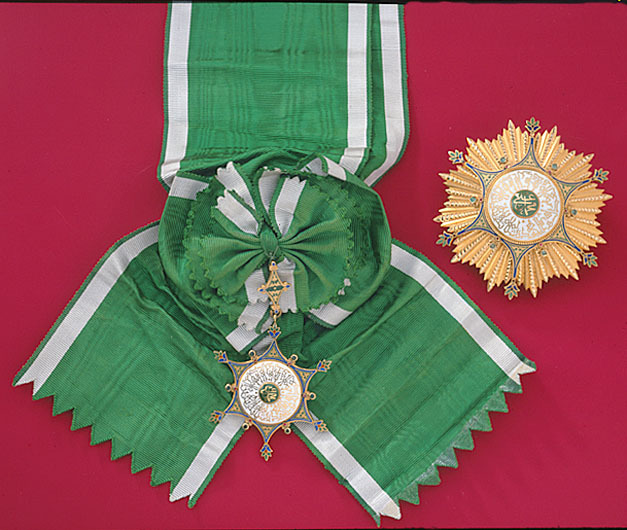 Sexuddig guldstjärna med konkava sidor. Rund, svagt välvd, vitemaljerad medaljong med arabiska skrifttecken i guld, i mitten en rund, välvd platta täckt med grön emalj med guldskrifttecken, båda plattorna kantade med guldrepstav. Uddarna täckta med grön emalj, däri växtornament av guld, blå kantbård. På spetsarna bladornament täckt med blå, röd, grön emalj. Mitt på de konkava sidorna en liten fyrsidig, taffelslipad rubin i slät fattning, därutanför en rund, taffelslipad smaragd i slät fattning, båda fattningarna à jour. På det översta bladornamentet en fast ring, däri fäst rombiskt beslag med bladdekor av guld i grön emalj, på spetsarna bladornament med blå emalj. På baksidan bandbygel, stämplad: 1 skriftecken, 1 fågel (stork?), 3 W. Medaljongens frånsida konkav och blank, relieftext: "LATTES" samt tre stämplar: 1) skriftecken, 2) fågel, 3) C.