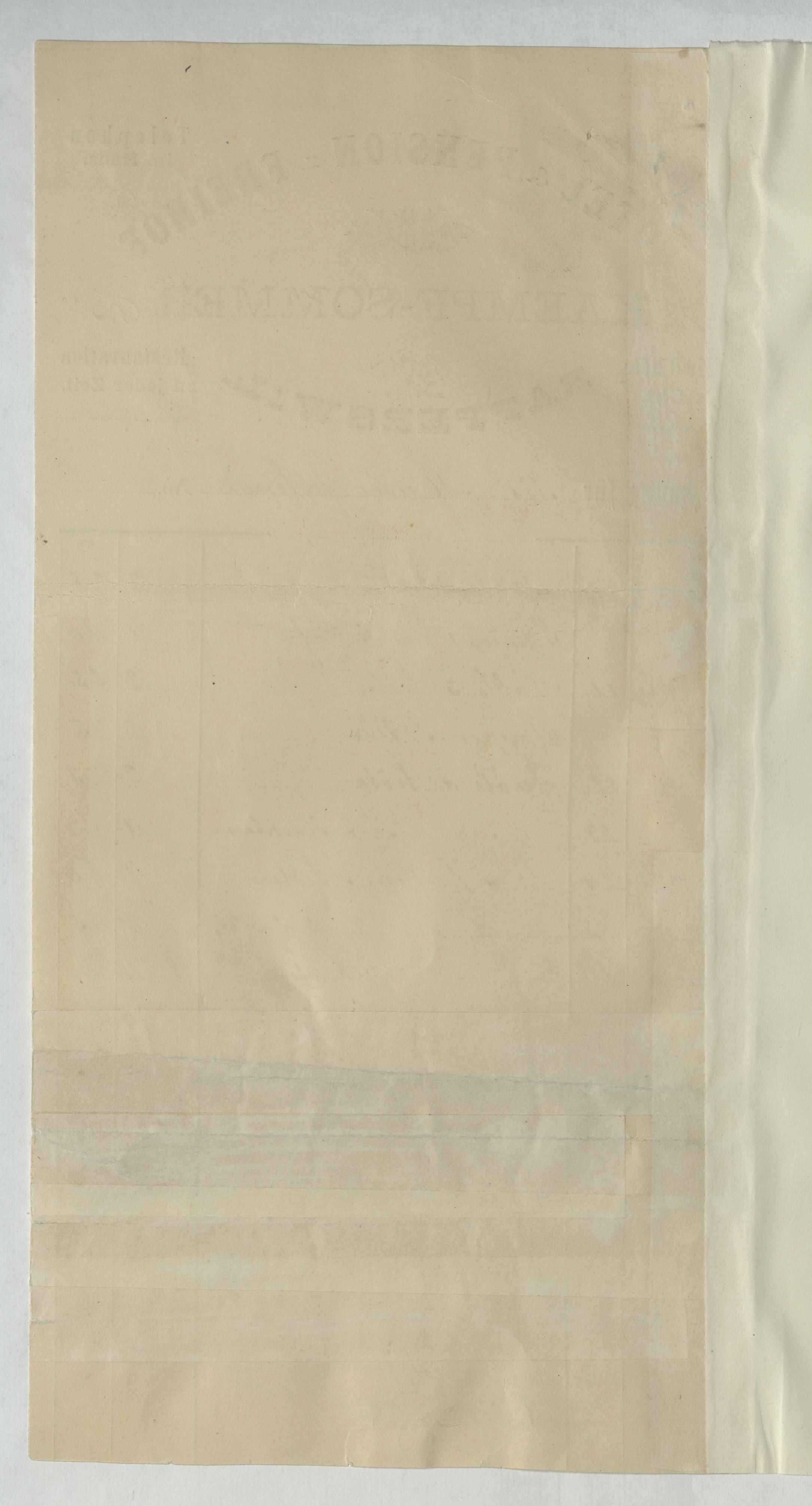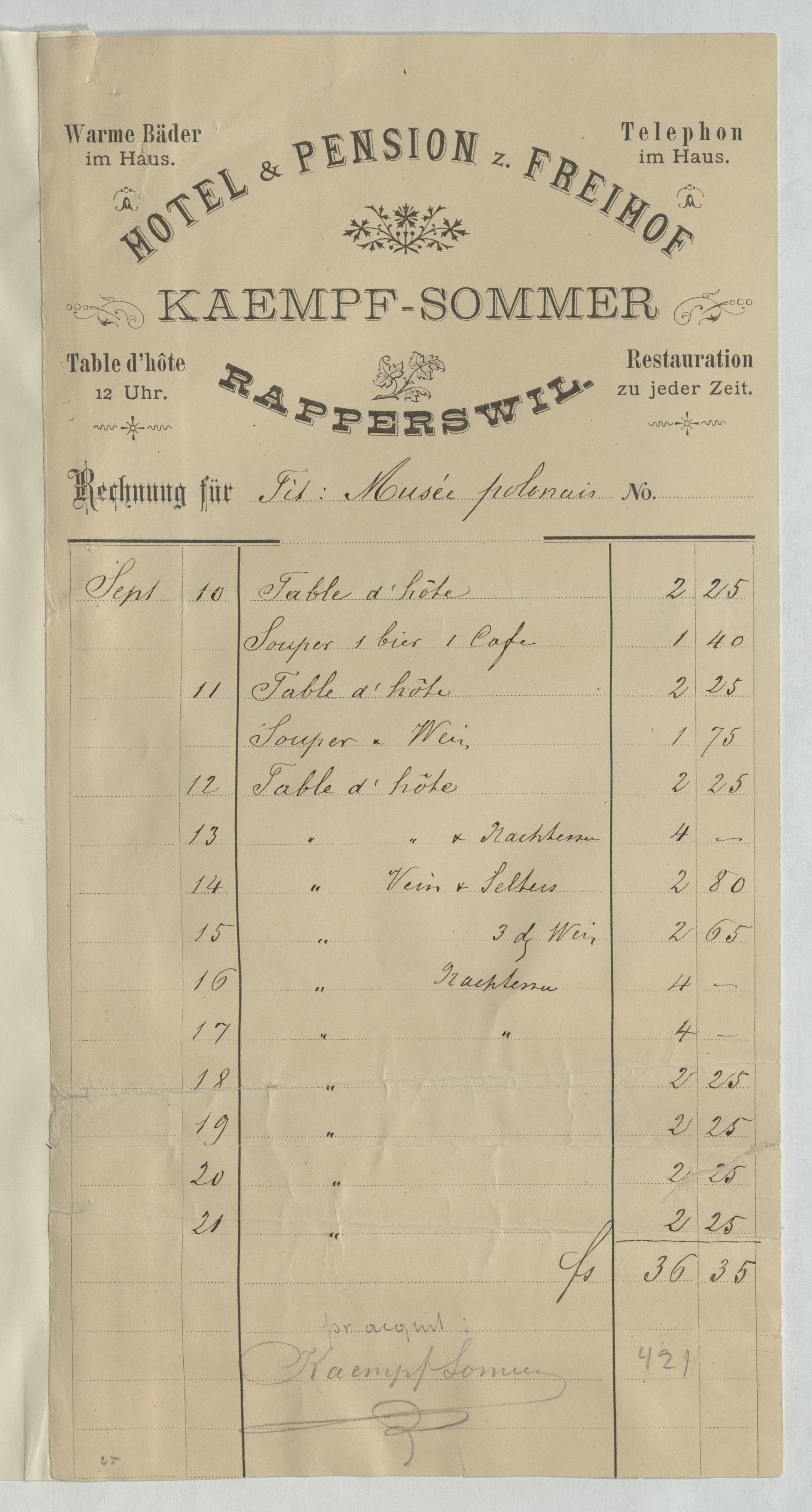 Kvitto från Kaempf-Sommer, Rapperswil. Hotel, Pension, Freihof