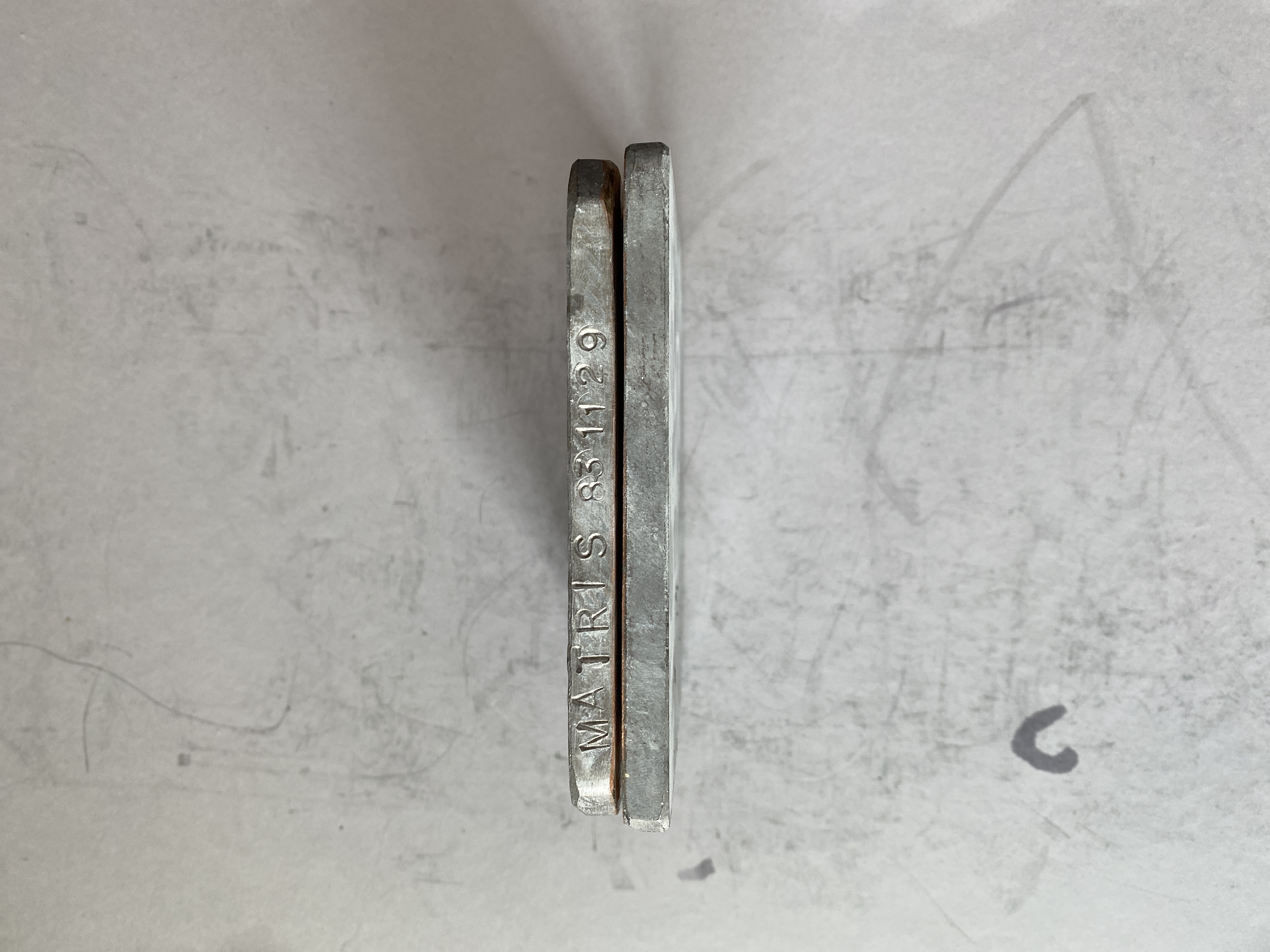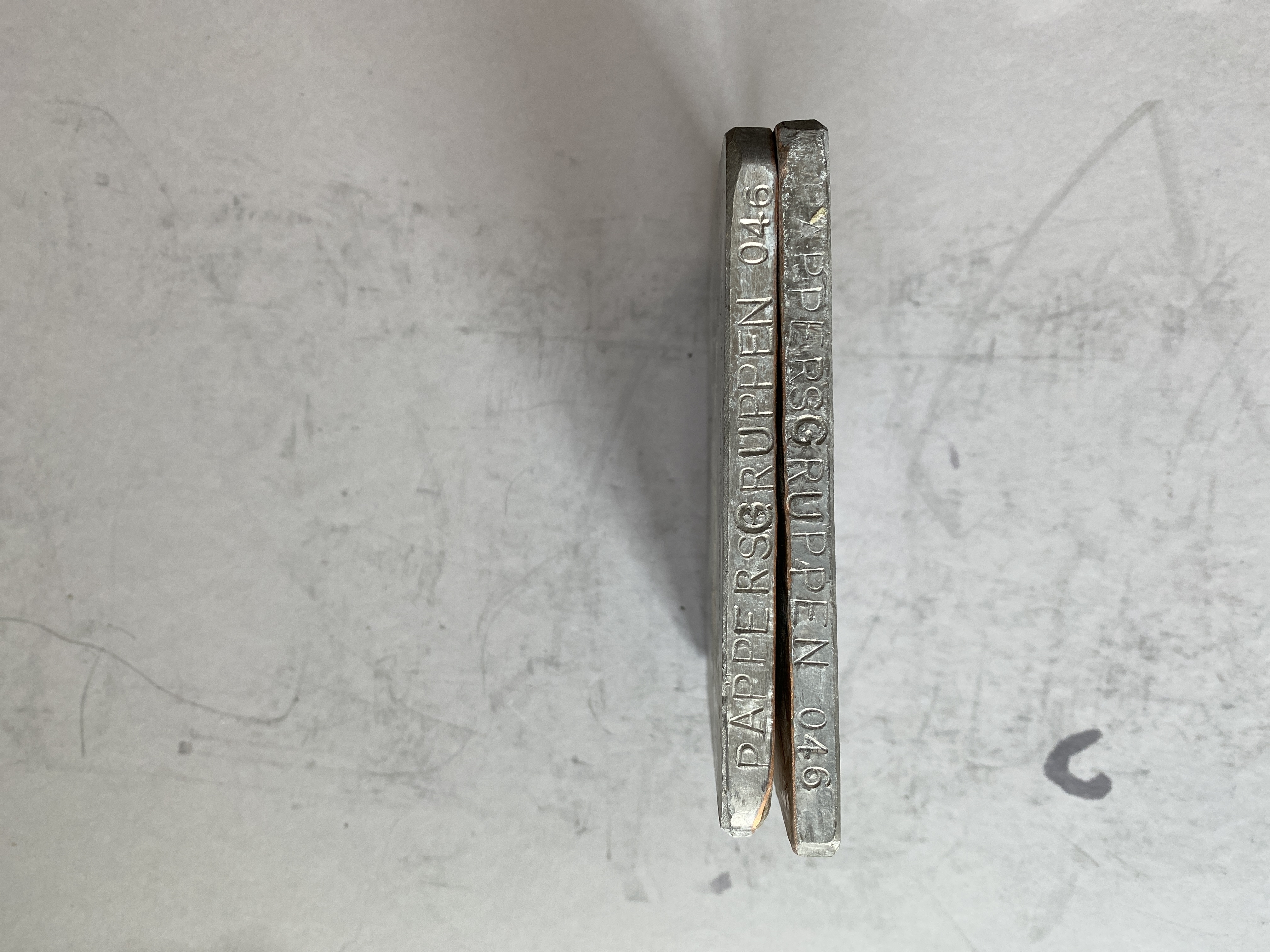 Pressplatta för vattenmärkestillverkning: "symbol med trianglar". 2 stycken. Obs. olika matris nr. på framsidan respektive på sidan av plattorna. Text på framsidan av plattorna: MASTER/MATRIS 840206/ Reg. nr 046. Texst på sidan: MATRIS 831129/PAPPERSGRUPPEN 046.