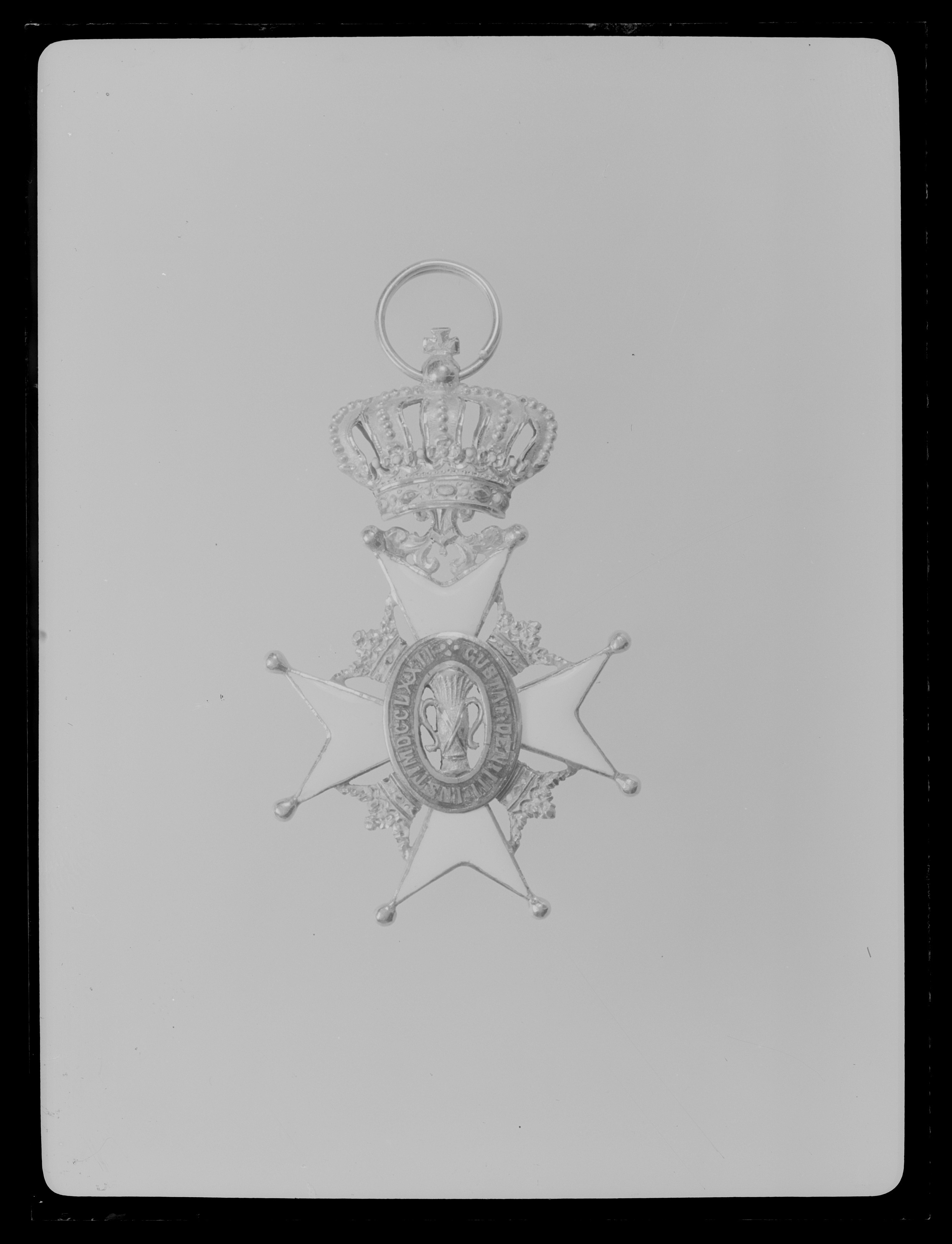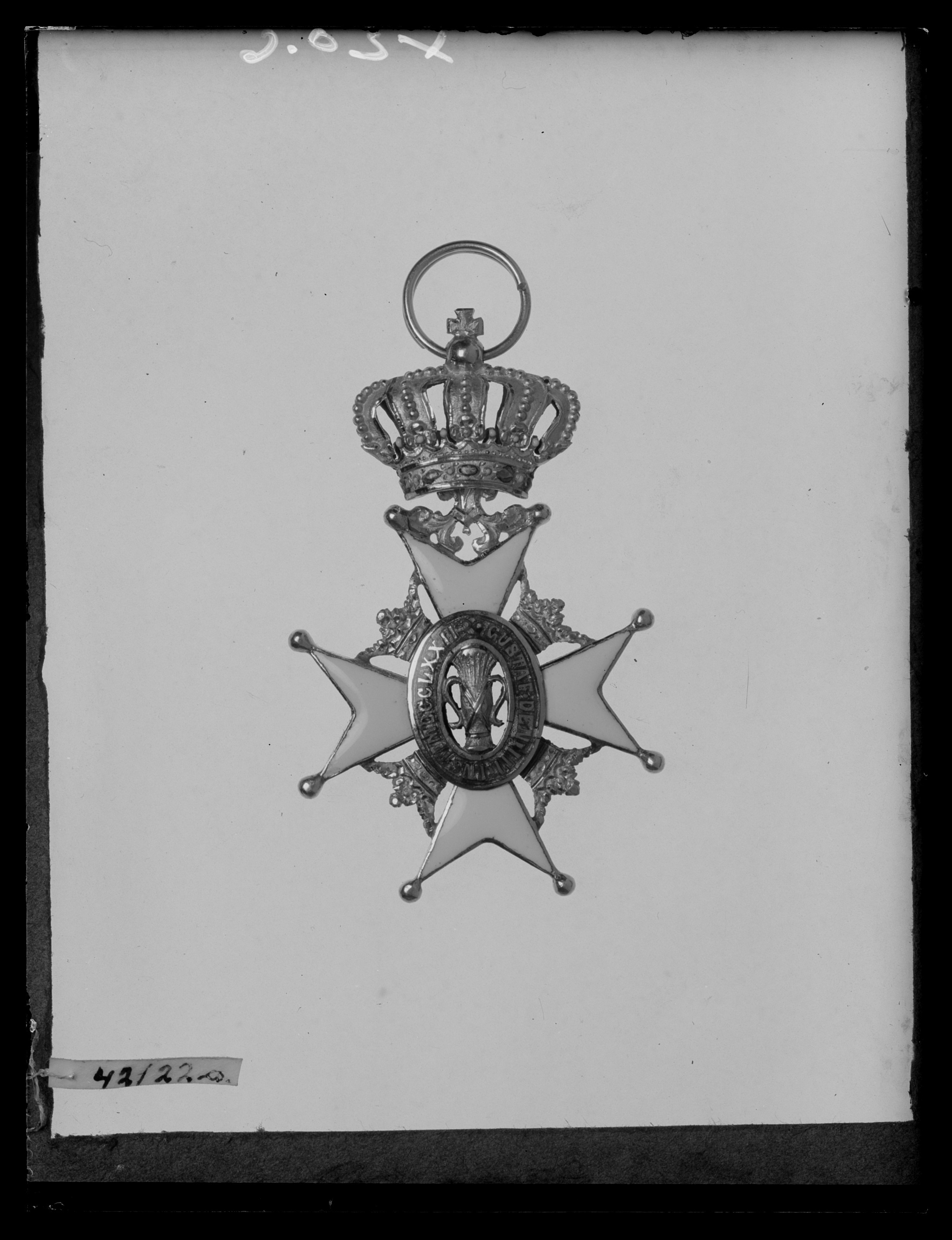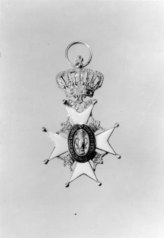 Vitemaljerat malteserkors av guld, kulor på spetsarna, mellan korsarmarna öppna kronor av guld. Genombruten oval medaljong, i mitten guldvase, däromkring oval ring täckt med röd genomsynlig emalj, guldtext: "GUSTAF DEN III INST. MDCCLXXII". Mellan den övre korsarmens spetsar ett bladornament av guld, däri fäst med scharner en kunglig krona av guld samt vit, röd och grön emalj. Igenom äpplet draget spiralformig rund bandring. Enligt inv. 1867 skall ha funnits etikett med påskrift "Hammerska tiden 1850", etiketten saknas.