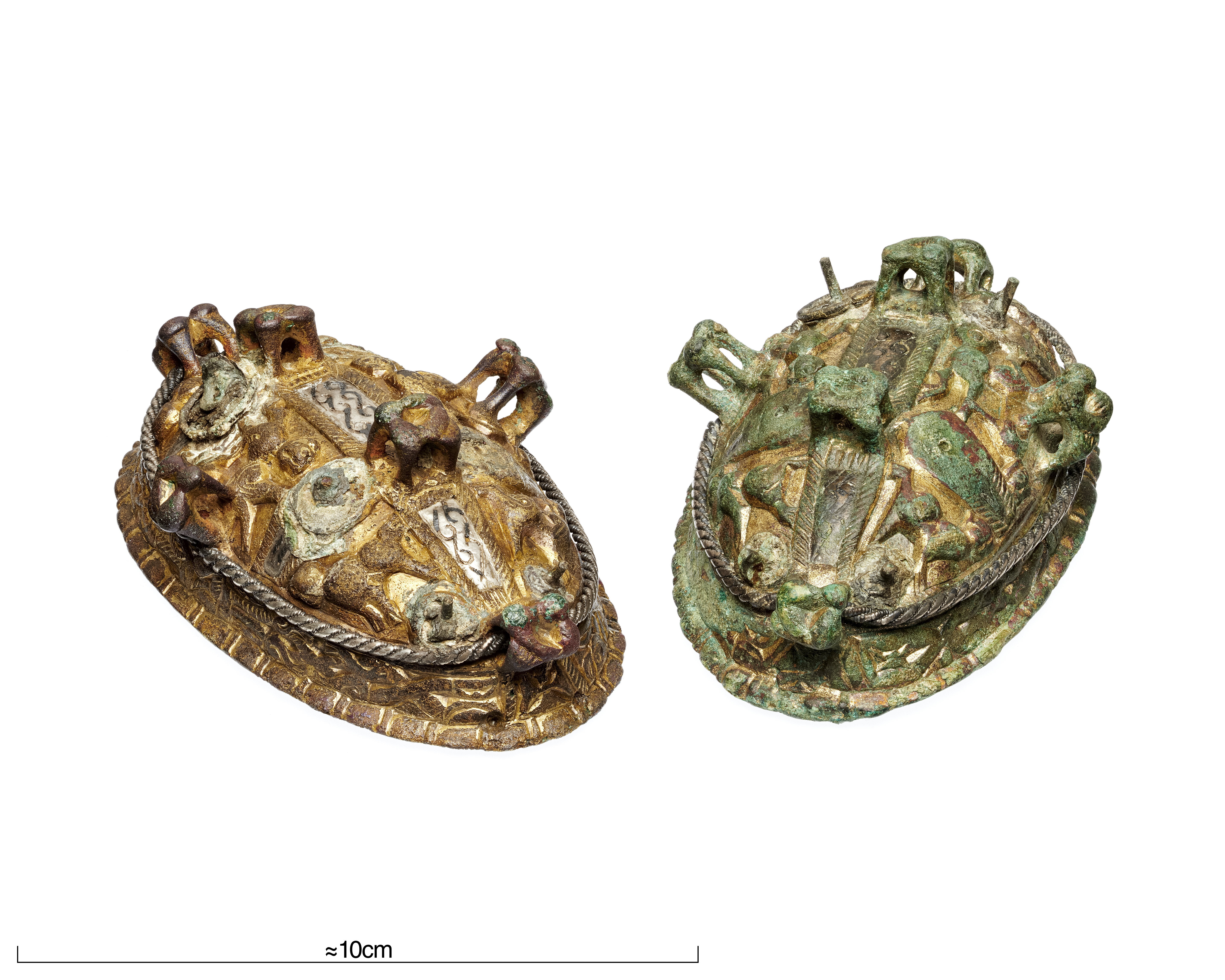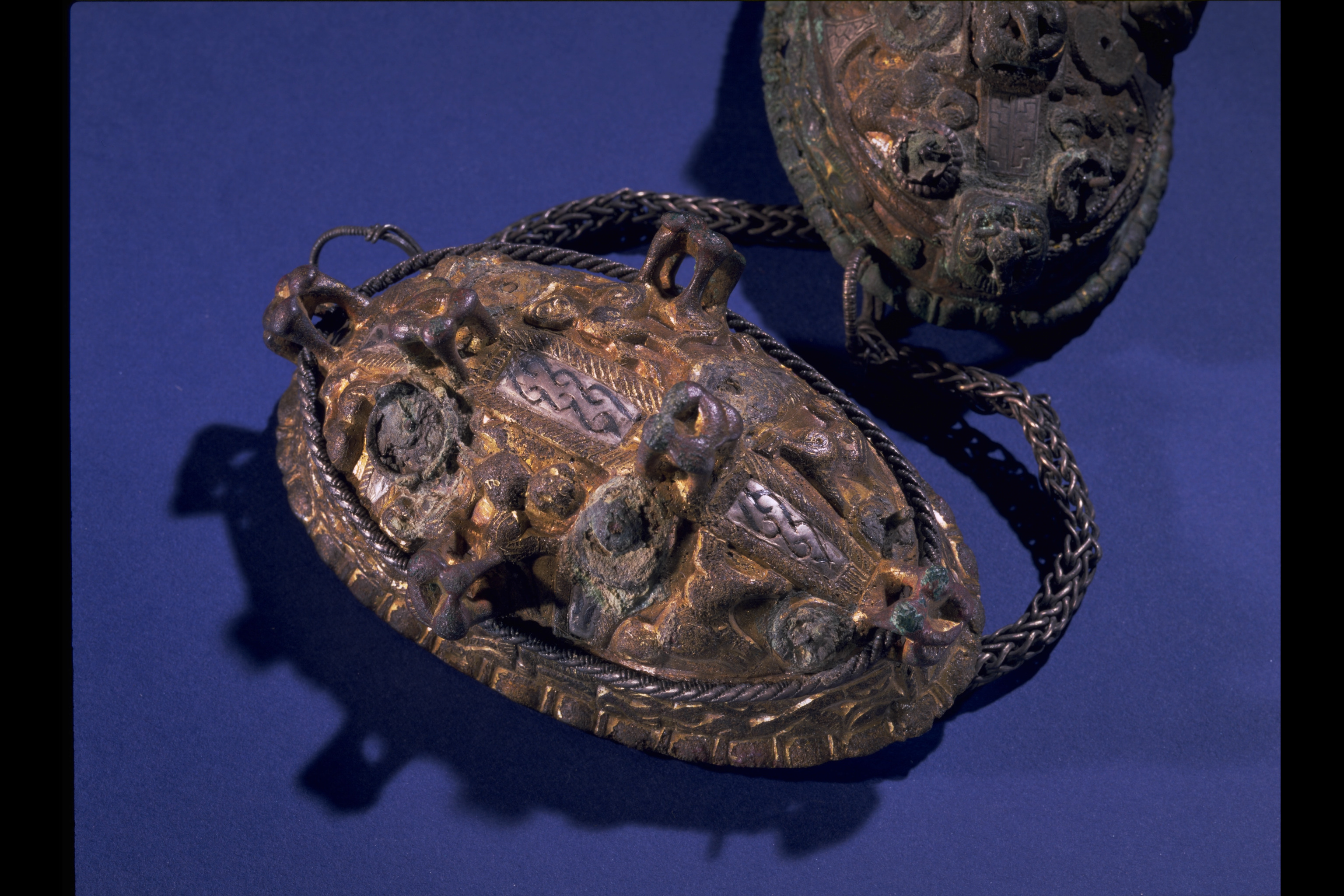 1 spännbuckla saknar bronsnål, vid kanten sammankorroderad med fragment av bronskedja. Andra spännbuckla har vid nålfäste fastsittande textilfragment