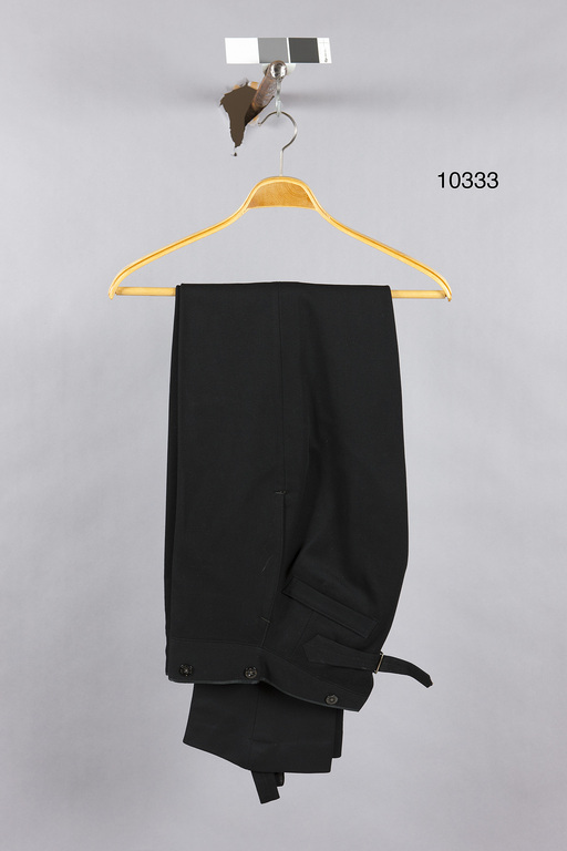 Långbyxor av svart kläde, knäppta med gylf med tre knappar, d: 14 mm med text: "FOR GENTLEMEN". Linning med sju knappar d:17 mm men i övrigt lika. Baktill V-format sprund, spänntampar med sölja. Höger bakficka 130 mm bred. Fickor i sidsömmen. Framtill på vänster framstycke en 70 mm bred ficka, kantad med svart siden och stickningar. Raka byxben med 165 mm långa hällor fastknäppta på insidorna. Foder upptill av svart siden. Framtill på insidan tamp med två knapphål avsedda att fästas vid gylfens breda överdel.