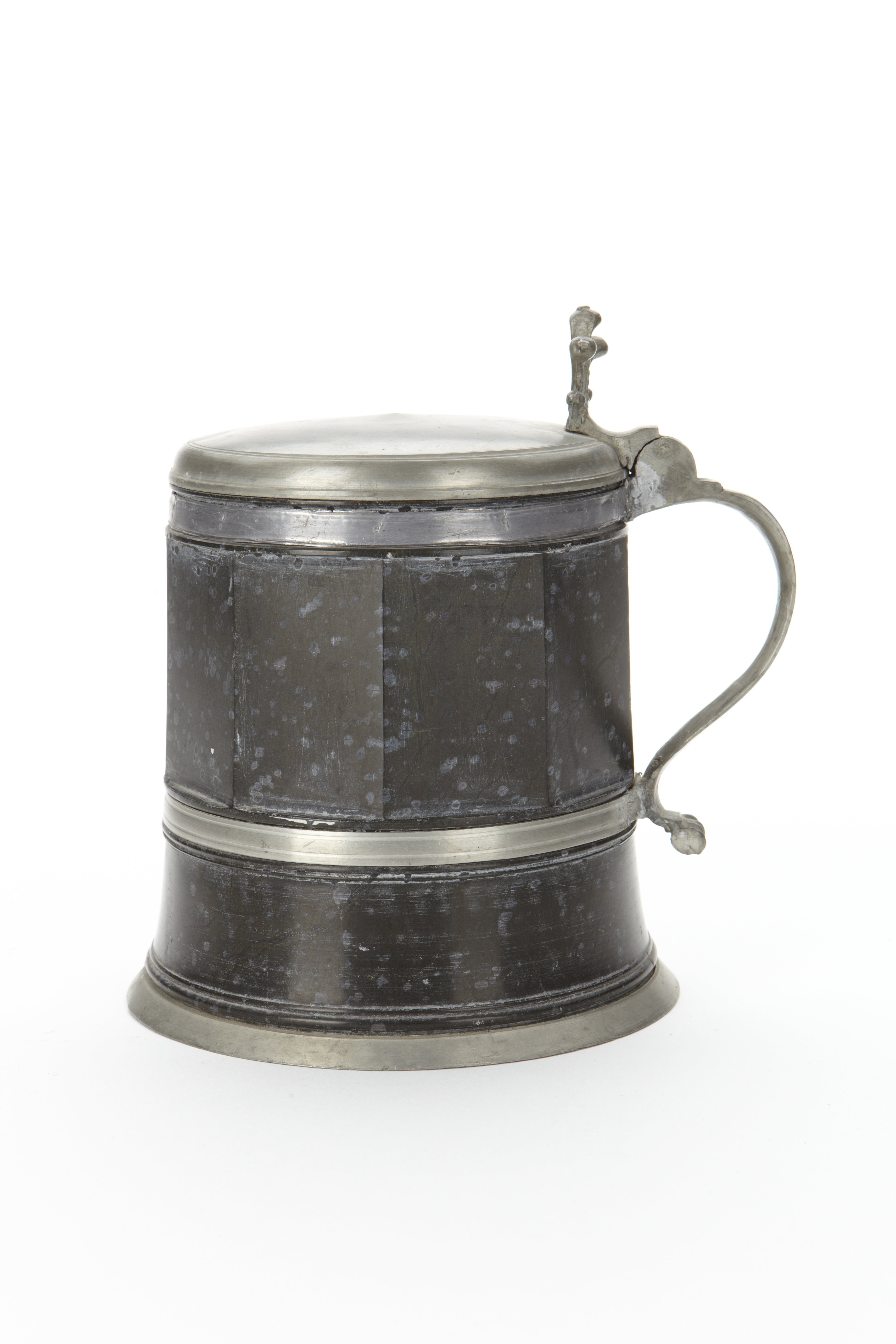 Lock, fotring, hänkel och band av tenn. Kannans nedre del cylindrisk, övre delen niosidig. Mycket låg fot .Locket svagt välvt med tumgrepp i form av akantusblad. Svängt handtag, sitter på två band av tenn, vilka löper i skåror runt kannan. Stämplar: Locket är trestämplat (Stämplarnas formering kan sägas vara typisk för Sachsen) mästarstämpel, stadsstämpel, mästarstämpel. Mästarstämpel: i en konturerad bårdförsedd sköld versalerna IS, blomsterkvist och talet 13 = möjligen Jeremias Schmidt. Stadsstämpel: i ett sköldformat fält versalerna MB över två korslagda hammare = Marienberg i Sachsen. Under botten möjligen ristat "R".