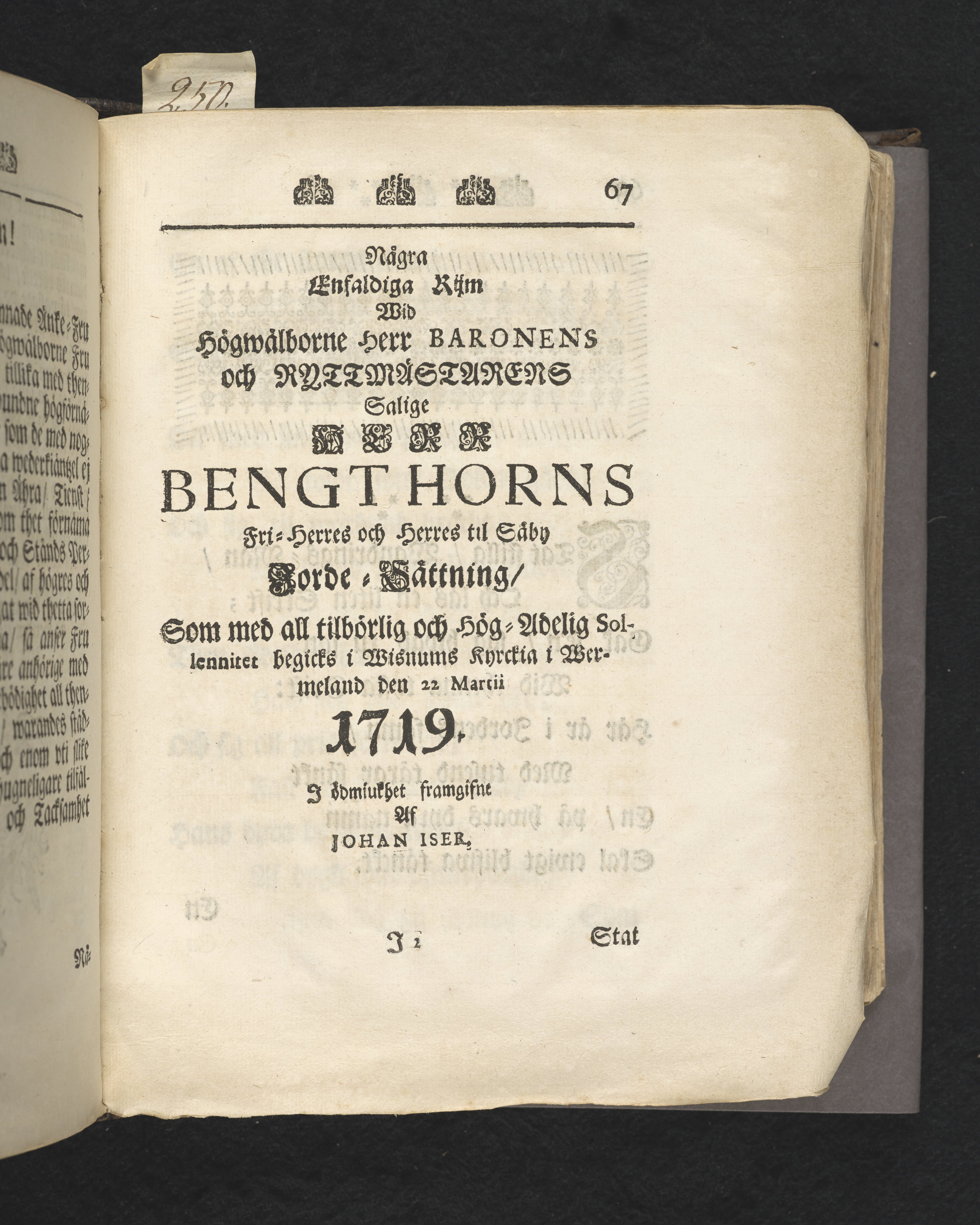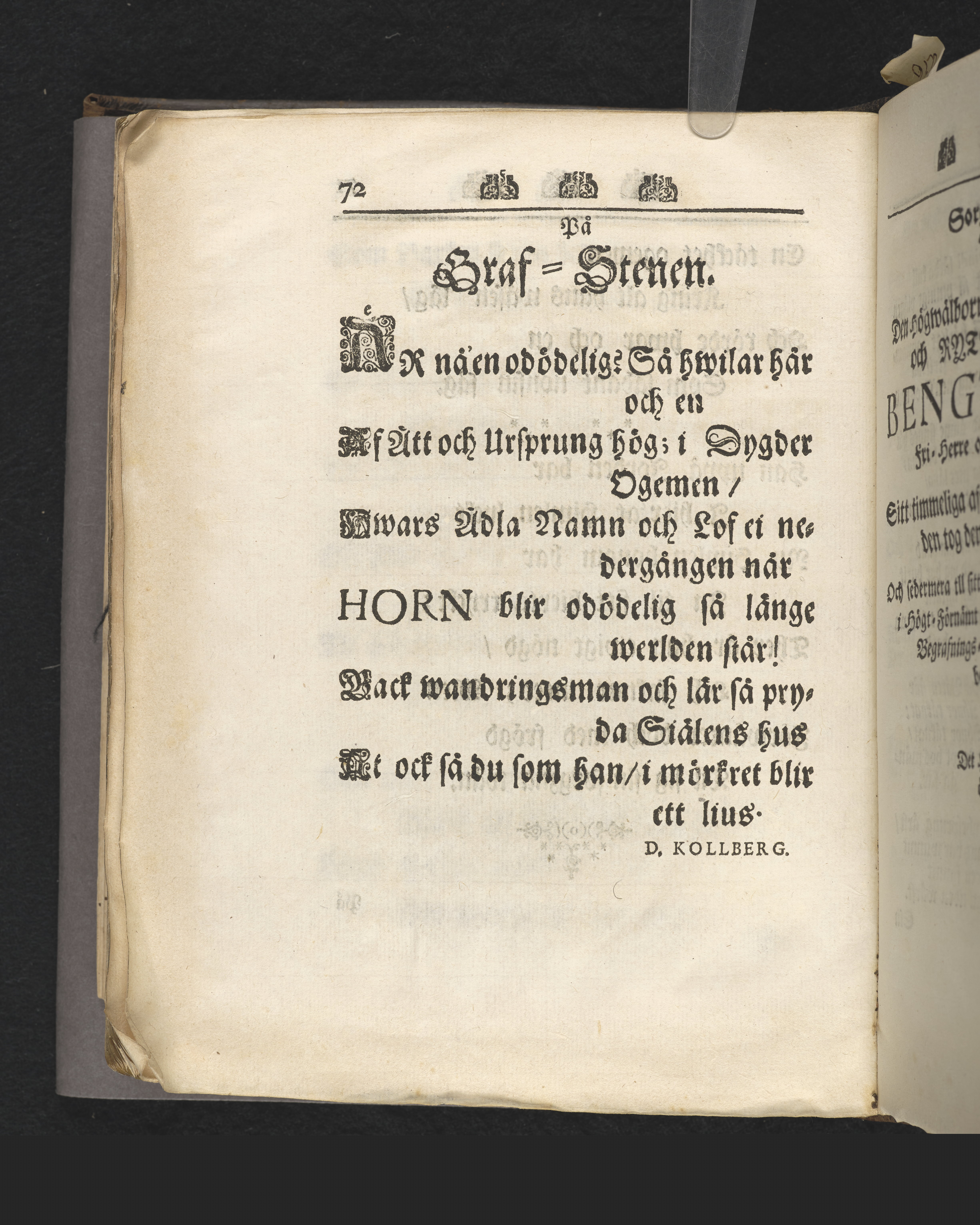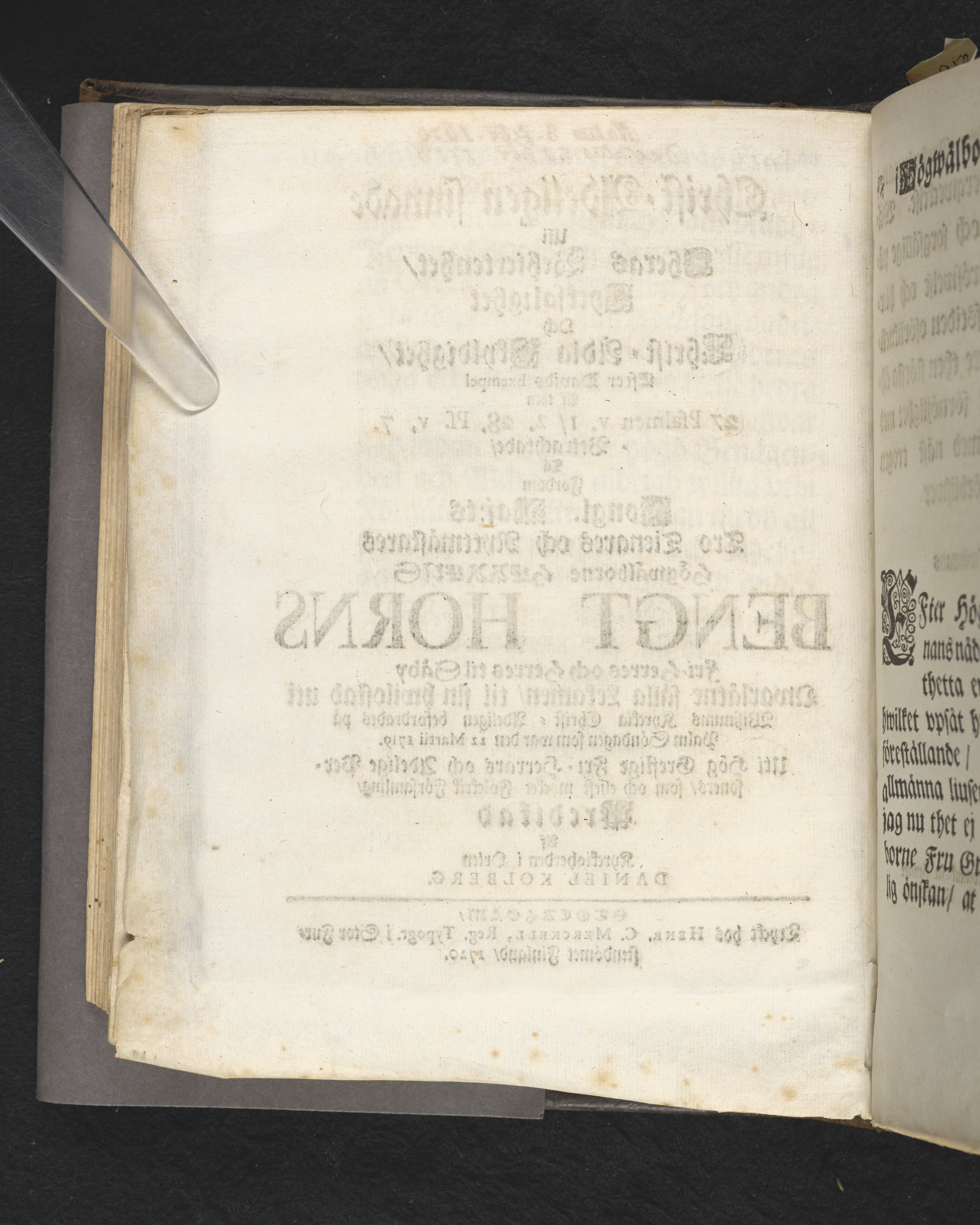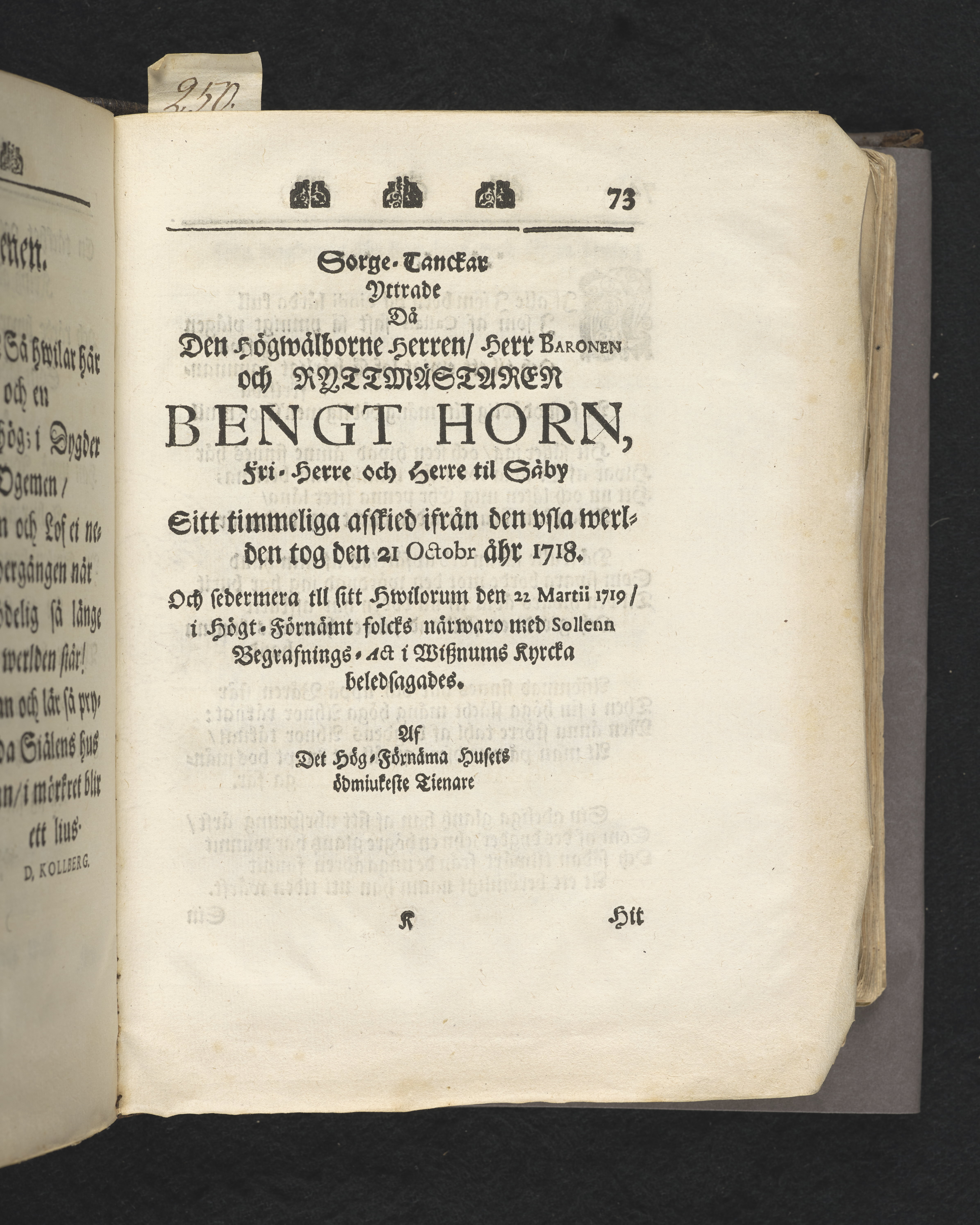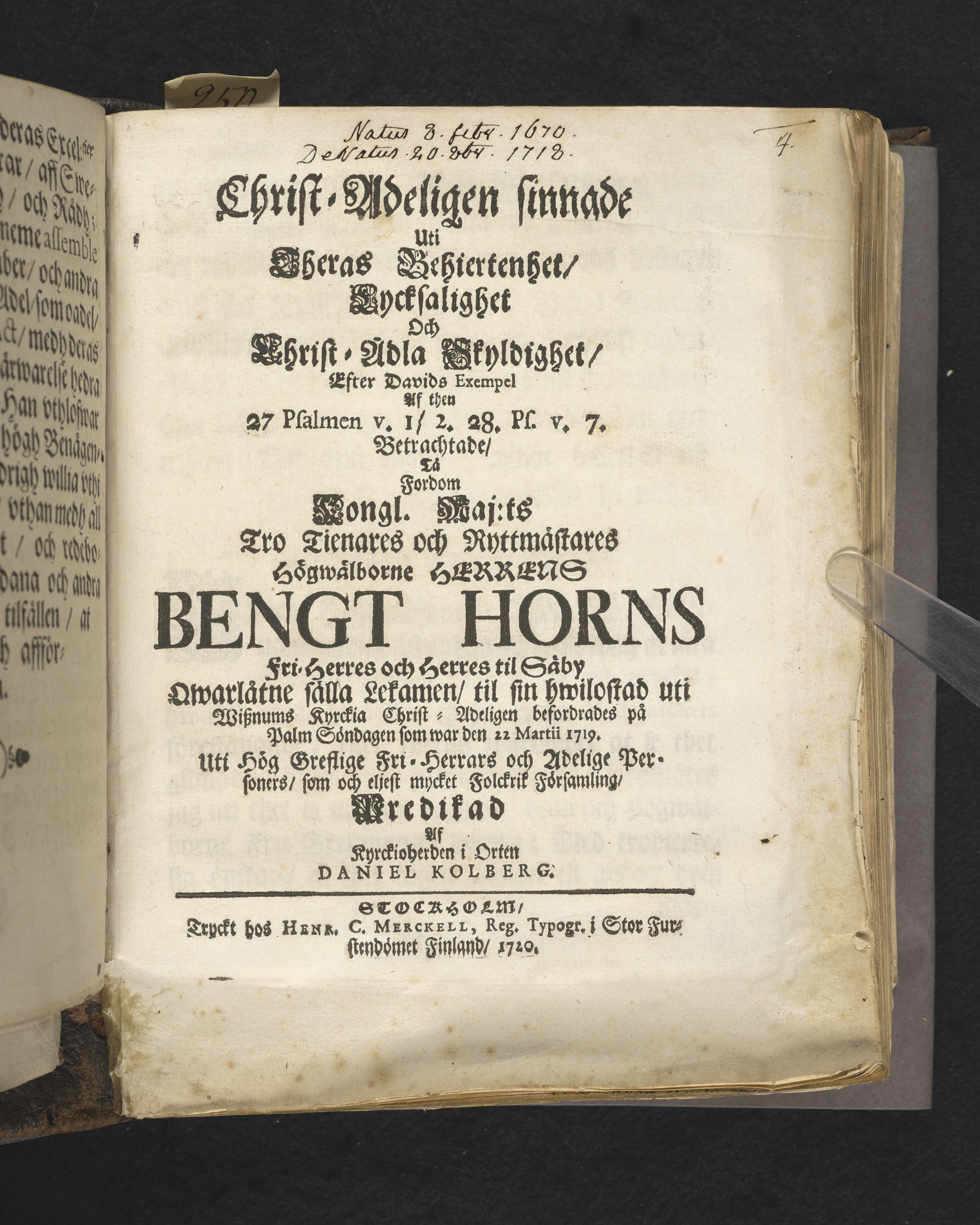 Christ-adeligen sinnade uti theras behiertenhet, lycksalighet och christ-ädla skyldighet, efter Davids exempel af then 27 psalmen v. 1,2.28. ps. v. 7. betrachtade, tå fordom kongl. maj:ts tro tienares och ryttmästares ... Bengt Horns ... qwarlåtne sälla lekamen, til sin hwilostad uti Wisznums kyrckia christ-adeligen befordrades på palm söndagen som war den 22 martii 1719. Uti hög greflige fri-herrars och adelige personers, som och eljest mycket folckrik församling, predikad af ... Daniel Kolberg. Stockholm, tryckt hos Henr. C. Merckell, reg. typogr. i stor furstendömet Finland, 1720.