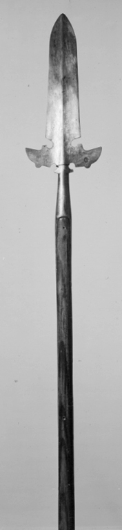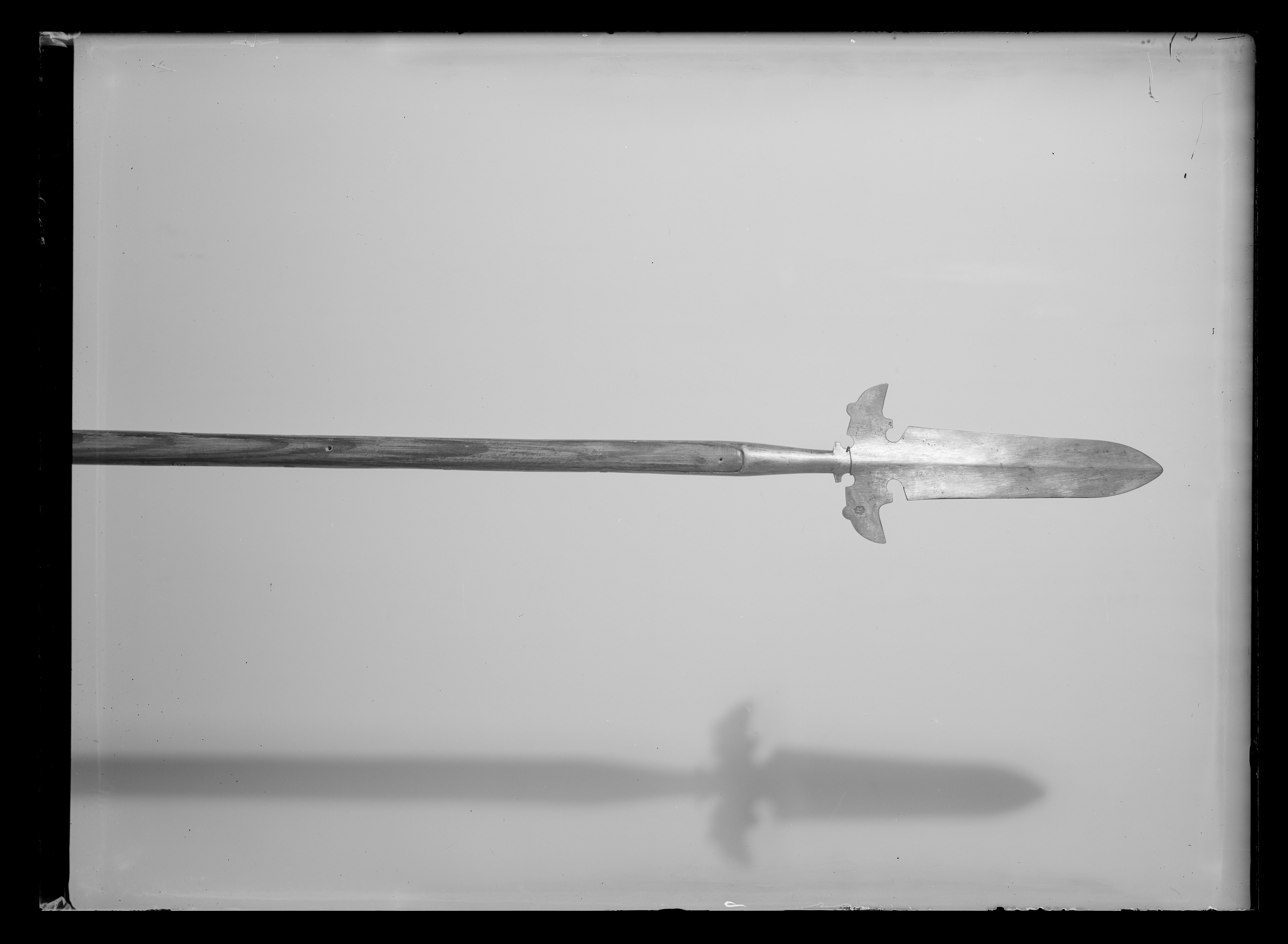 Brett blad slipat med mötande skär. Symmetriska svagt uppåtböjda vingar. På vingarnas överdel ett kantigt utskott på deras nederdel ett rundat uddformat utskott. Upptill och nedtill där vingarna ansluter till klingan runda inskärningar. På ena vingen stämpel, sköld med bokstäverna "I P". Klingan i ett med holken. Holken 80 mm som klingan slät utan dekor, konisk. Holken fortsätter i två stålskenor L: 520 mm fastnitade vid skaftet. Skaft av brunbetsat trä med rund genomskärning. Från Finspongs bruk, Finspong. Har tillhört Gustav Söderlund, Stockholm