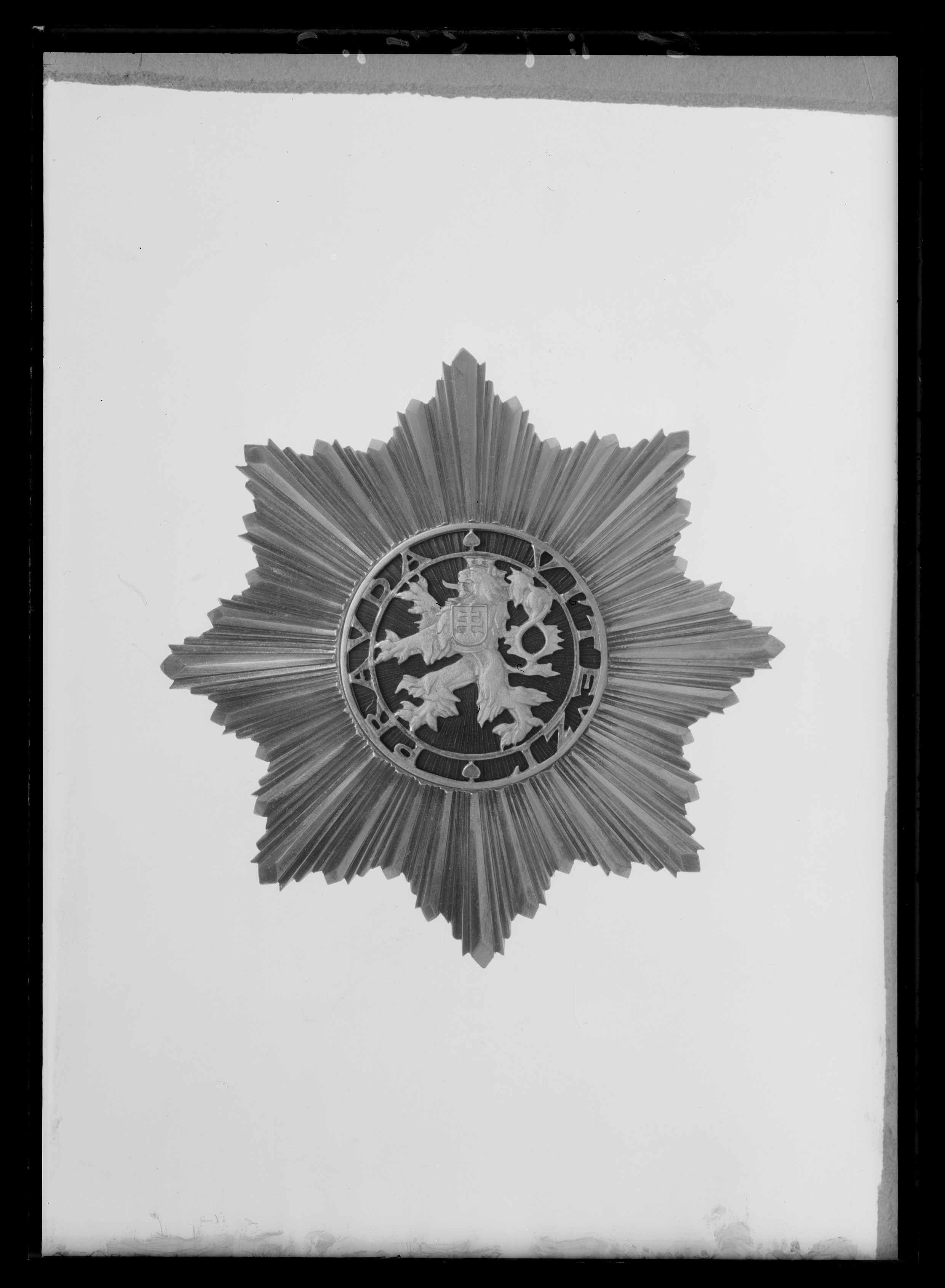 Åttauddig, pressad strålstjärna av silver, sammansatt av 32 bredare, åsade strålar avolika längd med rombiska spetsar samt däremellan tre smalare strålar. Platt medaljongtäckt med röd, genomsynlig emalj, däröver en genombruten silverplatta med i mittenrepubliken Tjeckoslovakiens vapen, ett krönt lejon med kluven svans (Böhmen), på skuldransköld med Slovakiens vapen (patriarkkors på treberg). Runt lejonet dubbla ringar och däremellan text: "PRAVDA VITEZI" samt två lindlöv. Påmedaljongens baksida en platta av matt silver med i relief en Lagerkvist, däröver blanktnamnchiffer: CRS, däromkring en blank ring. Nertill stämplat: "KARNET.KYSELY.PRAHA".Vertikalt placerad säkerhetsnål samt två hakar av silver, på nålen stämplat triangulärstämpel med patriarkkors på treberg, i vänstra hörnet 3, KK samt 900.