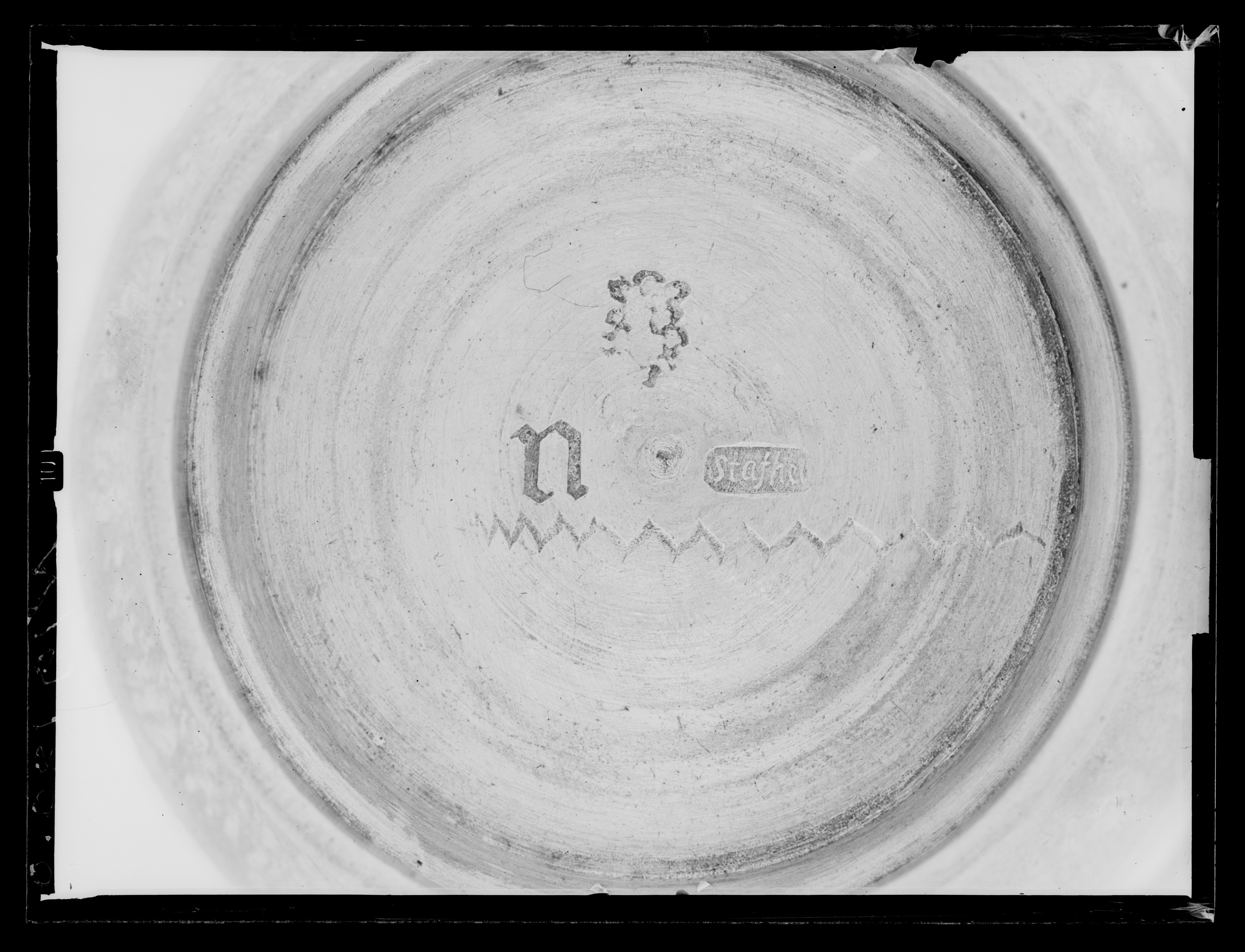 Stämplar på bottnens undersida: Stockholm (SS nr 526), Stafhell (SS nr 527), N (SS nr 528), åldermansranka, Gustaf Stafhell d.ä. Stockholm 1749. Kastrull av förgyllt silver, rund med uppåt vidgade väggar, rundad övergång till bottnen, på utsidan holk av förgyllt silver och urskruvbart, svarvat handtag av ebenholz, l 115 mm, gängat silverrör i ena änden. Vinkelrätt mot handtaget är kastrullens kant nerböjd till snås. På livet graverat AF under kunglig krona.