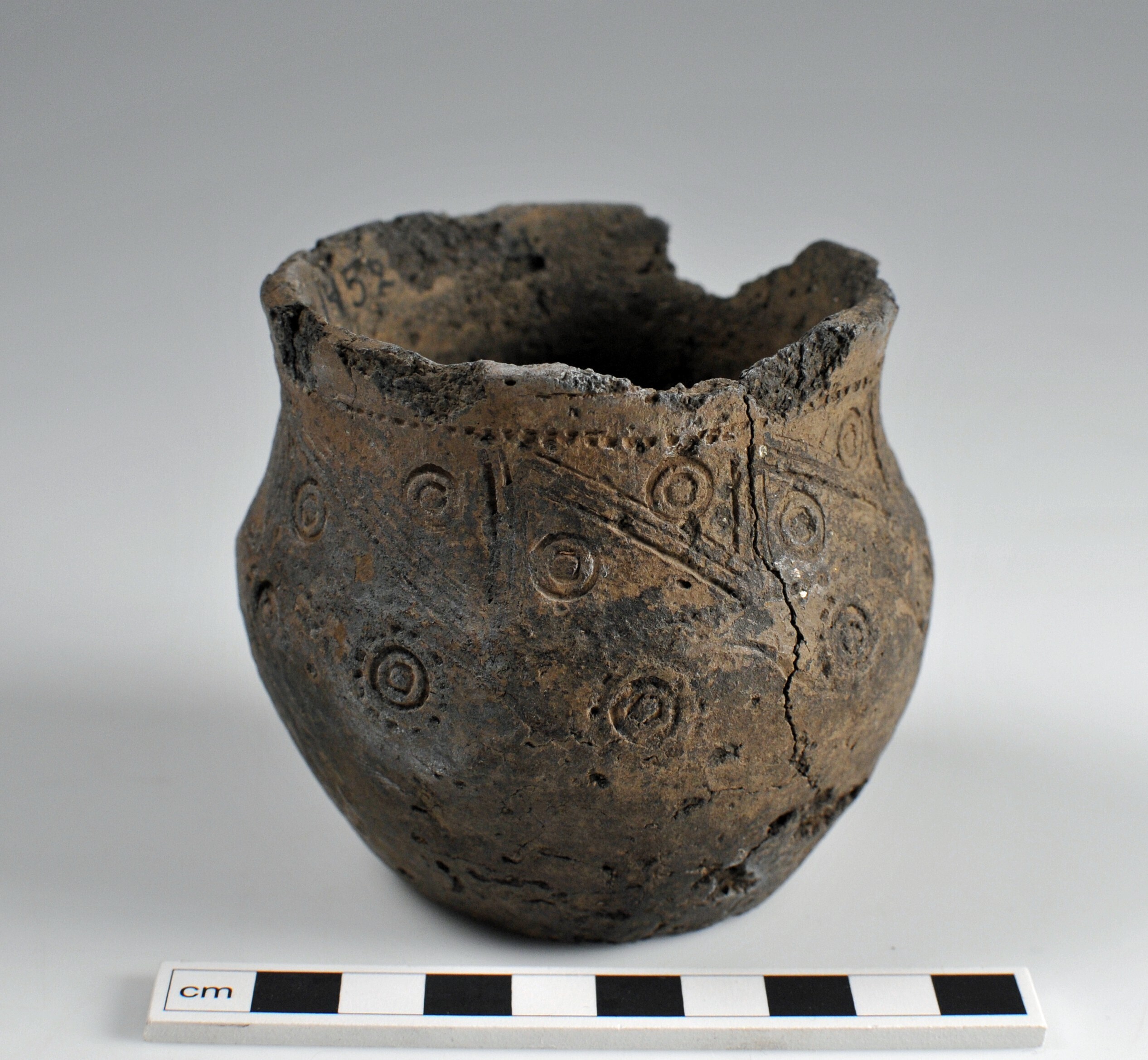 liten bägare med s-formad profil. reducerat bränd, glättad yta. dekor av linjer, koncentriska cirklar samt falsk löpande hund