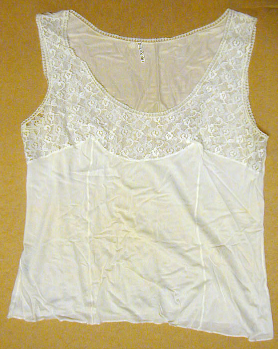 Kort linne av vit charmensenylon med rundad ringning fram, högre bak och utan ärm. Framtillett parti av enbart spets över bysten. Framstycket därnedanför i tre våder. Baktill iurringningen vitt monogram av "S". Storlek 44. I ena sidsömmen nedtill fastsytt märke: "Peané-Lyx // 44". På axlarnas insida småaxelbandstränsar som knäppes med tryckknappar.
