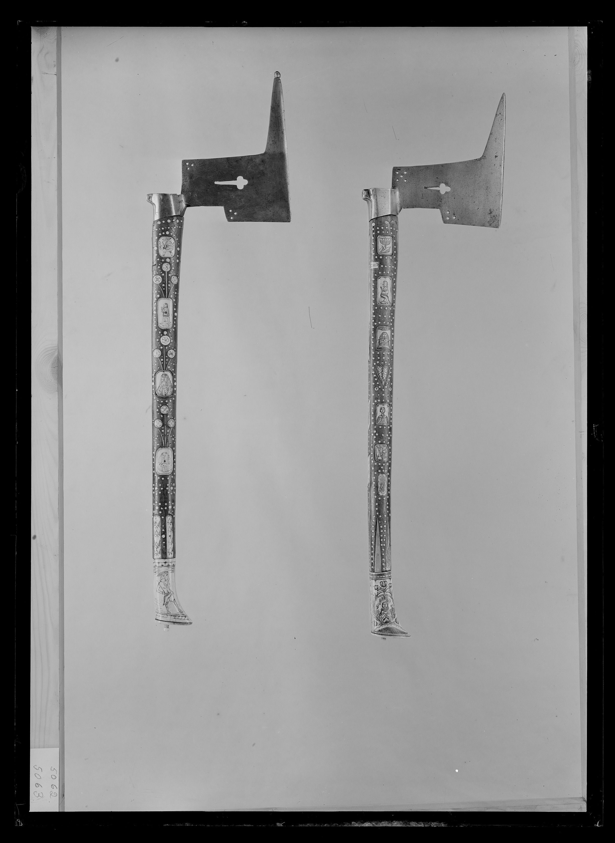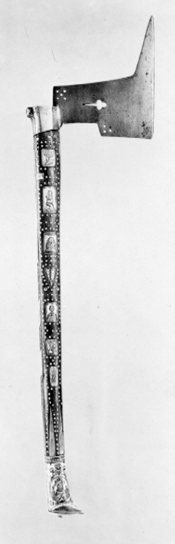 Yxblad av stål triangulärt med framåtriktad egg och en uppåtriktad spets. Bladet är genombrutet av ett klöverblad och 8 runda hål. Rektangulär holk, 50 mm lång med rutad klack på nacken. Skaft med ovalt tvärsnitt av trä med inläggningar av graverade benplattor och punkter av ben. På skaftryggen en graverad benplatta "IG.L.W.", ett graverat krucifix, på skaftets sidor graverade figurer. Skaftets ytterände av graverat ben med framåtriktad spets, dekor i form av blommor och 2 figurer. Plan oval ändplatta av ben med en snidad knapp av ben.