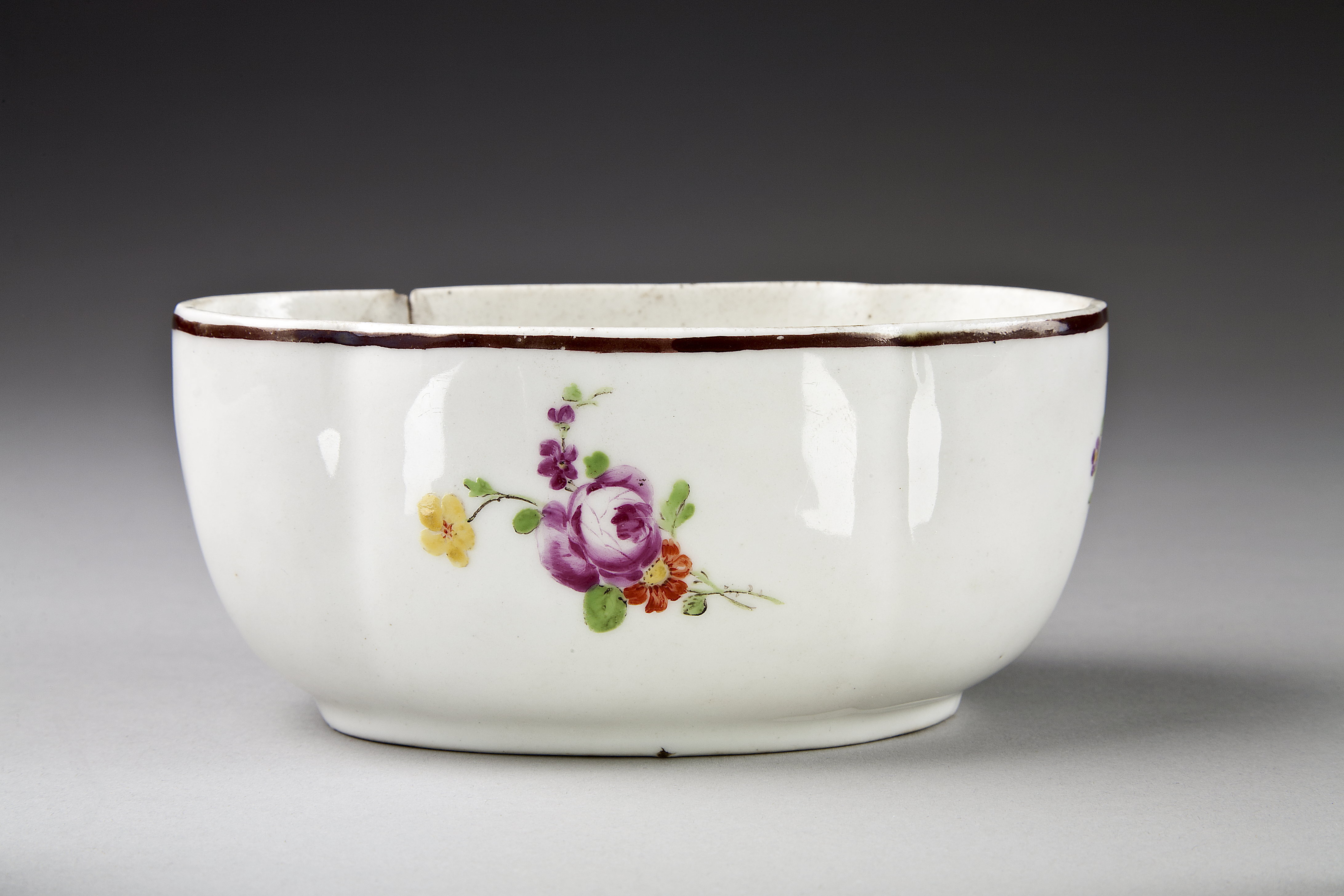 Skål med dekor av blomsterknippen i naturliga färger under glasyren.