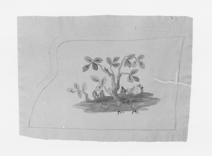 MÖNSTERFÖRLAGA, till möbelklädsel. Till karmstol inv. nr. Gr. VI:II:A.a.27. (För beskrivning se Hallwylska samlingen, Gr. VI, text.) Utförd med blyerts och akvarell på brunt (omslags)papper. Litet träd (av Bonsaityp), några stenar. Mått H 48,4 cm B 67,4 cm