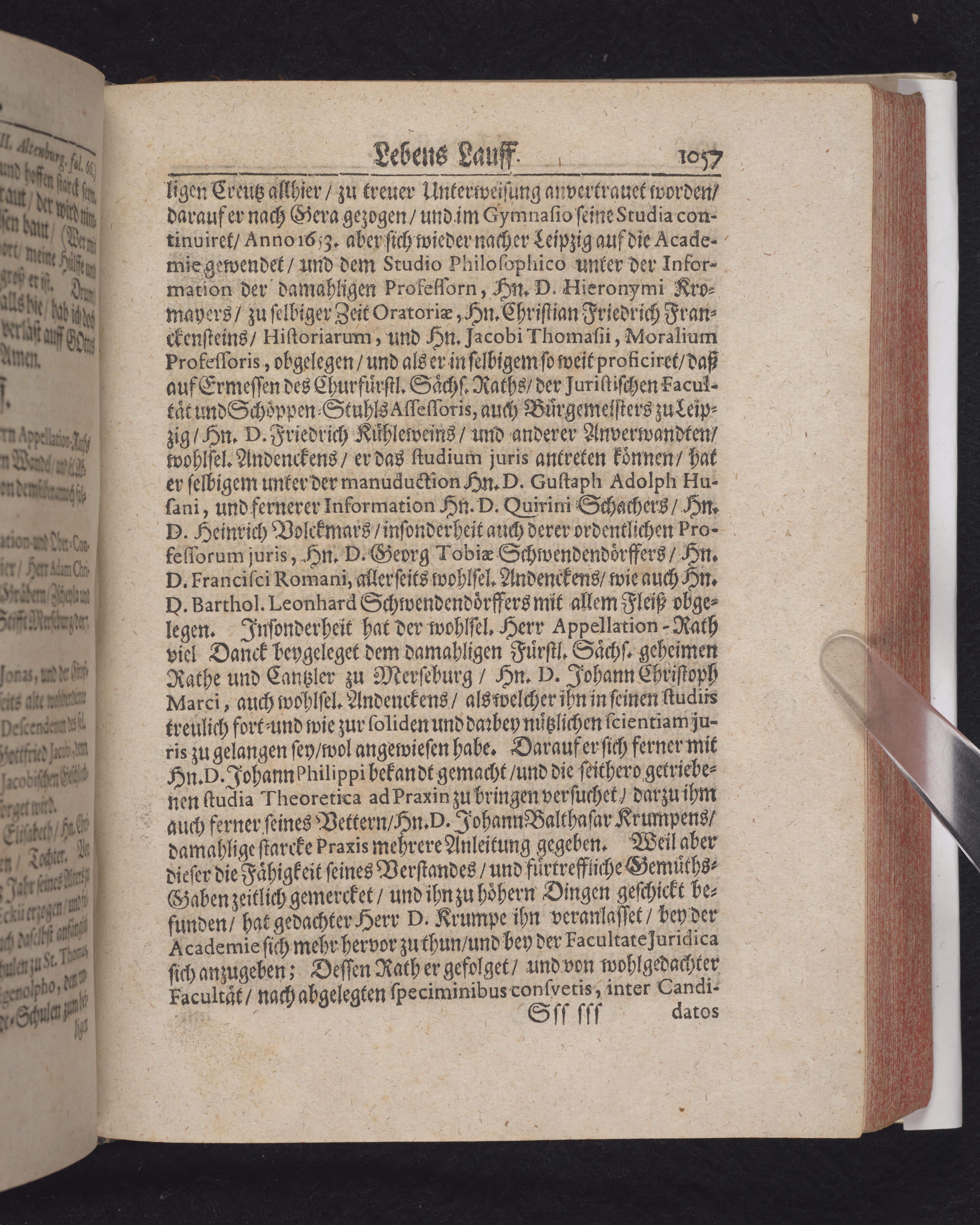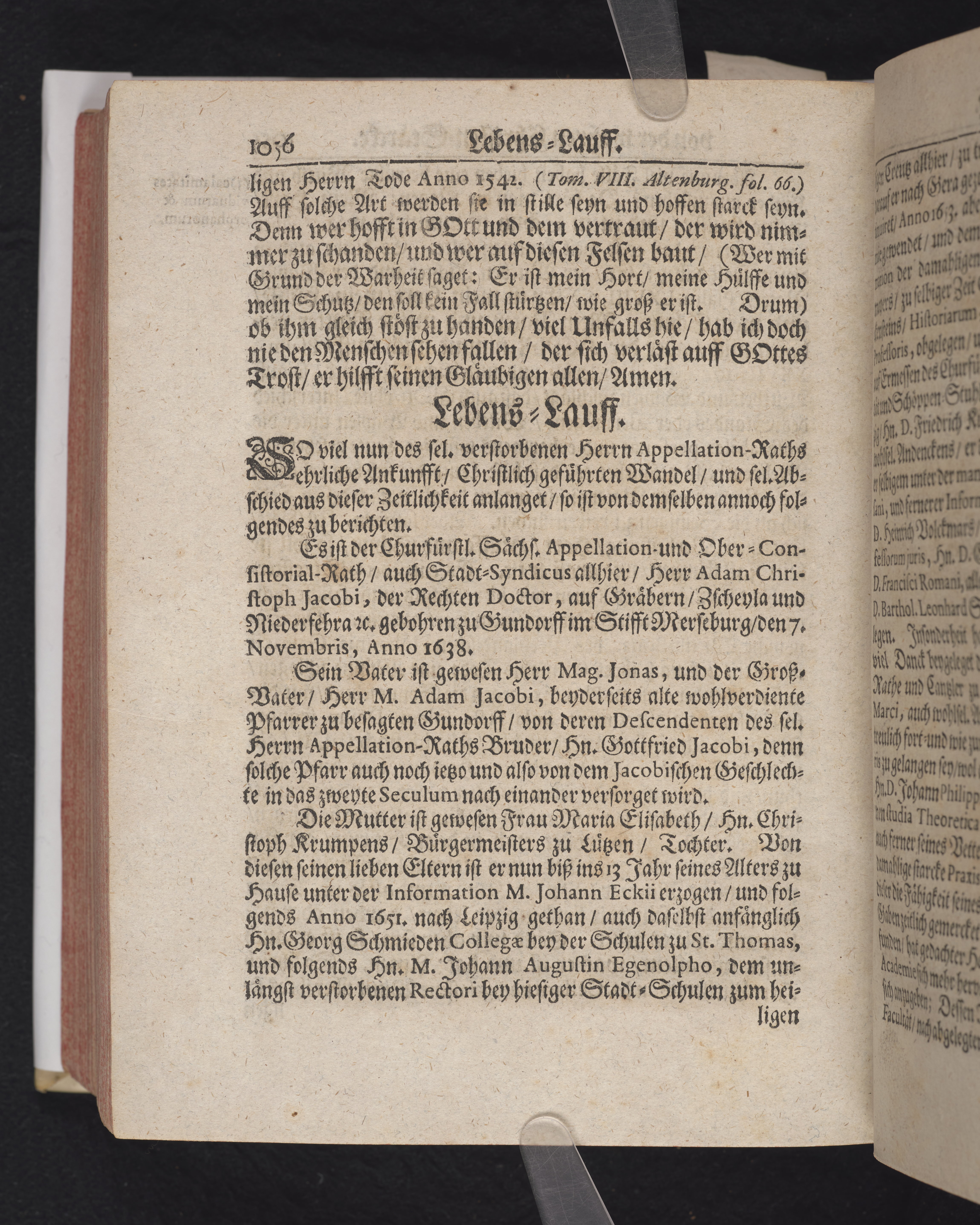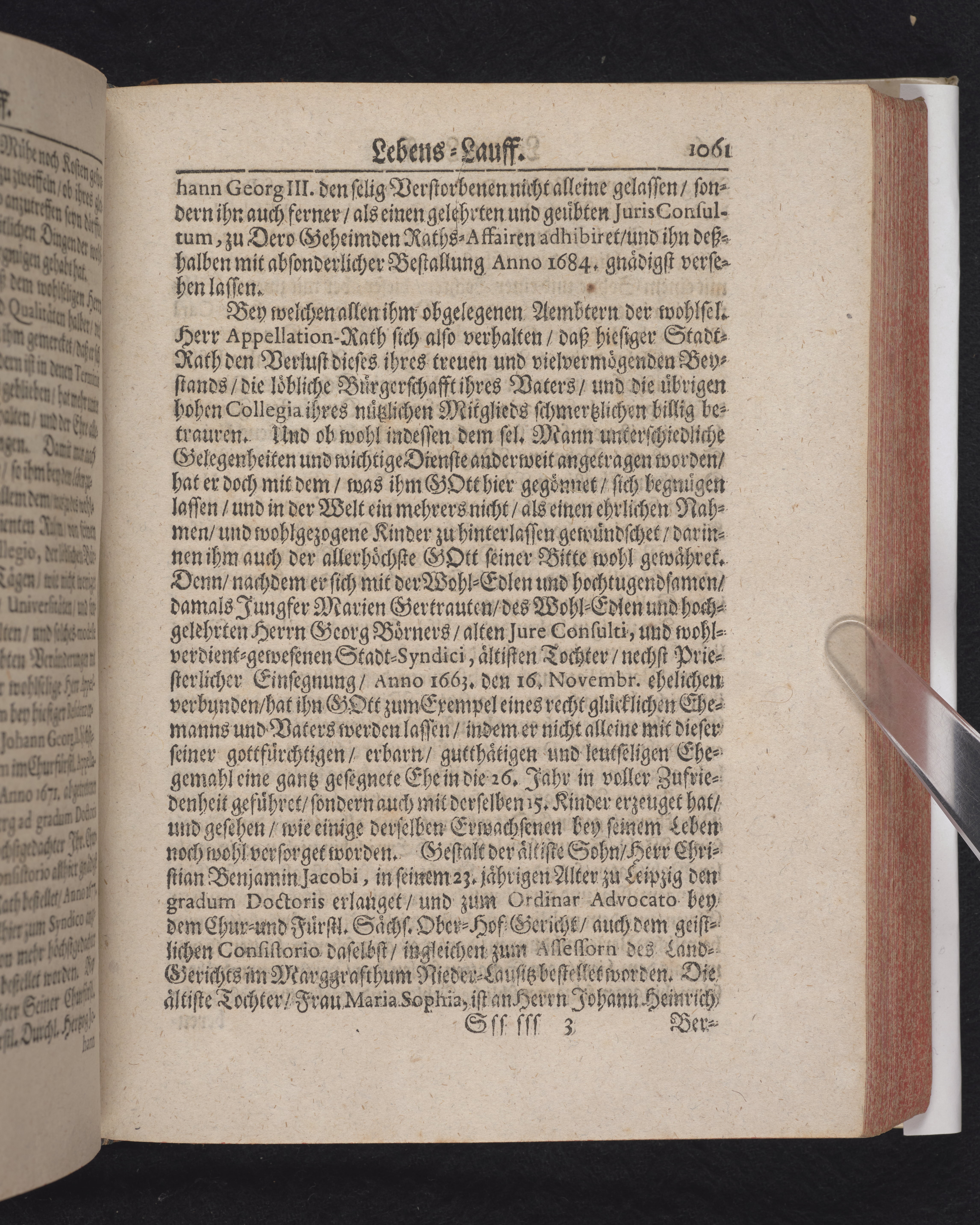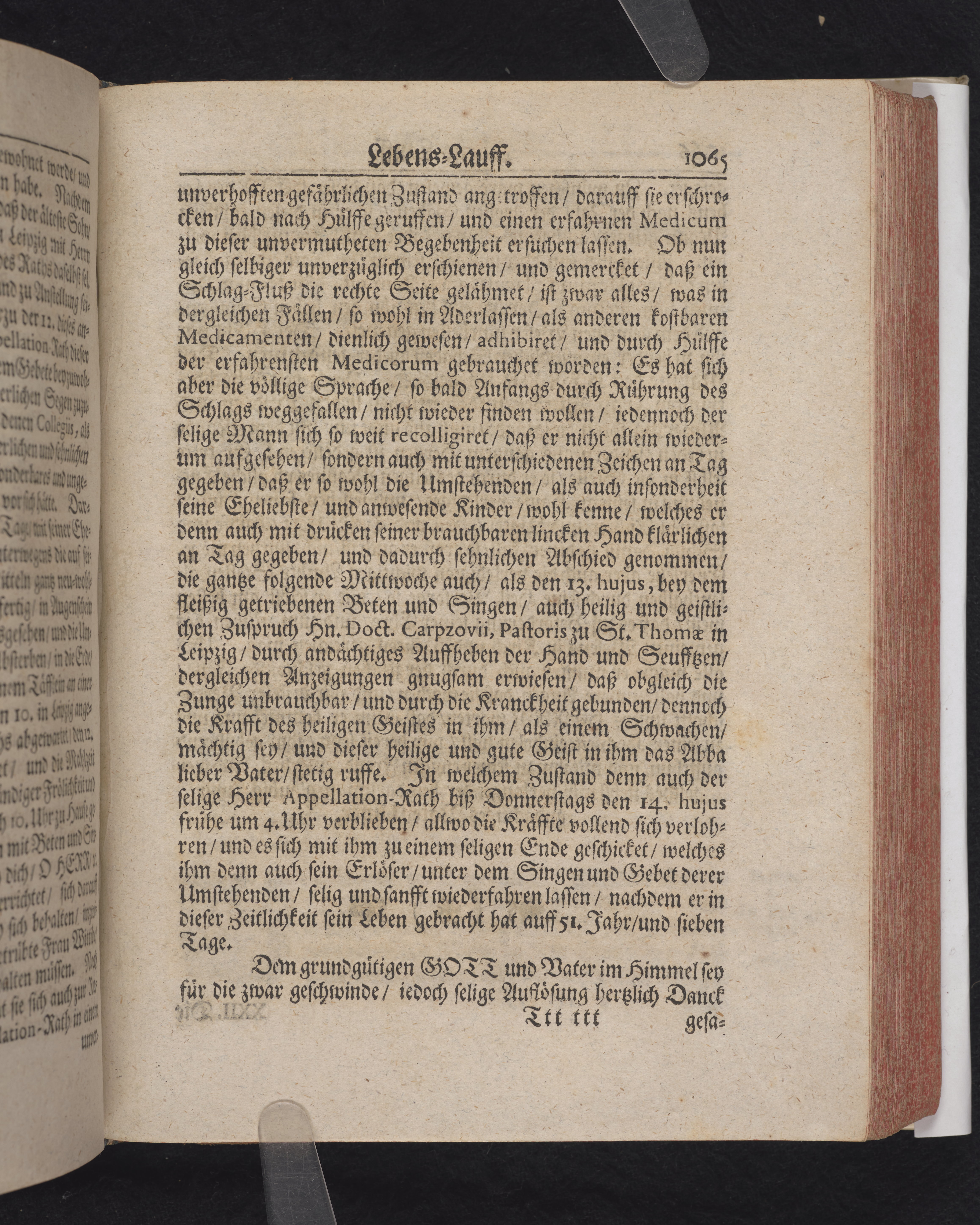 Ingår i en utgiven samling med 28 likpredikningar av Samuel Benedikt Carpzov: Grünende Gebeine, oder Leich-Predigten... Tryckt innehållsförteckning och register. Handskriven innehållsförteckning över de 28 likpredikningarna med bläck på främre försättsbladet (recto och verso).