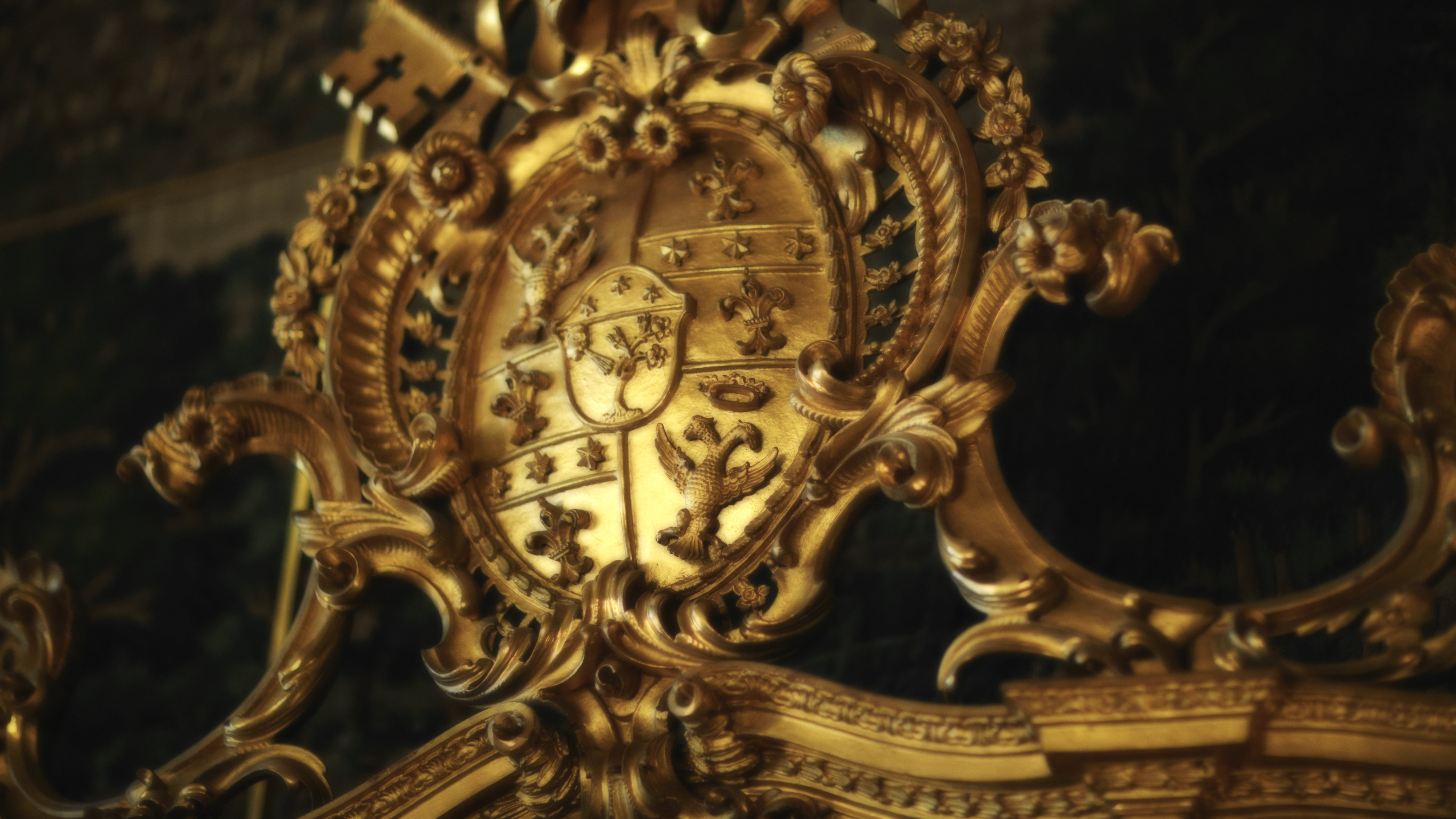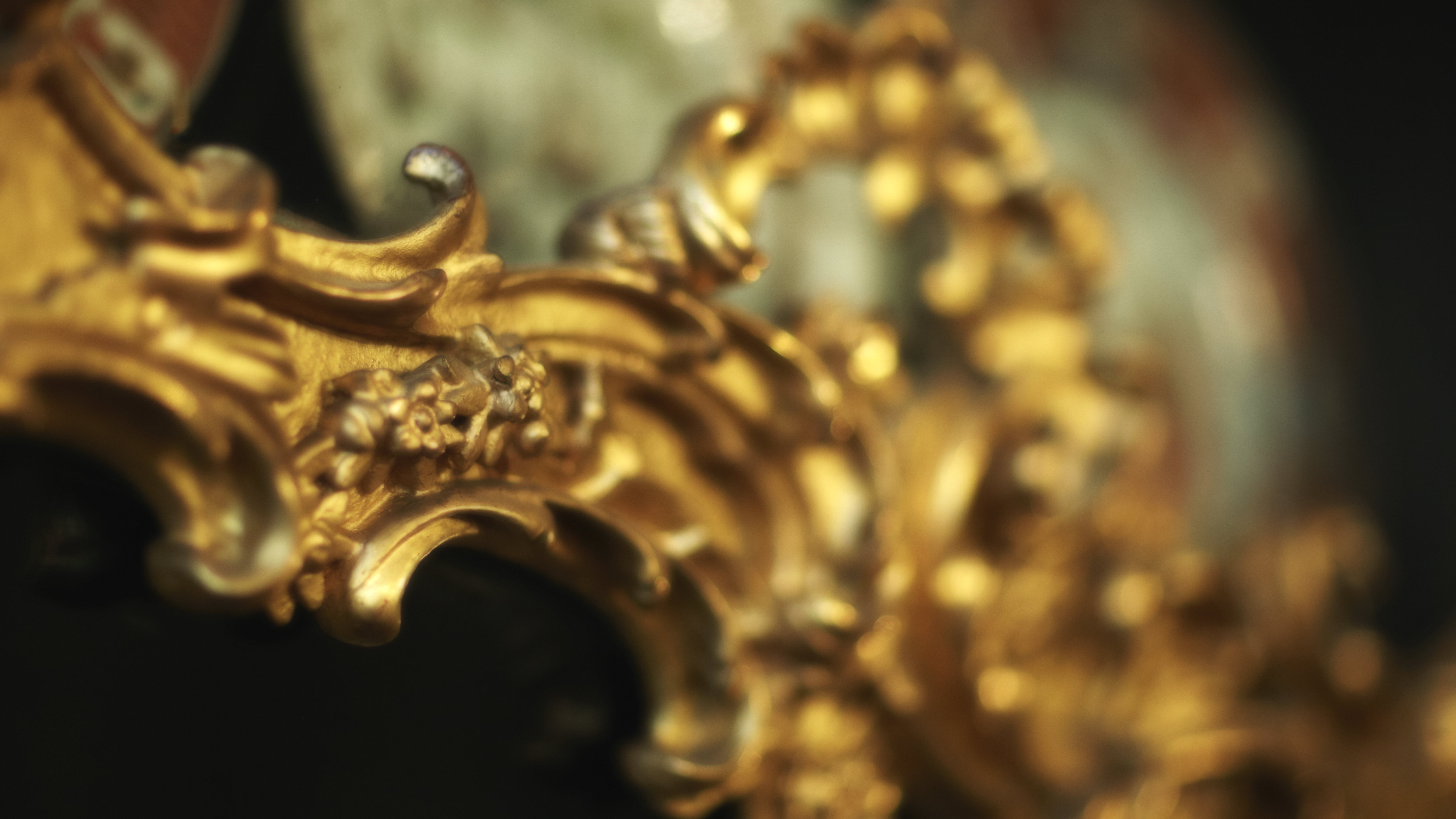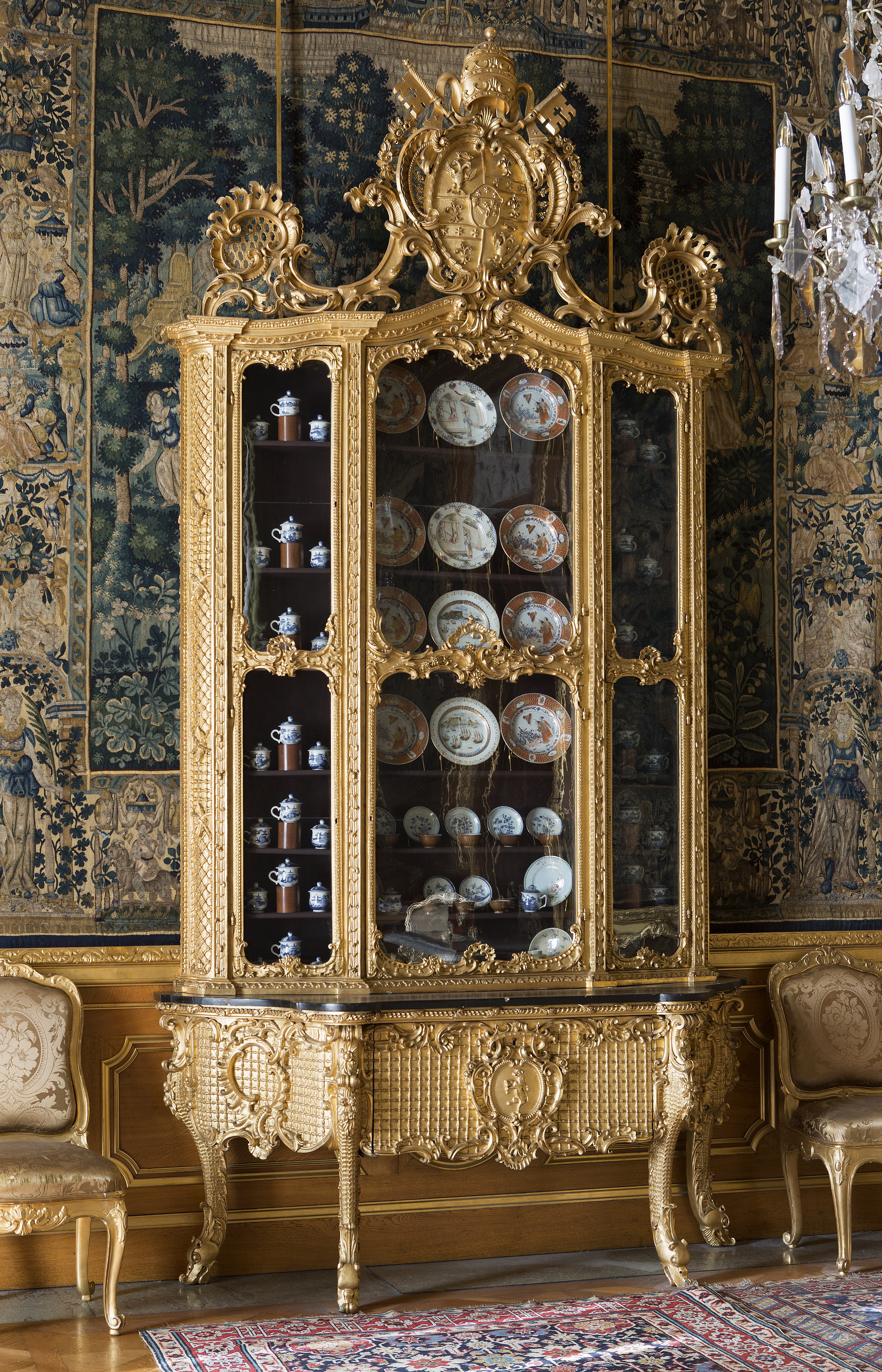 SKÅP. Italienskt arbete från 1770-talet. Av valnötsträ, rikt snidat och förgyllt i matt och blankt guld. Baksida och botten av sydländsk gran. I två delar jämte ett löst överstycke. Rikt snidat i relief samt förgyllt med äkta guld i matt och blankt. Skåpet är inrett med sex hyllor i varje avdelning samt klätt med brunt linnetyg. Nedre avdelningen består av en byrå på fyra höga ben med skiva av sydländsk gran målad i svart samt med rak framsida och karnisformiga kortsidor, alla med konturerad underkant. Framsidan utgör framstycket till en stor låda mot botten dekorerad med prickerat kvadratiskt rutmönster och i mitten ett vapen (trol. familjen Onesti) i oval sköld, omsluten av två åtvända stavbågar isamt under krona med blad och kulor. På vardera kortsidans mitt en kartusch, bildad av två åtvända rokokobågar. Benen något svängda, varje med nedre delen i form av en fågelhals med huvudet nedåt som fot. Rygg saknas. Övre avdelningen består av ett grunt skåp med konturerad överkant samt indelat i tre vertikala avdelningar, den mellersta bredast. Vardera avdelningen har två över varandra ställda dörrar av glas på gångjärn och med infällda lås. Mellan avdelningarna samt vid vardera yttersidan ett smalt pilasterstycke med ett nedåtvänt bladliknande fjällmönster med ollon. Kortsidorna är smala, vardera indelade i tre långa och två korta fält, i varje av de förstnämnda ett rombiskt rutmönster. Överstycket har i mitten påven Pius VI:s påvevapen (ätten Braschis familjevapen i hjärtskölden) under tiara mellan de två nycklarna. Nycklar (original): Av järn, med oval ögla. Inköpt av Walther och Wilhelmina von Hallwyl den 11 september 1895 från professor August Holmberg, München, genom Carl Anton Ossbahr för 2500 DMK. Omförgyllt 1924 av konservator Alfred Nilsson till en kostnad av 4500 kr. Den ursprungliga färgsättningen på 1700-talet var troligen i grönt/blågrönt; rester av sådan färg kan ses under bortfallen förgyllning. Sannolikt var skåpet dock redan förgyllt vid tiden för Wilhelmina von Hallwyls förvärv. Pius VI, f. 1717 i Cesena, d. 1799 i Valence, Frankrike, blev 1766 påvlig skattmästare, 1773 kardinal och 1775 påve. Fördes av Napoleon I som fånge till Frankrike 1798. Kung Gustaf III besökte Pius VI i Rom 1784.