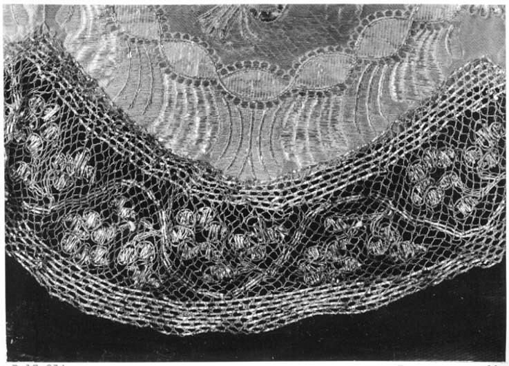 Kjol sydd av sju våder silverbrokad, sk mönstrad lampas, med invävt och broderat mönster i silver på vit botten. Mönstret uppbyggt av buketter och girlander av silvertråd, lan och paljetter. Det nedre partiet kantas av en 110 mm bred knypplad silverspets. Modellen är platt fram och bak med mycket vidd över höfterna. Kjolens vidd är samlad i veck i midjan, med undantag av ett 120 mm brett slätt parti mitt fram. Ca 150 mm på vardera sidan om mittpartiet finns "fickor" i form av 170 mm djupa sprund. Enkel linning som knytes ihop i ryggen med två band ovanför ett 250 mm djupt sprund. Kjolen är till största delen ofodrad, men undantag för den nedre tredjedelen som är fodrad med vit sidentaft. Längs kjolens nederkant löper ett kraftigare linneband. På linnebandet är fastsatt två separata lappar märkta: "Drot Hedvig no 125" samt "Klädkammaren. Gn: 125 p [...] 39. Dr. Hedv. Elis. Charlottas Bilägersdrägt. (Kjortel med korsett.)" Tyget är troligen vävt i Frankrike.