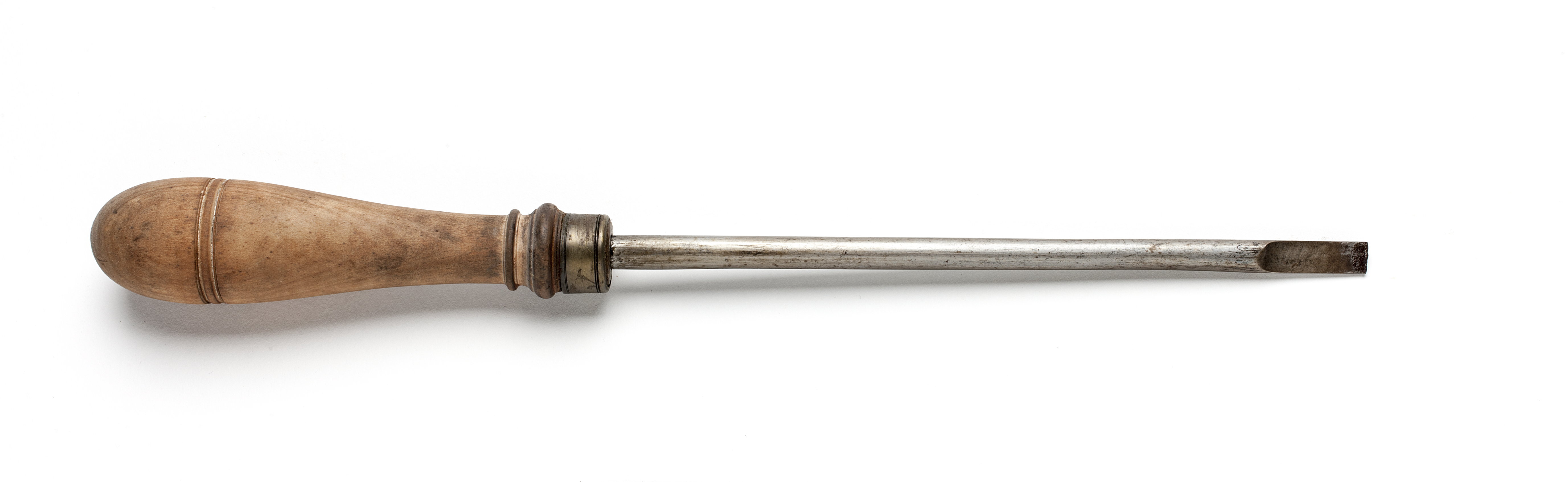 Rund klinga, i änden med rektangulär genomskärning. Svarvat skaft av päronträ med två vulster nedtill ("skoklostertyp"). Mässingsring.
