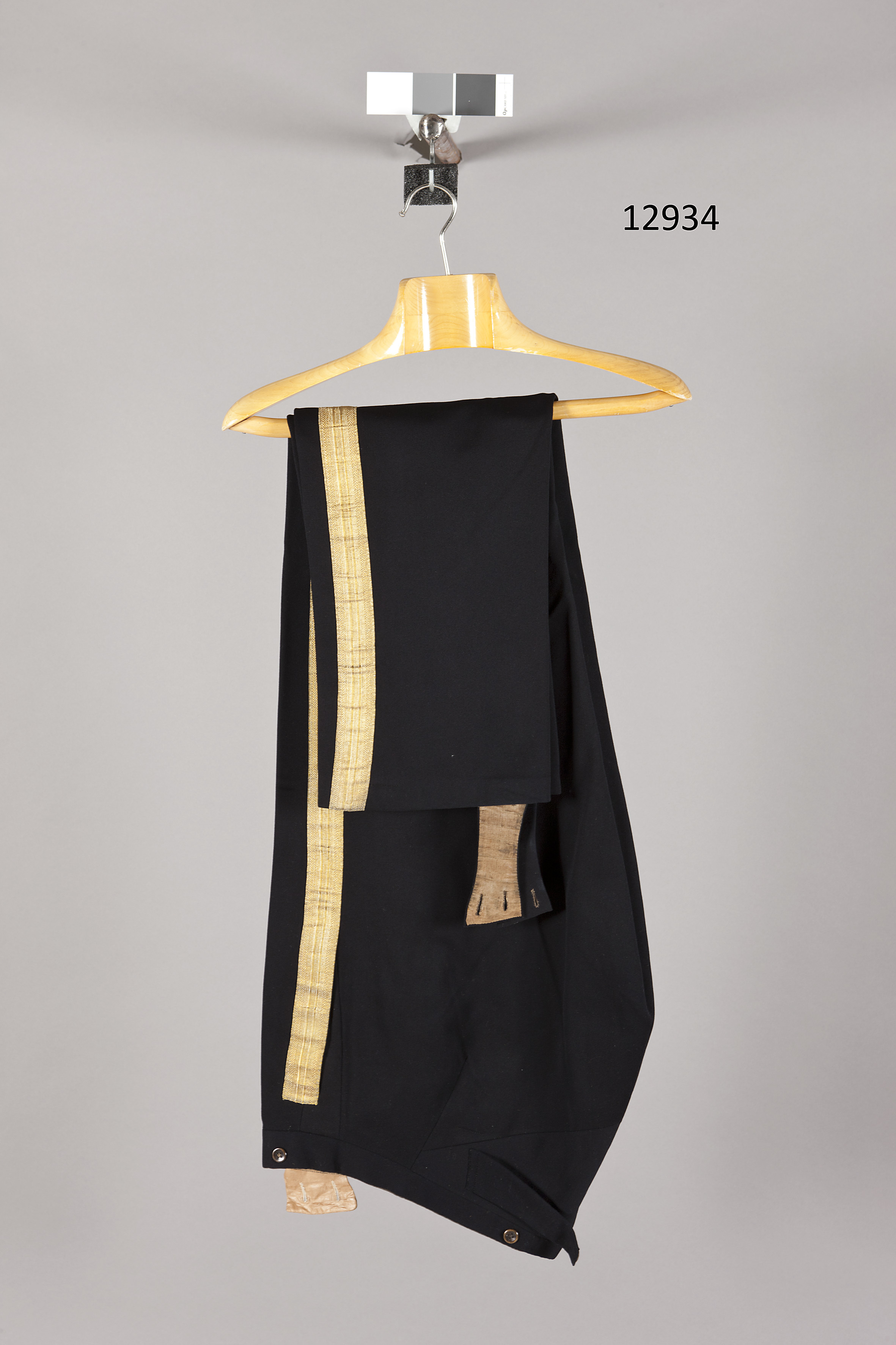 Långbyxor av mörkblått kläde med 35 mm breda revärer av förgylld silvertråd. Gylf med fem plana, bruna plastknappar och en större plastknapp upptill. Invändig slejf som knäpps i de två översta gylfknapparna. Utefter den med grönt yllekypert kantade linningen sitter sex knappar, bruna, skålformiga av plast. Baktill sprund och spänntampar med sölja märkt : "LORGNIE". Sidsömsfickor. Nedtill tyghällor, fästade med fyra plana, bruna plastknappar.Linnings- och grenfoder av bomull.