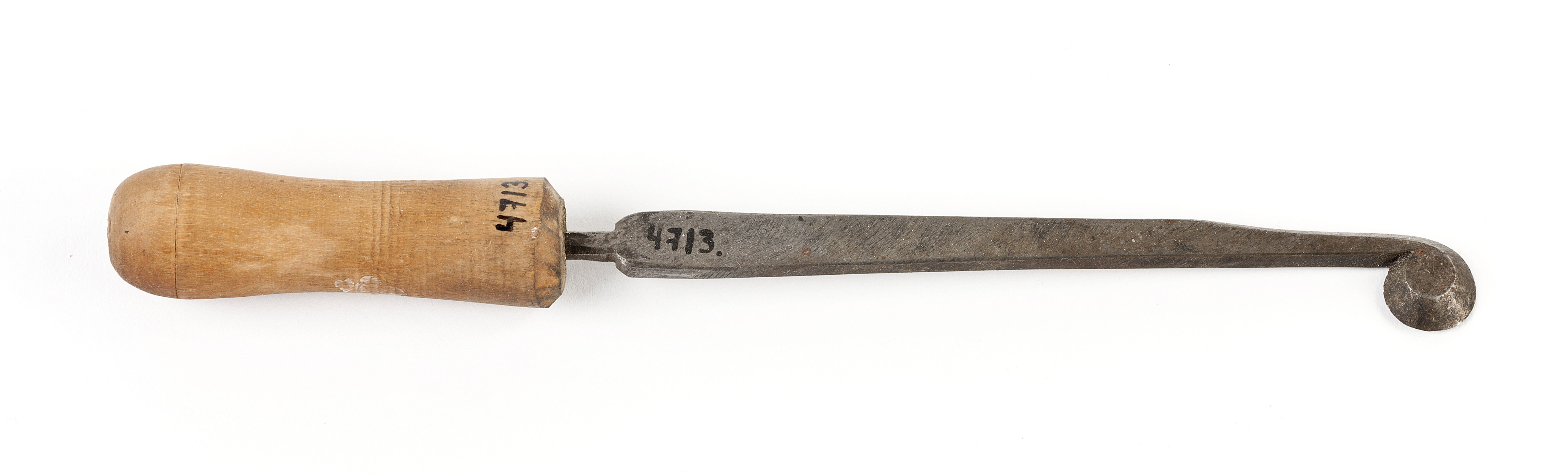 Klinga med rektangulär genomskärning. Runt, vinkelställt stål. Svarvat skaft av buxbom?