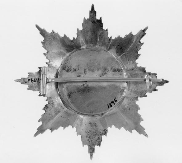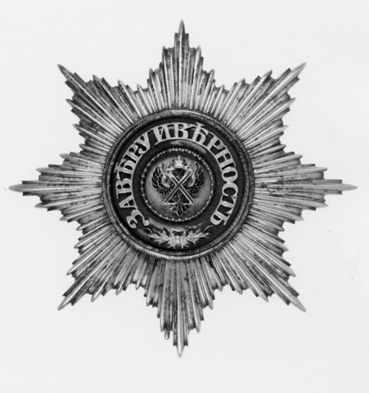 Åttauddig strålstjärna av silver. Medaljong med i mitten välvd, punsad platta av guld, därpå fäst svartemaljerad, dubbelt krönt dubbelörn med blåemaljerat andreaskors på bröstet. Däromkring välvd, blåemaljerad ring, kantad inåt av fasetterad pärlstavsring, utåt av dubbla, räfflade ringar, alla av silver. På den blå ringen fäst rysk text av guld: ZA VERU I VERNOST, nertill två korslagda, grönemaljerade lagerkvistar, sammanbundna med rosett av guld. Frånsidan slät, vertikalt placerad säkerhetsnål.