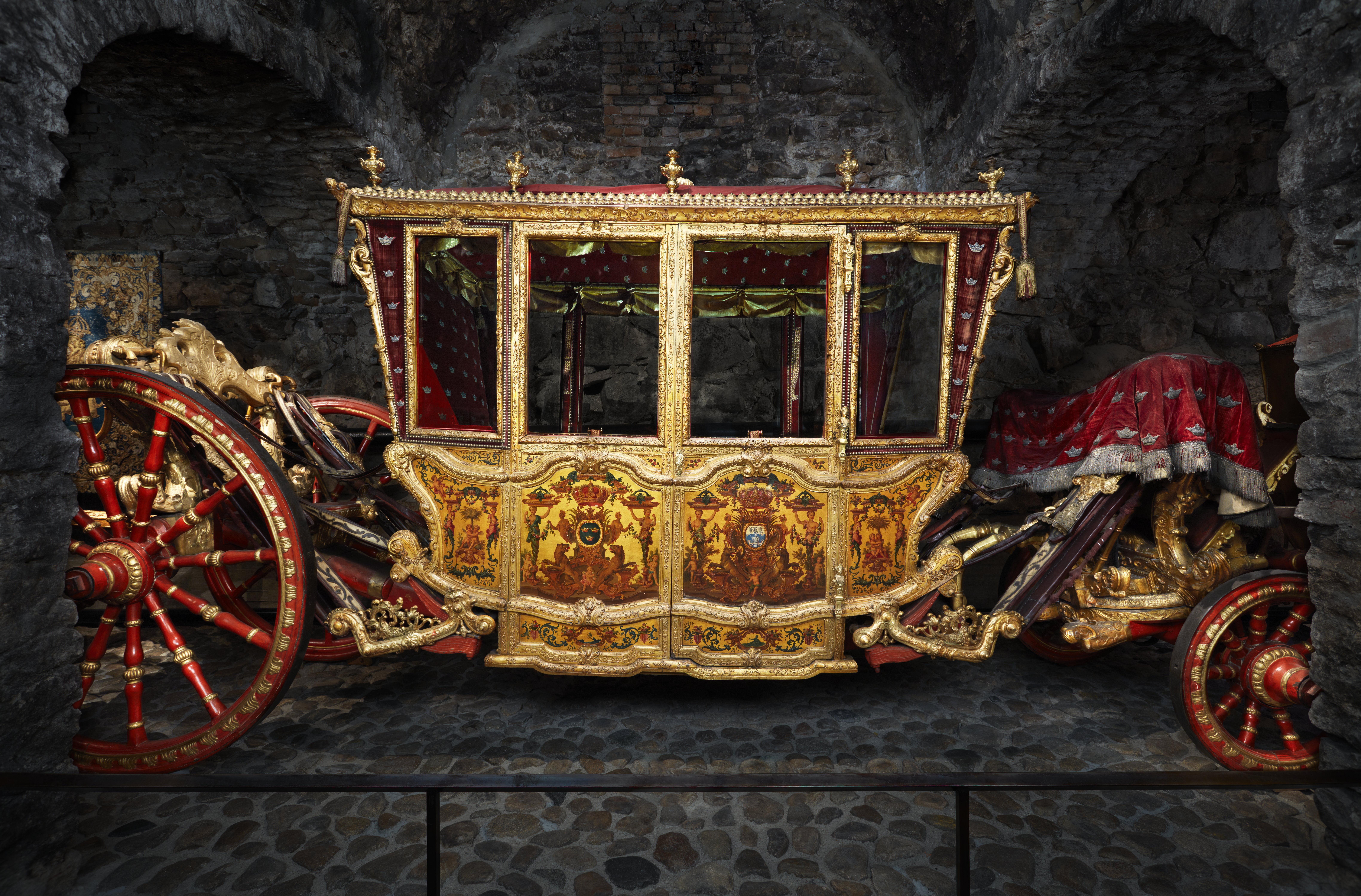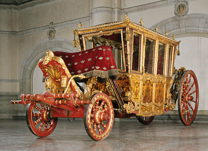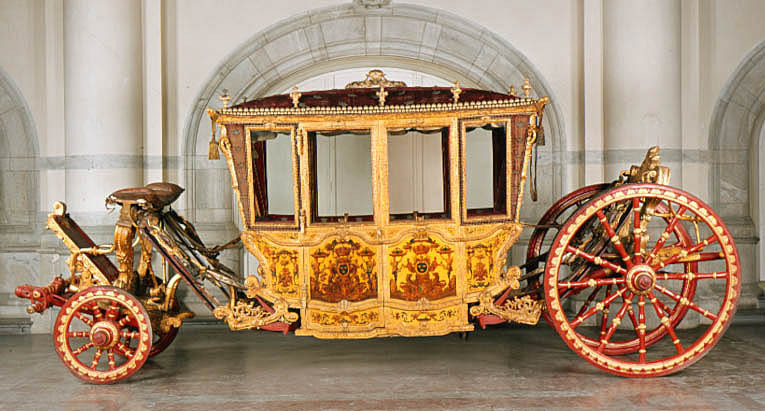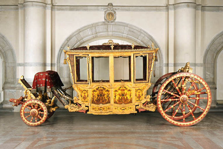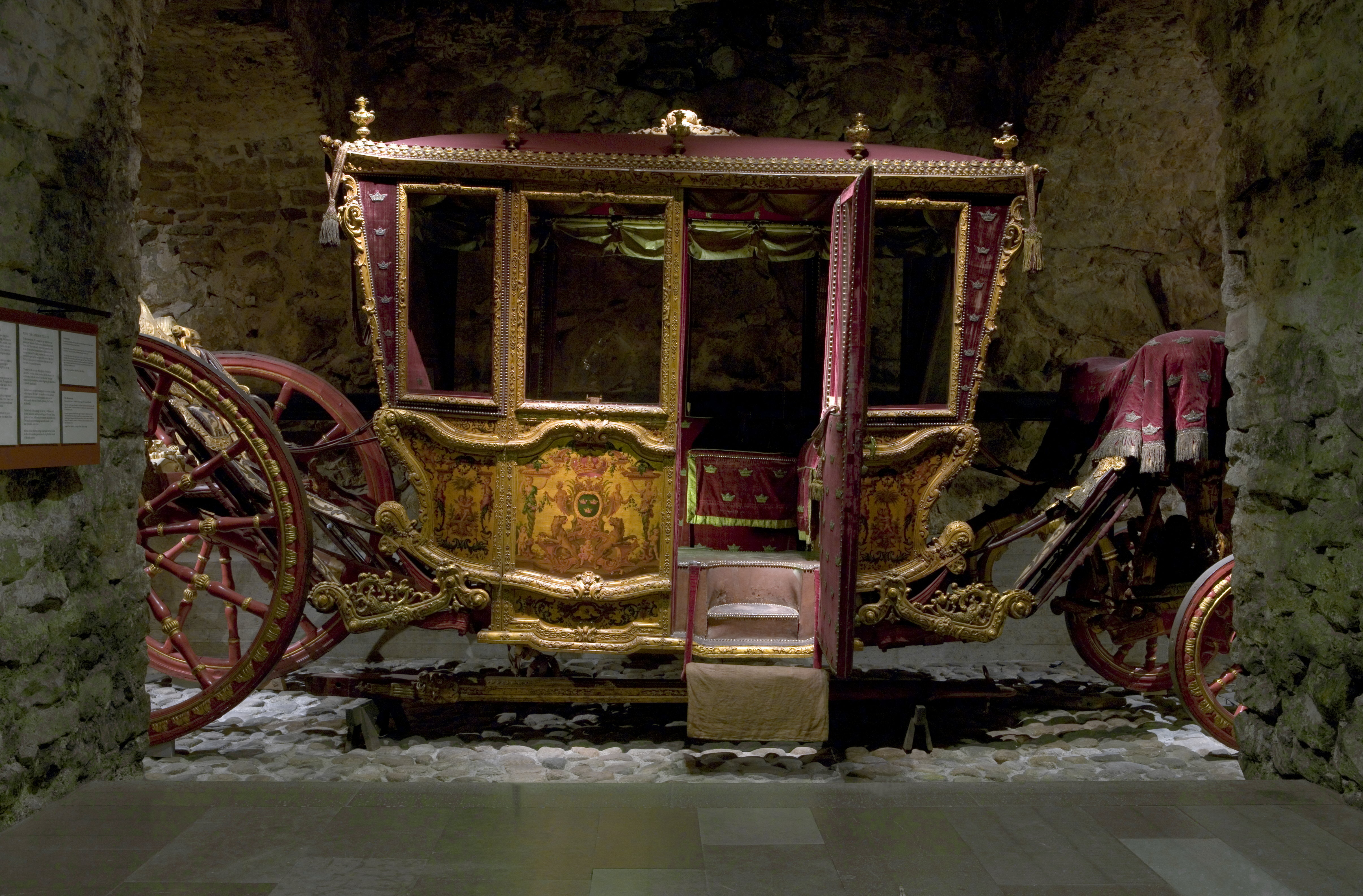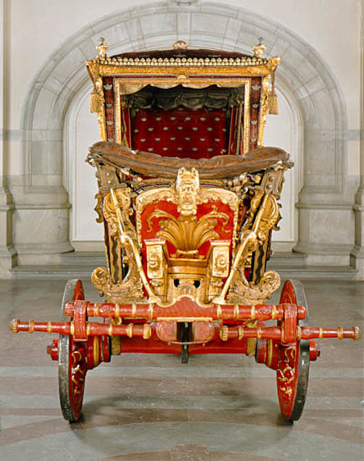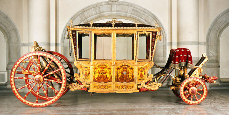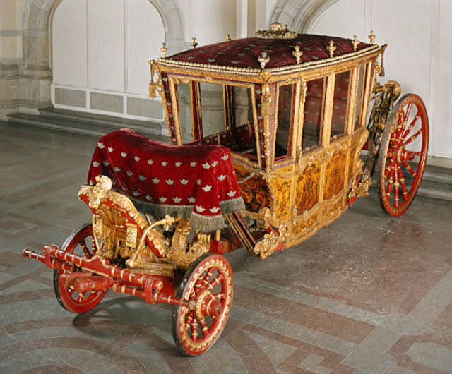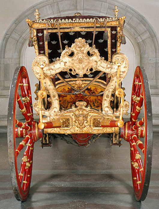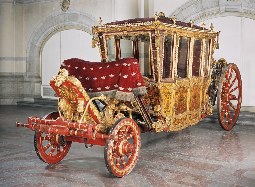 Sluten, åttasidig vagnskorg, kur, med trapetsoida sidor och nio slipade kristallfönsterglas. Horisontalt bukiga fyllningar i fram- och bakväggarna. Lågt välvd imperial klädd med röd sammet och strödda guld- och silverbroderade öppna kronor. Tre rader, "knappar" tennlickor, av mässing runt takkanten och tio brännförgyllda mässingsvaser. Krön av snidat och förgyllt trä, i form av oval platta och knoppformig förhöjning med bladornament (nr 17613). Snidad kornisch, ramverk och hörnposter med bladornament. Bakspegeln med infälld snidad ram, klädd med röd sammet och broderade kronor, små mässingstennlickor runt kanterna. Dito klädsel på långväggarnas sidopartier. Lakejband med två tofsar vid bakre kornischen. En tofs med band i vardera imperialens hörn. Två dörrar med vridhandtag av mässing, avlånga med blomornament. Ett fast väggfält invid vardera dörren i korgens bakre hälft, har tillkommit vid vagnens förlänging 1773, och har utförts som kopior av dörrarna. Korgfyllningar med målningar på guldgrund med rankverk, palmer, putti och kvinnliga hermkaryatider ensamma och parvis omfamnande varandra. På fram- och bakväggarna, dörrarnas och väggfältens mitt finns krönta trekronorssköldar under vilka Amor sitter. På högra dörren är det ursprungliga vapnet, ätten Morvilles, framtaget. Två lejon som sköldhållare. Korgens klädsel invändigt av röd sammet, passpoaler av guldgalon, strödda öppna kronor broderade i guld och silver. Två sittdynor, framsätets med tvådelad kappa, guldgalon och strödda kronor. Baksätets dyna med kortare kappa mitt på ena långsidan, galon och kronor. Gardin feston av guldtyg draperad kring takkanten år 1818, en tofs i varje hörn. Vävda fönsterband och fyra handtag i två "lyckor" vardera, vävda i gult och rött. Mitt för vardera dörren är en uppfällbar pall klädd med sammet fästad, de har en galonkantad kappa med strödda kronor. Fotbottnen klädd med läder fäst med mässingstennlickor runt kanterna. I stigbrunnarna mindre fotsteg som vikas utåt ett stycke, sannolikt ditsatta vid ombyggnaden 1773. Korgen hänger i fyra hängremmar med ciselerade mässingsspännen och ovanför dem trampstöd. Åtta mindre stöt- och svängremmar. Remmarnas klädsel av vitt läder med röda kanter, gröna applikationer påsydda. Fjädring à la Dalême, fyra stora genombrutna fjäderbeslag av mässing. Undervagnen helt skulpterad, förgylld och rödmålad. Framvagn med kuskbock, vändkrans, kuskbocksbräda med maskaron framtill, förvåg svänglar. Två kraftiga svanhalsar av stål, förgyllda och profilerade. Små framhjul med tio iskruvade ekrar, fem lötar med bladornament, lötband (hjulskenor) i sektioner med bultar i ändarna. På vänstra framhjulets lötband inslaget ett krönt E, Larsbo och Saxhammars järnbruks stämpel. Kuskbocksdyna, kuskbockskappa av röd sammet med strödda kronor, frans nedtill. Bakkarmens stolpar och tvärbåge i en sammanhållen form dekorerad med akantusrankor. Liten lakejbräda med maskaron. På axelträet mellan bomändarna en maskaron. Bakhjulen med 12 ekrar, sex lötar och hjulskenor i sektioner med bultar. Tillbehör: Tistelstång med lejonhuvud och mångkantigt parti vid lageränden, målad i rött och guld. Lös förvåg och svänglar till spann.