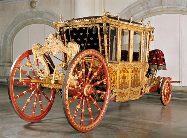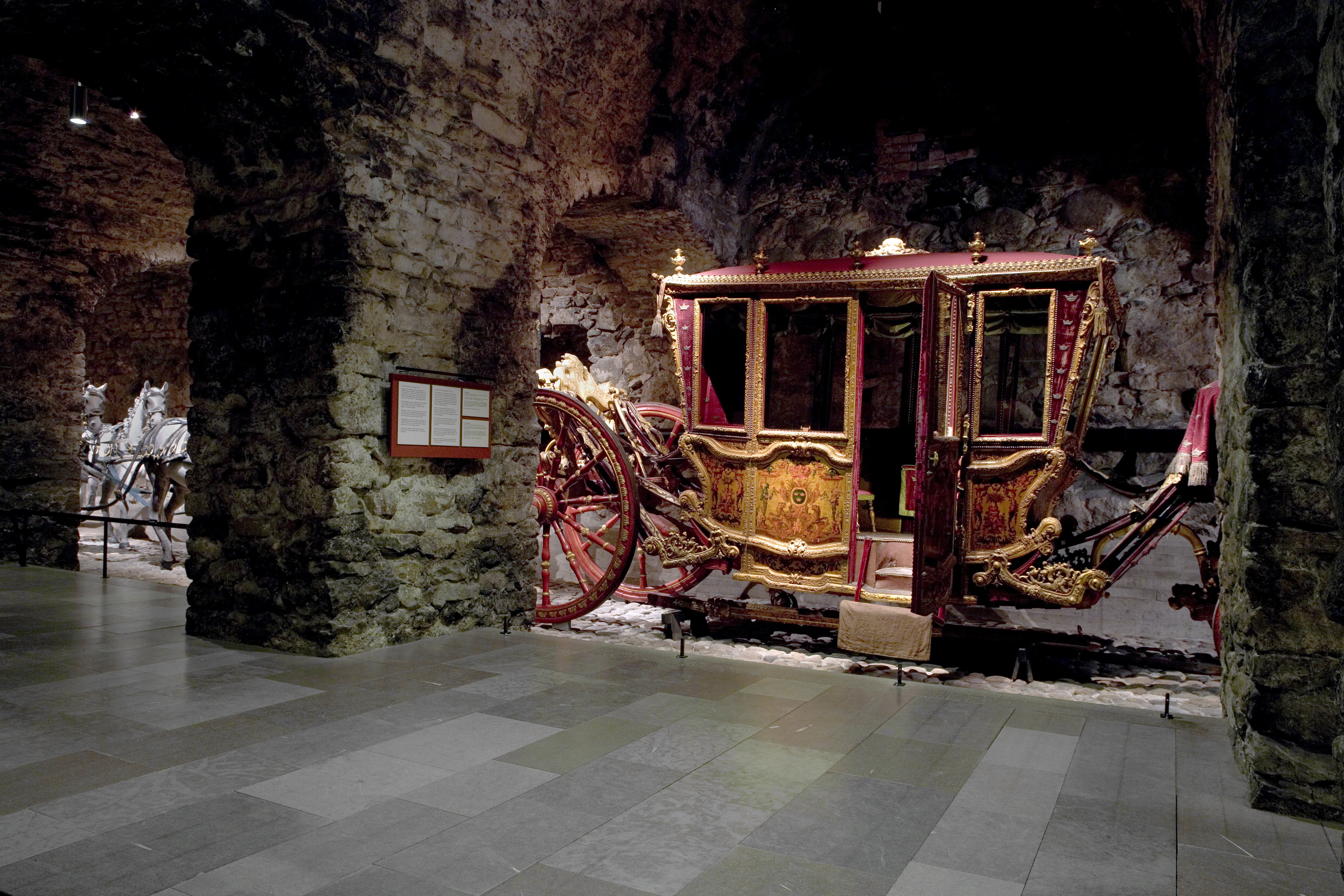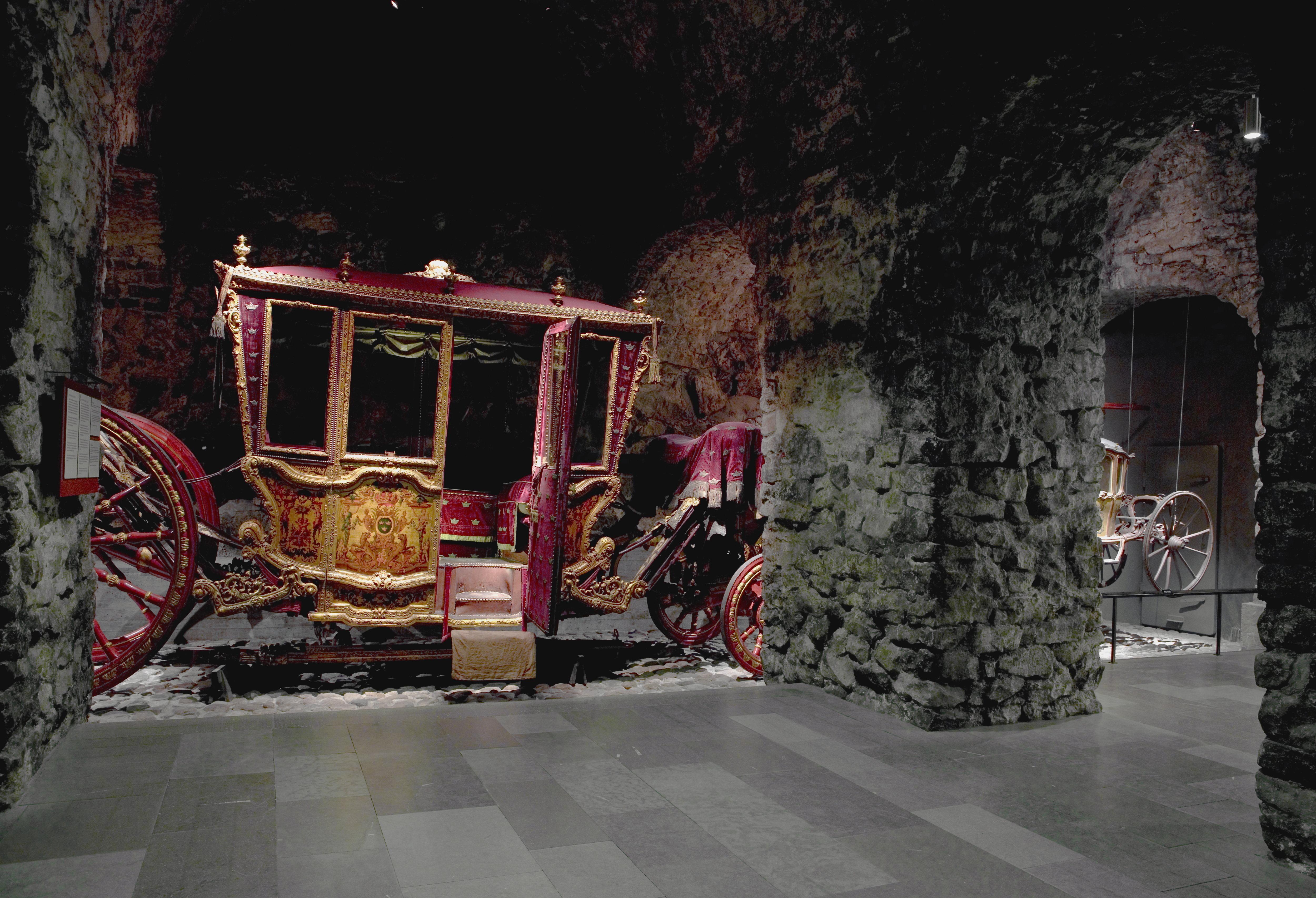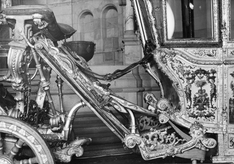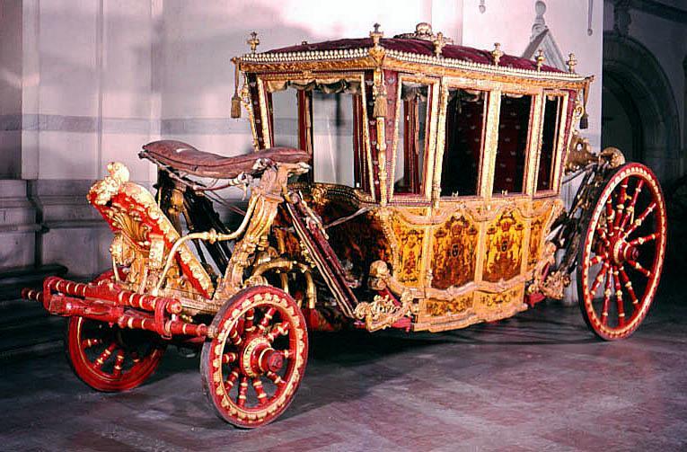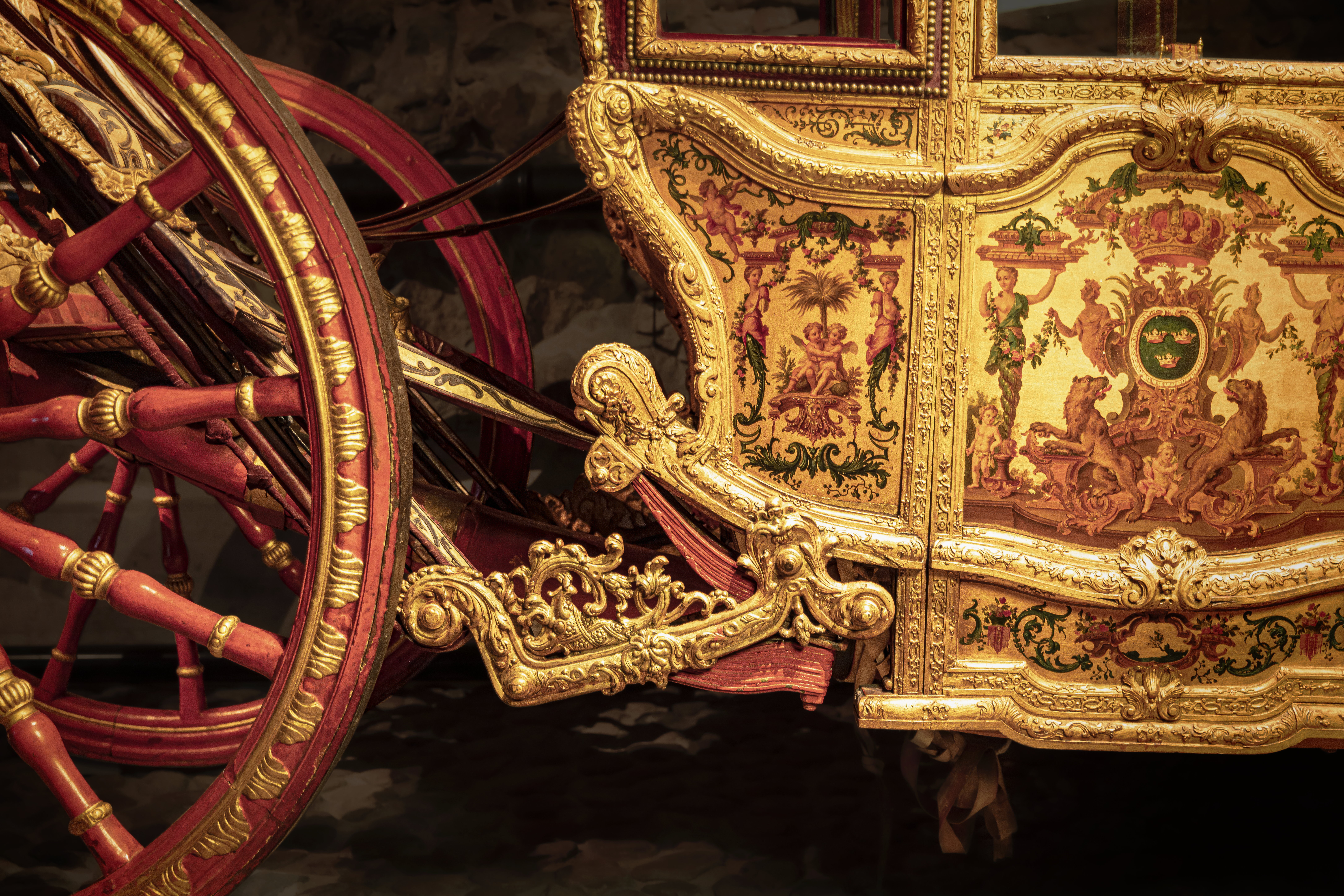Sluten, åttasidig vagnskorg, kur, med trapetsoida sidor och nio slipade kristallfönsterglas. Horisontalt bukiga fyllningar i fram- och bakväggarna. Lågt välvd imperial klädd med röd sammet och strödda guld- och silverbroderade öppna kronor. Tre rader, "knappar" tennlickor, av mässing runt takkanten och tio brännförgyllda mässingsvaser. Krön av snidat och förgyllt trä, i form av oval platta och knoppformig förhöjning med bladornament (nr 17613). Snidad kornisch, ramverk och hörnposter med bladornament. Bakspegeln med infälld snidad ram, klädd med röd sammet och broderade kronor, små mässingstennlickor runt kanterna. Dito klädsel på långväggarnas sidopartier. Lakejband med två tofsar vid bakre kornischen. En tofs med band i vardera imperialens hörn. Två dörrar med vridhandtag av mässing, avlånga med blomornament. Ett fast väggfält invid vardera dörren i korgens bakre hälft, har tillkommit vid vagnens förlänging 1773, och har utförts som kopior av dörrarna. Korgfyllningar med målningar på guldgrund med rankverk, palmer, putti och kvinnliga hermkaryatider ensamma och parvis omfamnande varandra. På fram- och bakväggarna, dörrarnas och väggfältens mitt finns krönta trekronorssköldar under vilka Amor sitter. På högra dörren är det ursprungliga vapnet, ätten Morvilles, framtaget. Två lejon som sköldhållare. Korgens klädsel invändigt av röd sammet, passpoaler av guldgalon, strödda öppna kronor broderade i guld och silver. Två sittdynor, framsätets med tvådelad kappa, guldgalon och strödda kronor. Baksätets dyna med kortare kappa mitt på ena långsidan, galon och kronor. Gardin feston av guldtyg draperad kring takkanten år 1818, en tofs i varje hörn. Vävda fönsterband och fyra handtag i två "lyckor" vardera, vävda i gult och rött. Mitt för vardera dörren är en uppfällbar pall klädd med sammet fästad, de har en galonkantad kappa med strödda kronor. Fotbottnen klädd med läder fäst med mässingstennlickor runt kanterna. I stigbrunnarna mindre fotsteg som vikas utåt ett stycke, sannolikt ditsatta vid ombyggnaden 1773. Korgen hänger i fyra hängremmar med ciselerade mässingsspännen och ovanför dem trampstöd. Åtta mindre stöt- och svängremmar. Remmarnas klädsel av vitt läder med röda kanter, gröna applikationer påsydda. Fjädring à la Dalême, fyra stora genombrutna fjäderbeslag av mässing. Undervagnen helt skulpterad, förgylld och rödmålad. Framvagn med kuskbock, vändkrans, kuskbocksbräda med maskaron framtill, förvåg svänglar. Två kraftiga svanhalsar av stål, förgyllda och profilerade. Små framhjul med tio iskruvade ekrar, fem lötar med bladornament, lötband (hjulskenor) i sektioner med bultar i ändarna. På vänstra framhjulets lötband inslaget ett krönt E, Larsbo och Saxhammars järnbruks stämpel. Kuskbocksdyna, kuskbockskappa av röd sammet med strödda kronor, frans nedtill. Bakkarmens stolpar och tvärbåge i en sammanhållen form dekorerad med akantusrankor. Liten lakejbräda med maskaron. På axelträet mellan bomändarna en maskaron. Bakhjulen med 12 ekrar, sex lötar och hjulskenor i sektioner med bultar. Tillbehör: Tistelstång med lejonhuvud och mångkantigt parti vid lageränden, målad i rött och guld. Lös förvåg och svänglar till spann.