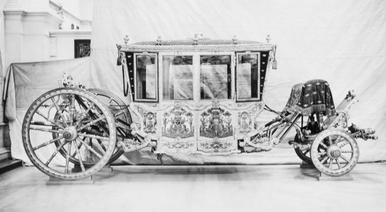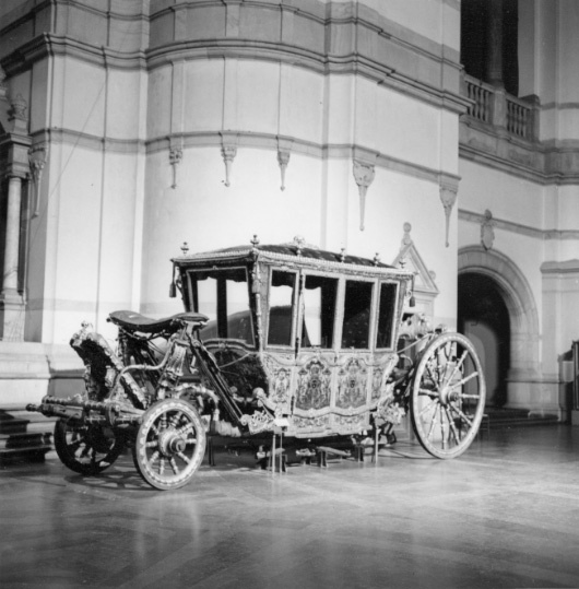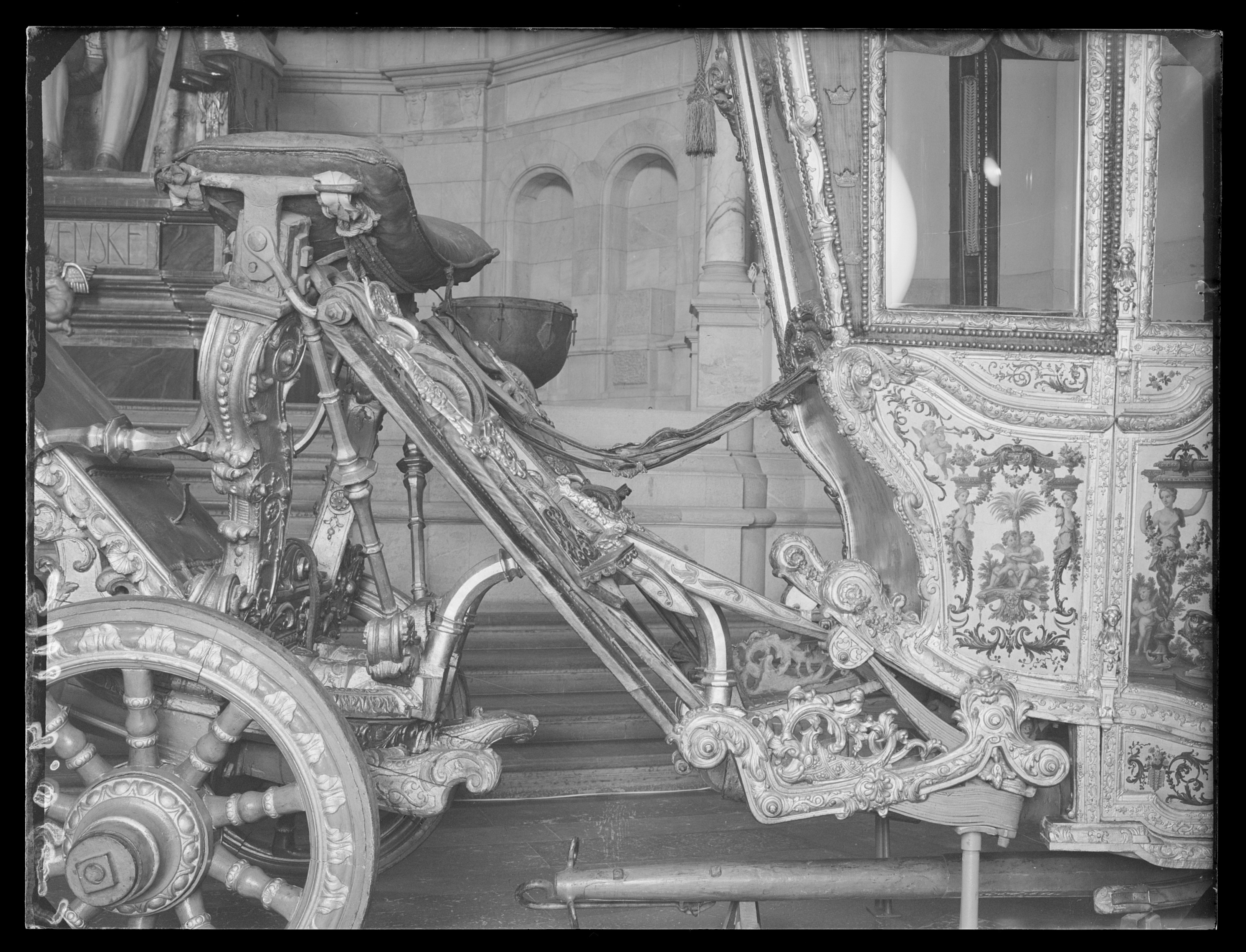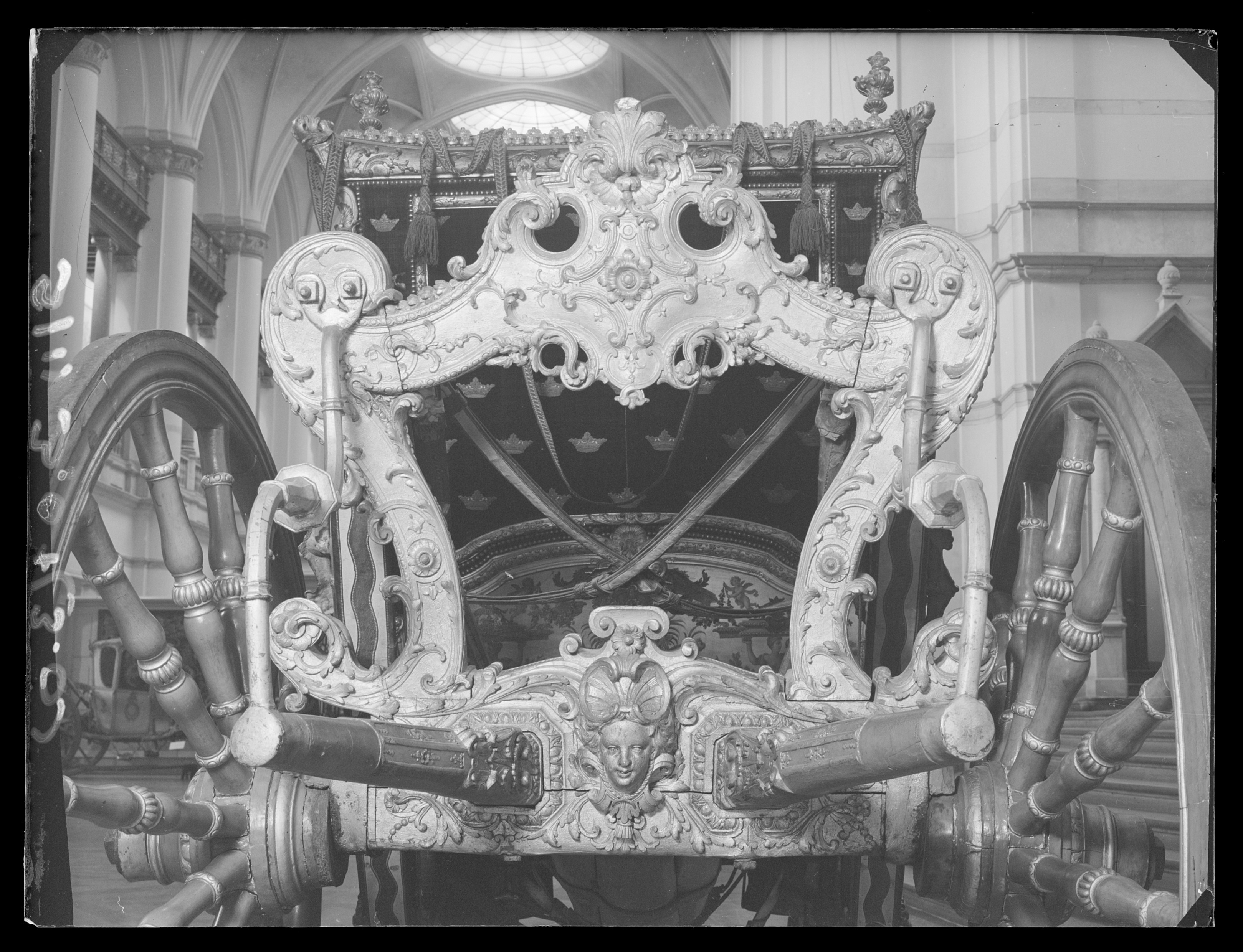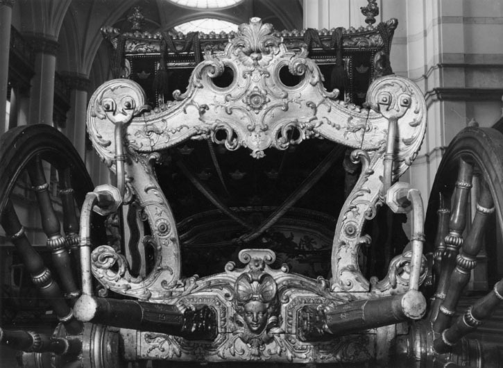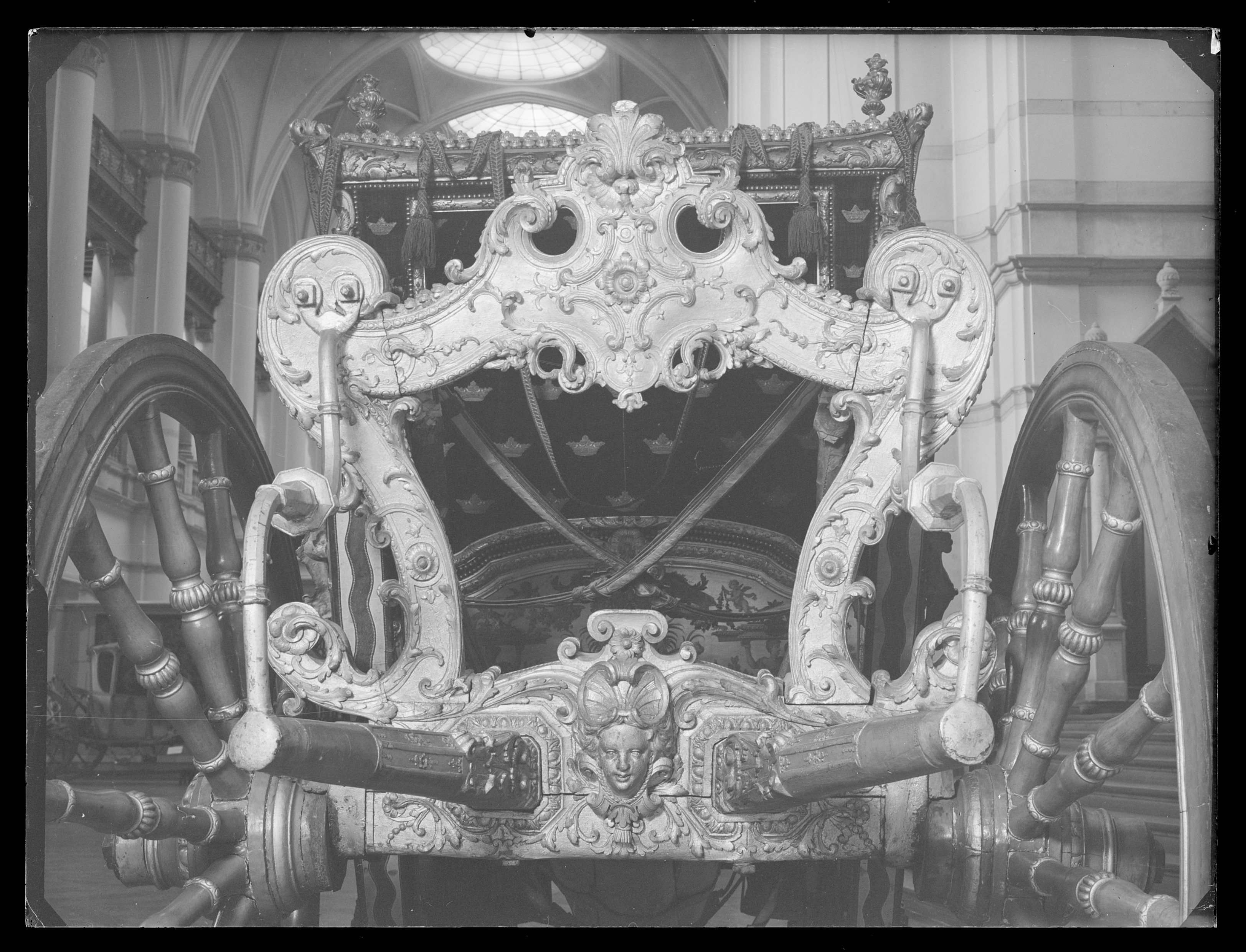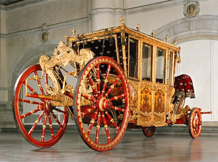 Sluten, åttasidig vagnskorg, kur, med trapetsoida sidor och nio slipade kristallfönsterglas. Horisontalt bukiga fyllningar i fram- och bakväggarna. Lågt välvd imperial klädd med röd sammet och strödda guld- och silverbroderade öppna kronor. Tre rader, "knappar" tennlickor, av mässing runt takkanten och tio brännförgyllda mässingsvaser. Krön av snidat och förgyllt trä, i form av oval platta och knoppformig förhöjning med bladornament (nr 17613). Snidad kornisch, ramverk och hörnposter med bladornament. Bakspegeln med infälld snidad ram, klädd med röd sammet och broderade kronor, små mässingstennlickor runt kanterna. Dito klädsel på långväggarnas sidopartier. Lakejband med två tofsar vid bakre kornischen. En tofs med band i vardera imperialens hörn. Två dörrar med vridhandtag av mässing, avlånga med blomornament. Ett fast väggfält invid vardera dörren i korgens bakre hälft, har tillkommit vid vagnens förlänging 1773, och har utförts som kopior av dörrarna. Korgfyllningar med målningar på guldgrund med rankverk, palmer, putti och kvinnliga hermkaryatider ensamma och parvis omfamnande varandra. På fram- och bakväggarna, dörrarnas och väggfältens mitt finns krönta trekronorssköldar under vilka Amor sitter. På högra dörren är det ursprungliga vapnet, ätten Morvilles, framtaget. Två lejon som sköldhållare. Korgens klädsel invändigt av röd sammet, passpoaler av guldgalon, strödda öppna kronor broderade i guld och silver. Två sittdynor, framsätets med tvådelad kappa, guldgalon och strödda kronor. Baksätets dyna med kortare kappa mitt på ena långsidan, galon och kronor. Gardin feston av guldtyg draperad kring takkanten år 1818, en tofs i varje hörn. Vävda fönsterband och fyra handtag i två "lyckor" vardera, vävda i gult och rött. Mitt för vardera dörren är en uppfällbar pall klädd med sammet fästad, de har en galonkantad kappa med strödda kronor. Fotbottnen klädd med läder fäst med mässingstennlickor runt kanterna. I stigbrunnarna mindre fotsteg som vikas utåt ett stycke, sannolikt ditsatta vid ombyggnaden 1773. Korgen hänger i fyra hängremmar med ciselerade mässingsspännen och ovanför dem trampstöd. Åtta mindre stöt- och svängremmar. Remmarnas klädsel av vitt läder med röda kanter, gröna applikationer påsydda. Fjädring à la Dalême, fyra stora genombrutna fjäderbeslag av mässing. Undervagnen helt skulpterad, förgylld och rödmålad. Framvagn med kuskbock, vändkrans, kuskbocksbräda med maskaron framtill, förvåg svänglar. Två kraftiga svanhalsar av stål, förgyllda och profilerade. Små framhjul med tio iskruvade ekrar, fem lötar med bladornament, lötband (hjulskenor) i sektioner med bultar i ändarna. På vänstra framhjulets lötband inslaget ett krönt E, Larsbo och Saxhammars järnbruks stämpel. Kuskbocksdyna, kuskbockskappa av röd sammet med strödda kronor, frans nedtill. Bakkarmens stolpar och tvärbåge i en sammanhållen form dekorerad med akantusrankor. Liten lakejbräda med maskaron. På axelträet mellan bomändarna en maskaron. Bakhjulen med 12 ekrar, sex lötar och hjulskenor i sektioner med bultar. Tillbehör: Tistelstång med lejonhuvud och mångkantigt parti vid lageränden, målad i rött och guld. Lös förvåg och svänglar till spann.