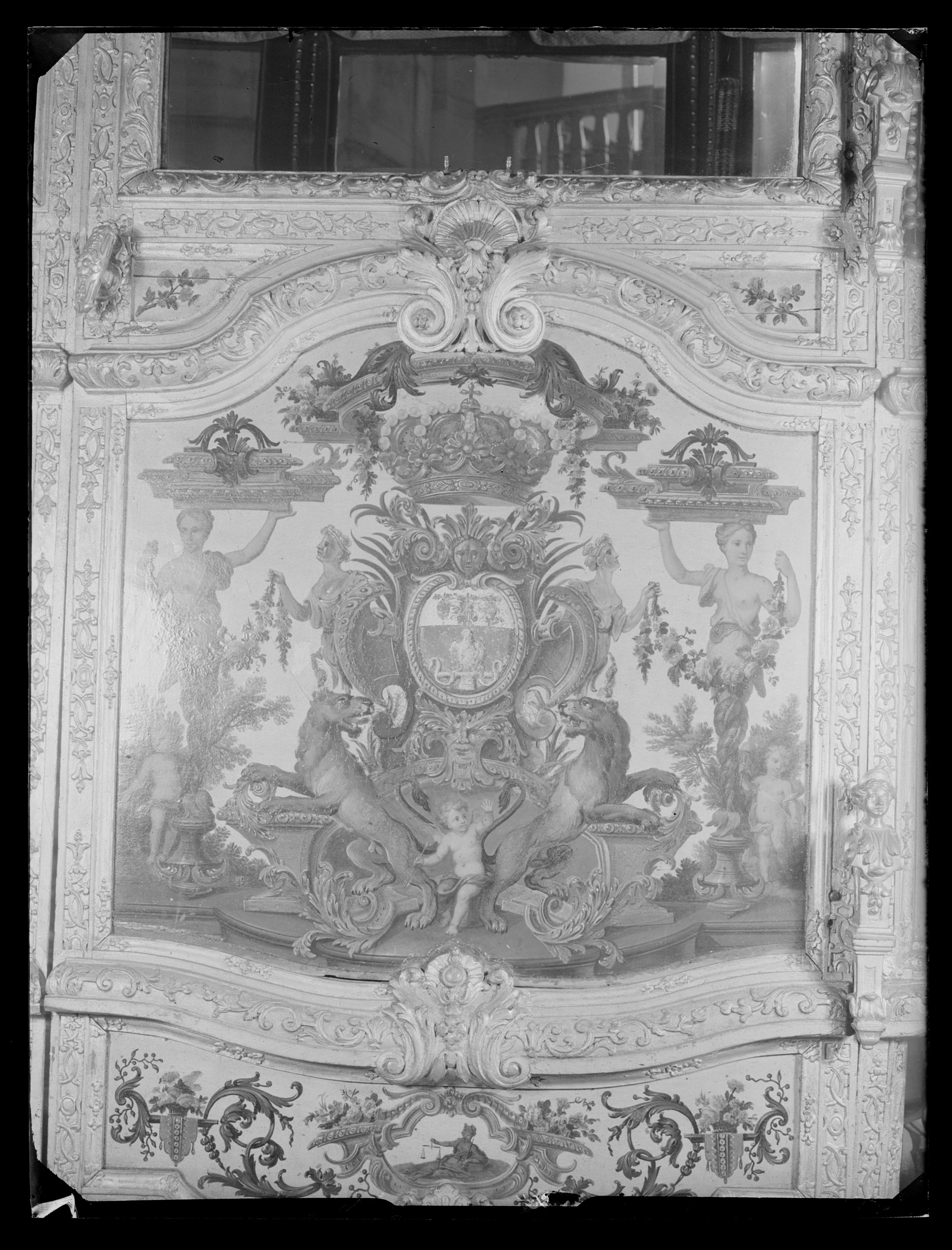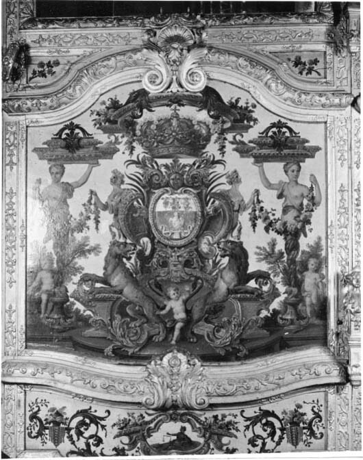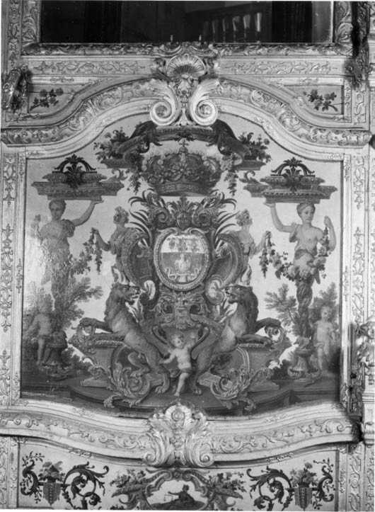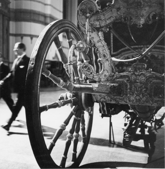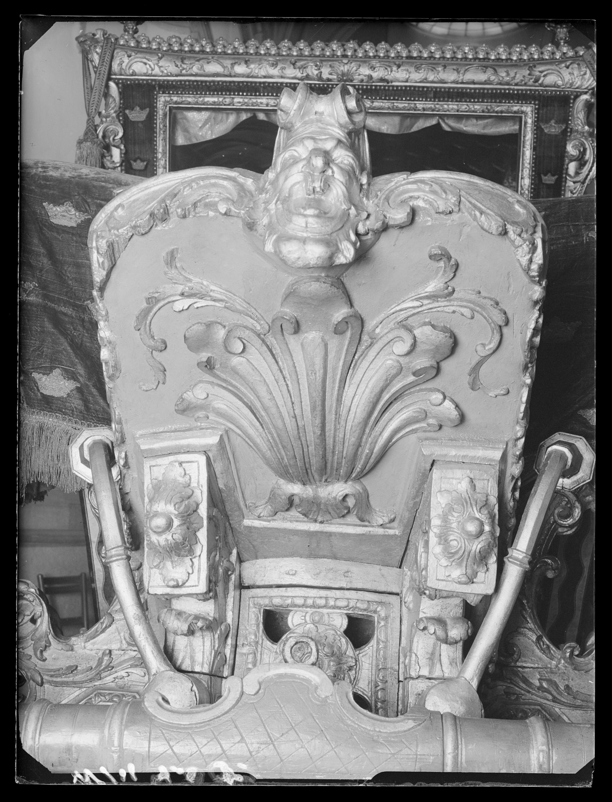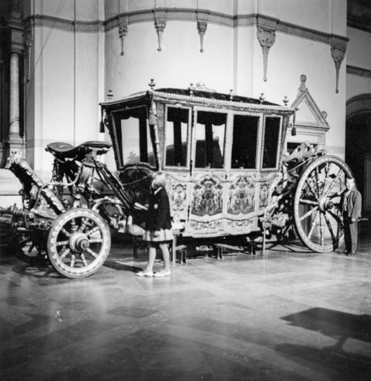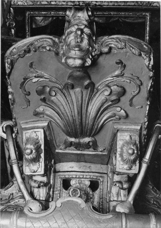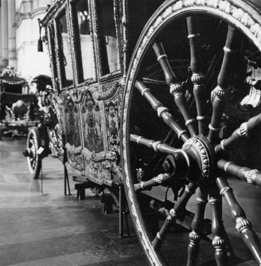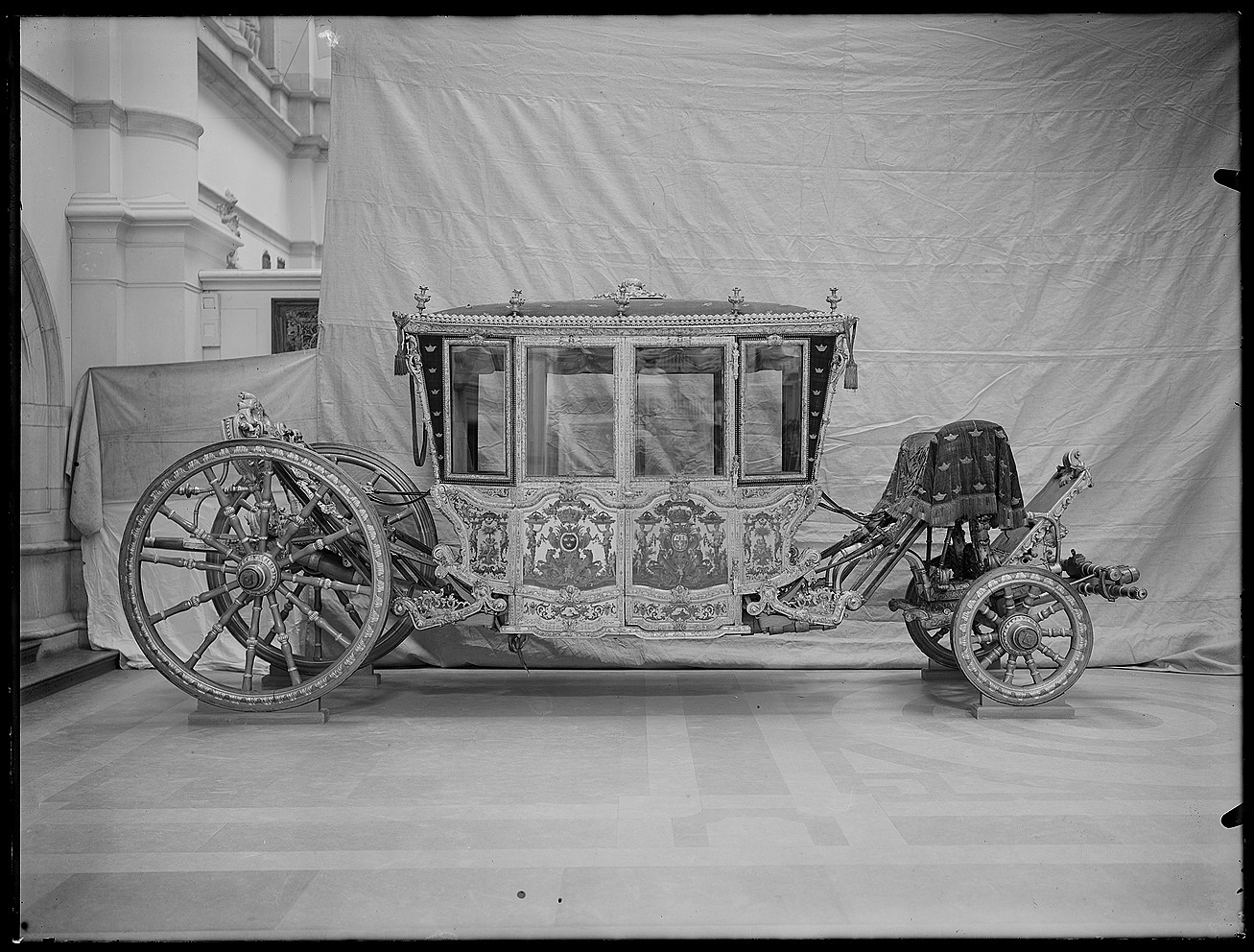 Sluten, åttasidig vagnskorg, kur, med trapetsoida sidor och nio slipade kristallfönsterglas. Horisontalt bukiga fyllningar i fram- och bakväggarna. Lågt välvd imperial klädd med röd sammet och strödda guld- och silverbroderade öppna kronor. Tre rader, "knappar" tennlickor, av mässing runt takkanten och tio brännförgyllda mässingsvaser. Krön av snidat och förgyllt trä, i form av oval platta och knoppformig förhöjning med bladornament (nr 17613). Snidad kornisch, ramverk och hörnposter med bladornament. Bakspegeln med infälld snidad ram, klädd med röd sammet och broderade kronor, små mässingstennlickor runt kanterna. Dito klädsel på långväggarnas sidopartier. Lakejband med två tofsar vid bakre kornischen. En tofs med band i vardera imperialens hörn. Två dörrar med vridhandtag av mässing, avlånga med blomornament. Ett fast väggfält invid vardera dörren i korgens bakre hälft, har tillkommit vid vagnens förlänging 1773, och har utförts som kopior av dörrarna. Korgfyllningar med målningar på guldgrund med rankverk, palmer, putti och kvinnliga hermkaryatider ensamma och parvis omfamnande varandra. På fram- och bakväggarna, dörrarnas och väggfältens mitt finns krönta trekronorssköldar under vilka Amor sitter. På högra dörren är det ursprungliga vapnet, ätten Morvilles, framtaget. Två lejon som sköldhållare. Korgens klädsel invändigt av röd sammet, passpoaler av guldgalon, strödda öppna kronor broderade i guld och silver. Två sittdynor, framsätets med tvådelad kappa, guldgalon och strödda kronor. Baksätets dyna med kortare kappa mitt på ena långsidan, galon och kronor. Gardin feston av guldtyg draperad kring takkanten år 1818, en tofs i varje hörn. Vävda fönsterband och fyra handtag i två "lyckor" vardera, vävda i gult och rött. Mitt för vardera dörren är en uppfällbar pall klädd med sammet fästad, de har en galonkantad kappa med strödda kronor. Fotbottnen klädd med läder fäst med mässingstennlickor runt kanterna. I stigbrunnarna mindre fotsteg som vikas utåt ett stycke, sannolikt ditsatta vid ombyggnaden 1773. Korgen hänger i fyra hängremmar med ciselerade mässingsspännen och ovanför dem trampstöd. Åtta mindre stöt- och svängremmar. Remmarnas klädsel av vitt läder med röda kanter, gröna applikationer påsydda. Fjädring à la Dalême, fyra stora genombrutna fjäderbeslag av mässing. Undervagnen helt skulpterad, förgylld och rödmålad. Framvagn med kuskbock, vändkrans, kuskbocksbräda med maskaron framtill, förvåg svänglar. Två kraftiga svanhalsar av stål, förgyllda och profilerade. Små framhjul med tio iskruvade ekrar, fem lötar med bladornament, lötband (hjulskenor) i sektioner med bultar i ändarna. På vänstra framhjulets lötband inslaget ett krönt E, Larsbo och Saxhammars järnbruks stämpel. Kuskbocksdyna, kuskbockskappa av röd sammet med strödda kronor, frans nedtill. Bakkarmens stolpar och tvärbåge i en sammanhållen form dekorerad med akantusrankor. Liten lakejbräda med maskaron. På axelträet mellan bomändarna en maskaron. Bakhjulen med 12 ekrar, sex lötar och hjulskenor i sektioner med bultar. Tillbehör: Tistelstång med lejonhuvud och mångkantigt parti vid lageränden, målad i rött och guld. Lös förvåg och svänglar till spann.