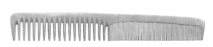KAM Av vitt ben. Avlång, med svagt bågformig tjock rygg och avtagande i bredd åt ena änden, den bredare med grova tänder (pinnar), den smalare med fina. Längd: 17,8 cm; bredd: 2,8 cm Inköpt av Wilhelmina von Hallwyl i början av 1900-talet. Framlagd i Lilla kapprummet till dagligt bruk.