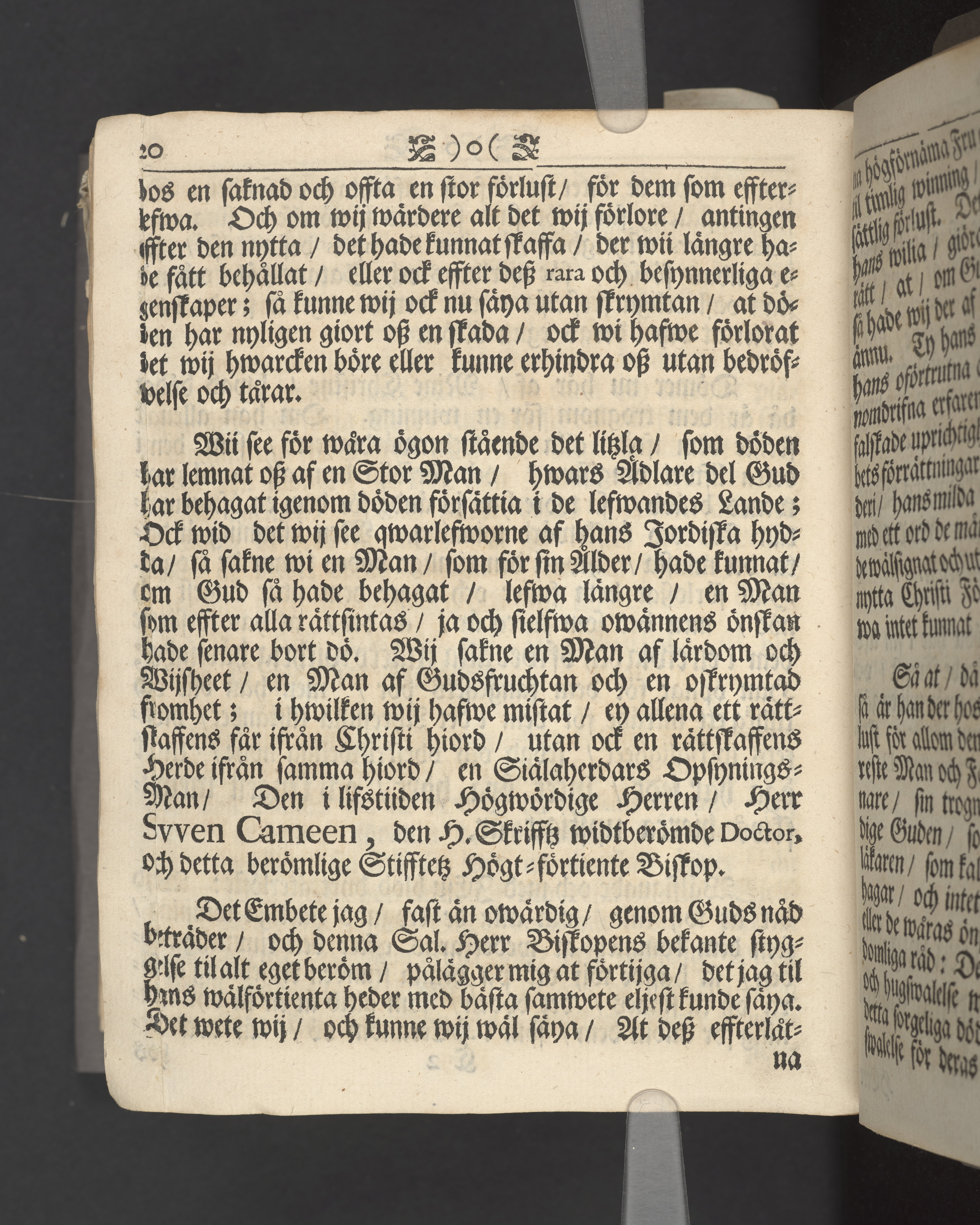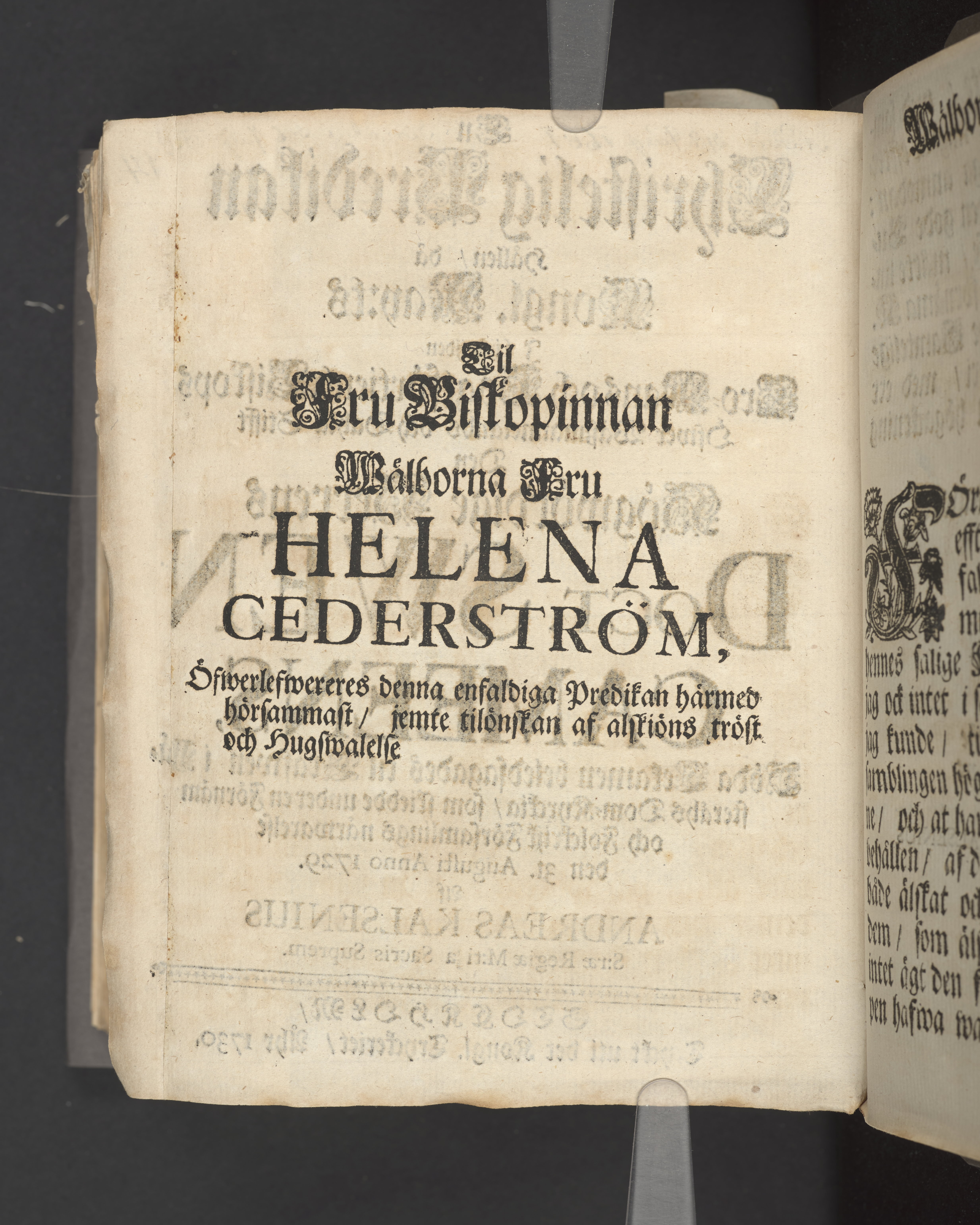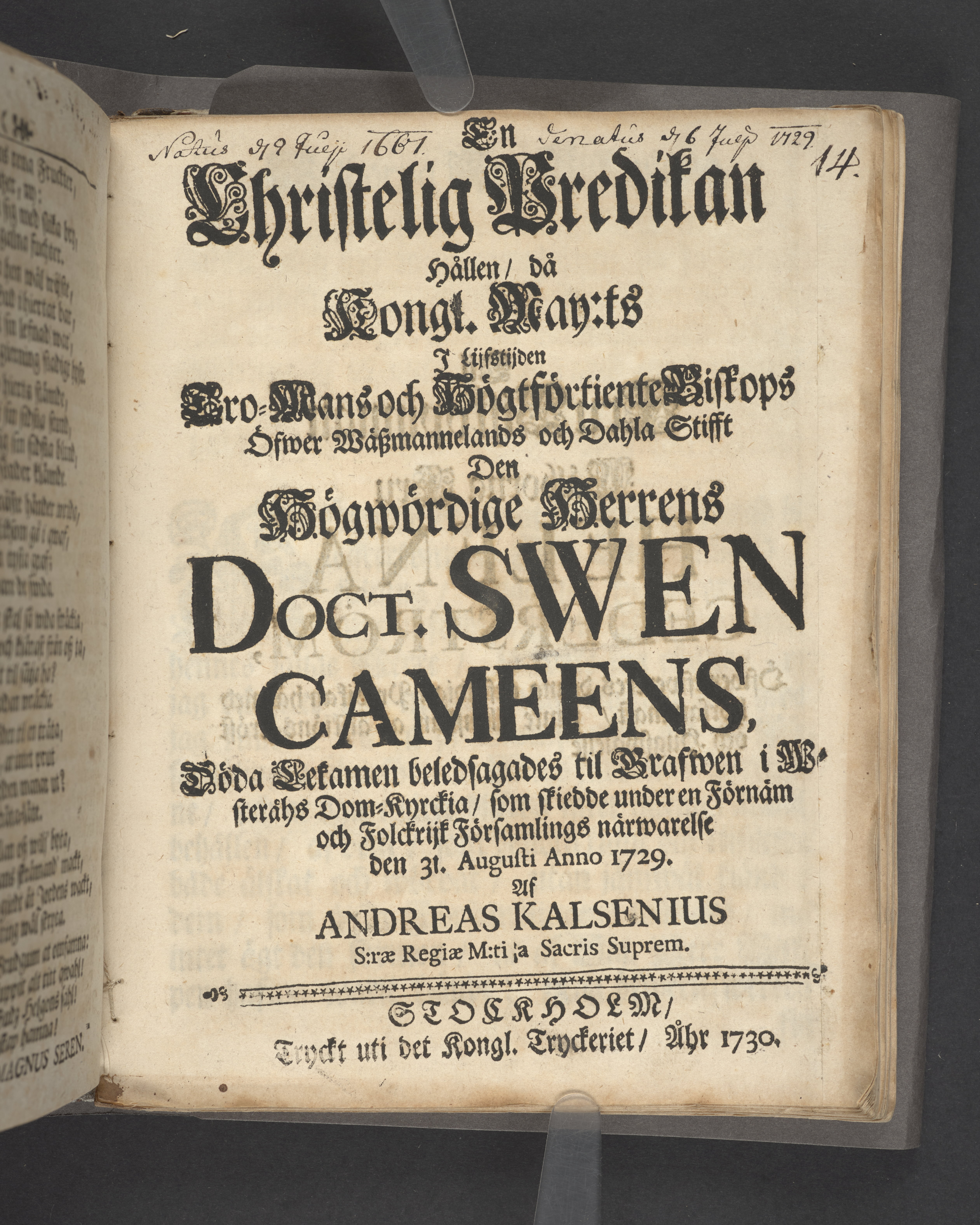 Christelig Predikan hållen/ då Kongl. May:ts i lijfstiden Tro-Mans och Högtförtiente Biskops Öfwer Wäßmannelands och Dahla Stifft Den Högwördige Herrens Doct. Swen Cameens, Döda Lekamen beledsagades til Grafwen i W-steråhs [sic] Dom-Kyrckia/ som skiedde under en Förnäm och Folckrijk Församlings närwarelse den 31. Augusti Anno 1729. Af Andreas Kalsenius S.rae regiae M:ti Sacris Suprem. Stockholm/ tryckt uti det Kongl. Treyckeriet/ Åhr 1730.